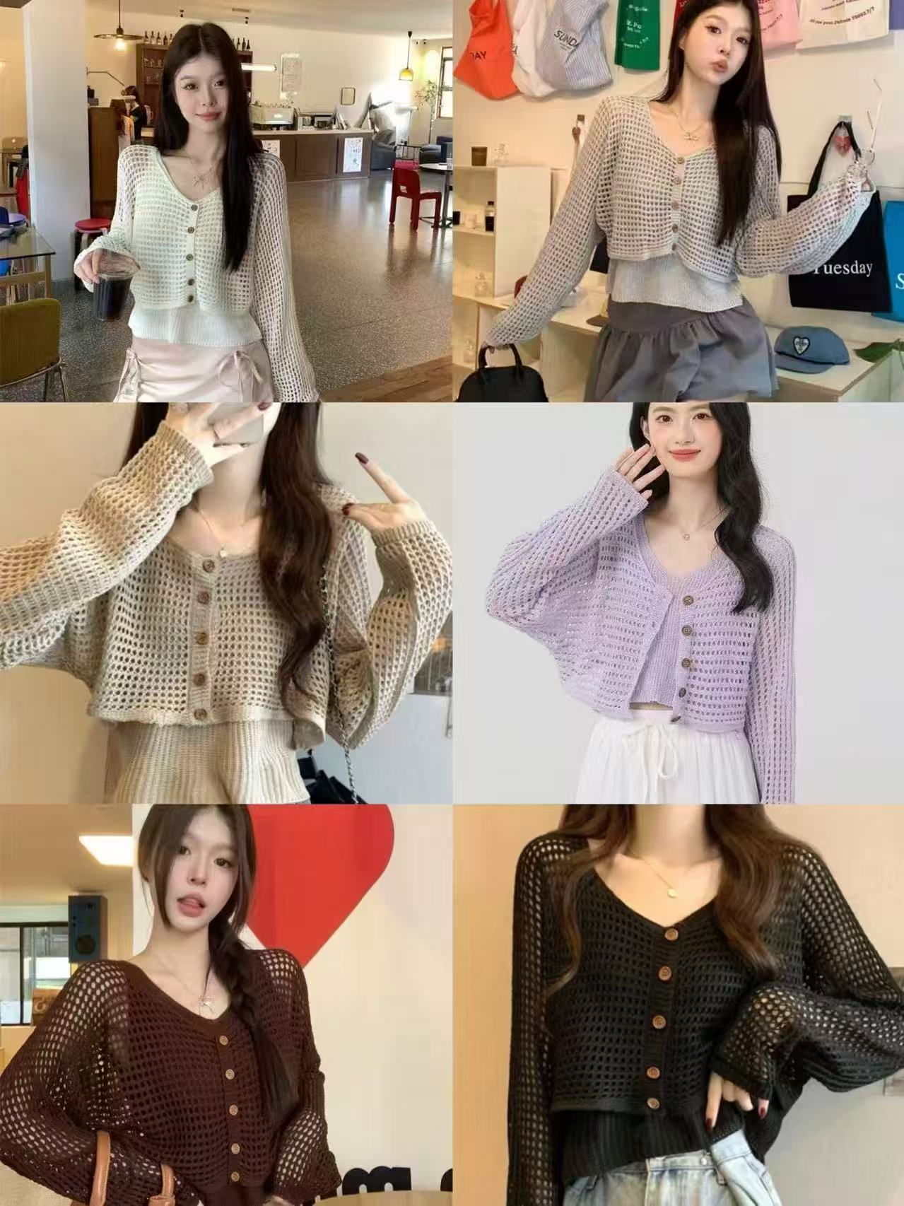 프랑스 스타일의 할로우 메쉬 선스크린 니트웨어 여성용 봄과 가을 느슨한 짧은 탑 카디건 슬링 투피스 세트스토어 가기