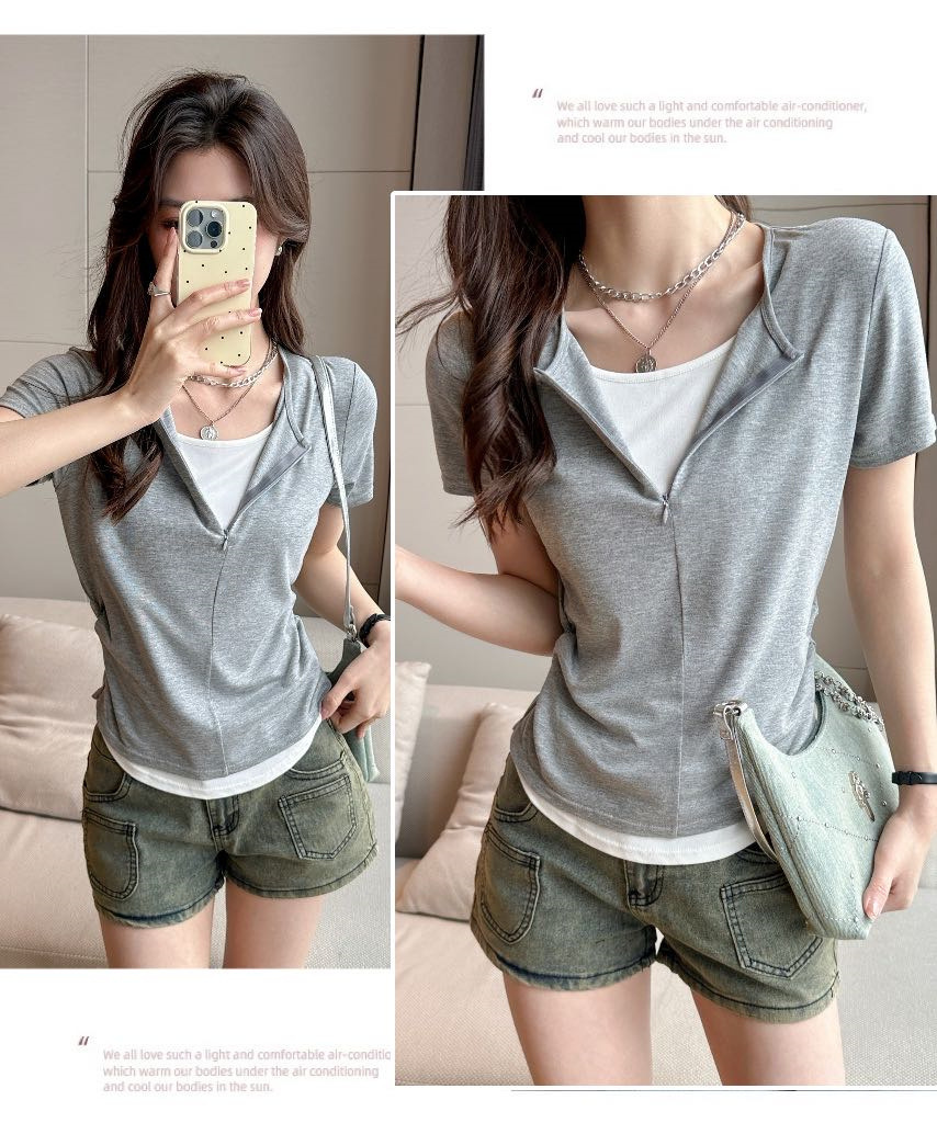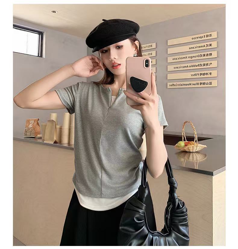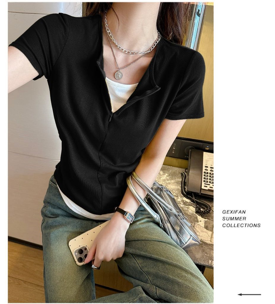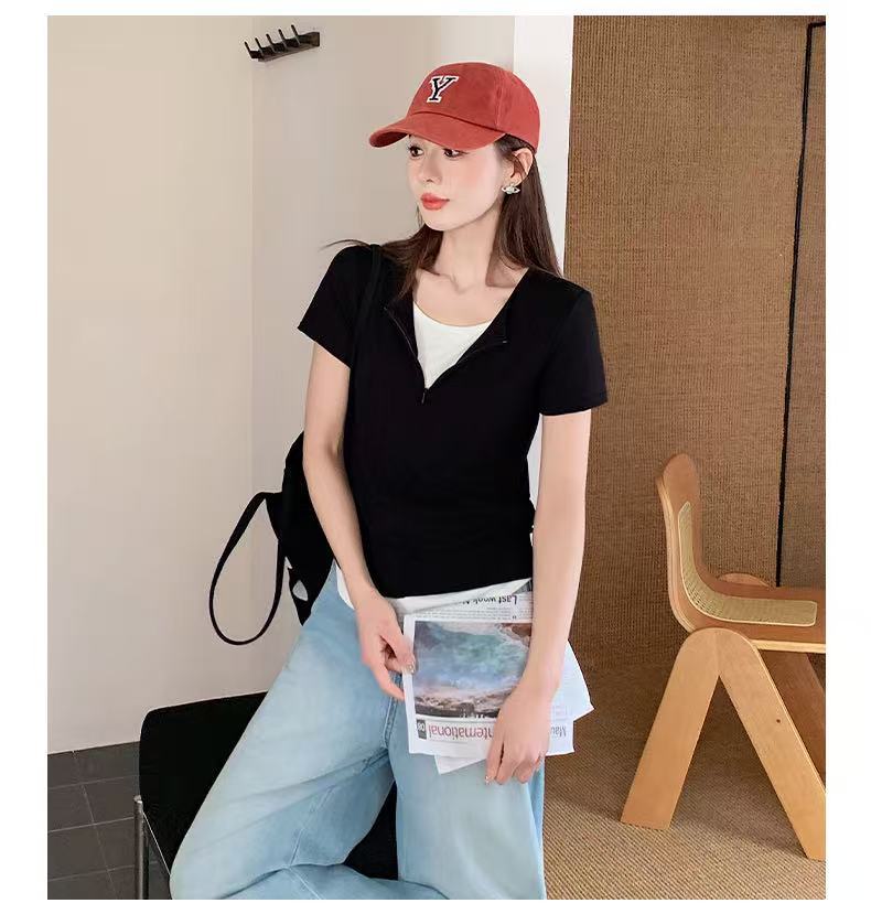 헝빈 타이 페이크 투피스 콘트라스트 컬러 하프 지퍼 편안한 통기성 올 매치 슬리밍 유행 디자인 센스 반팔 티셔츠