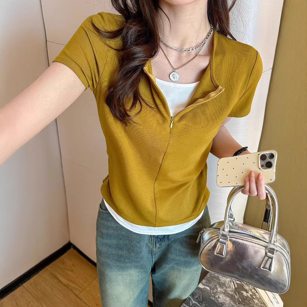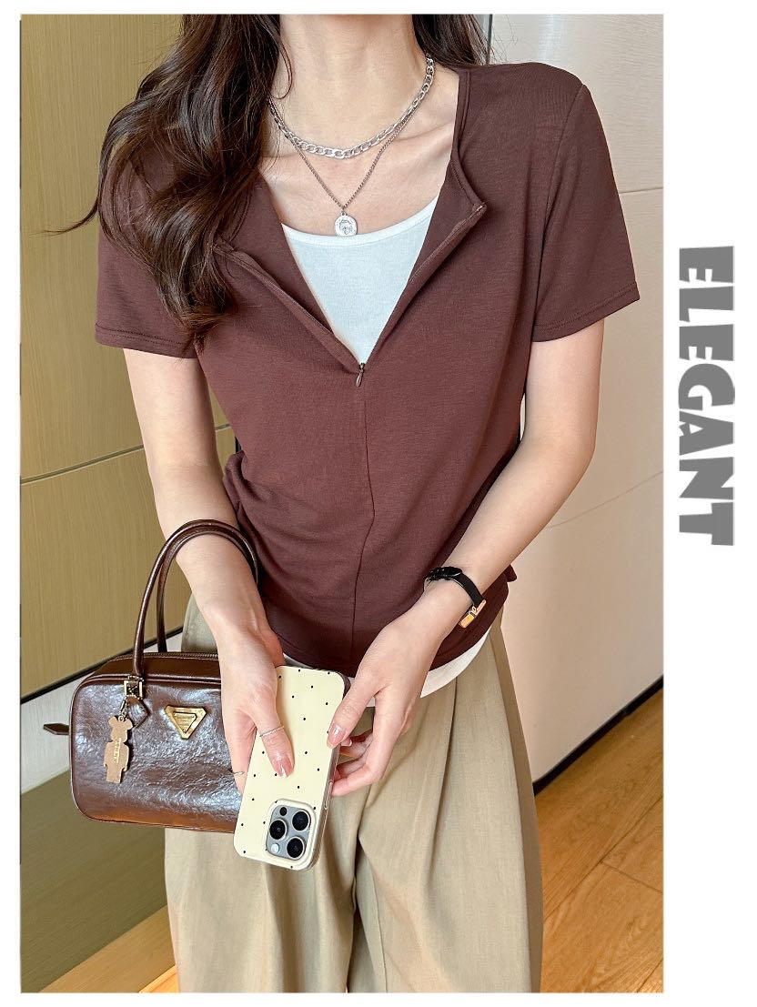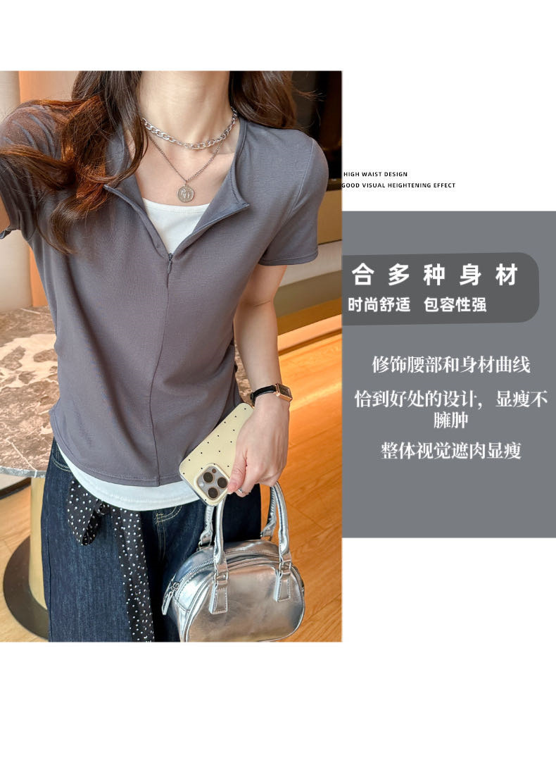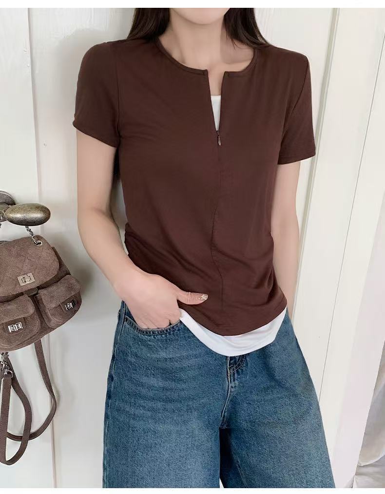 헝빈 타이 페이크 투피스 콘트라스트 컬러 하프 지퍼 편안한 통기성 올 매치 슬리밍 유행 디자인 센스 반팔 티셔츠