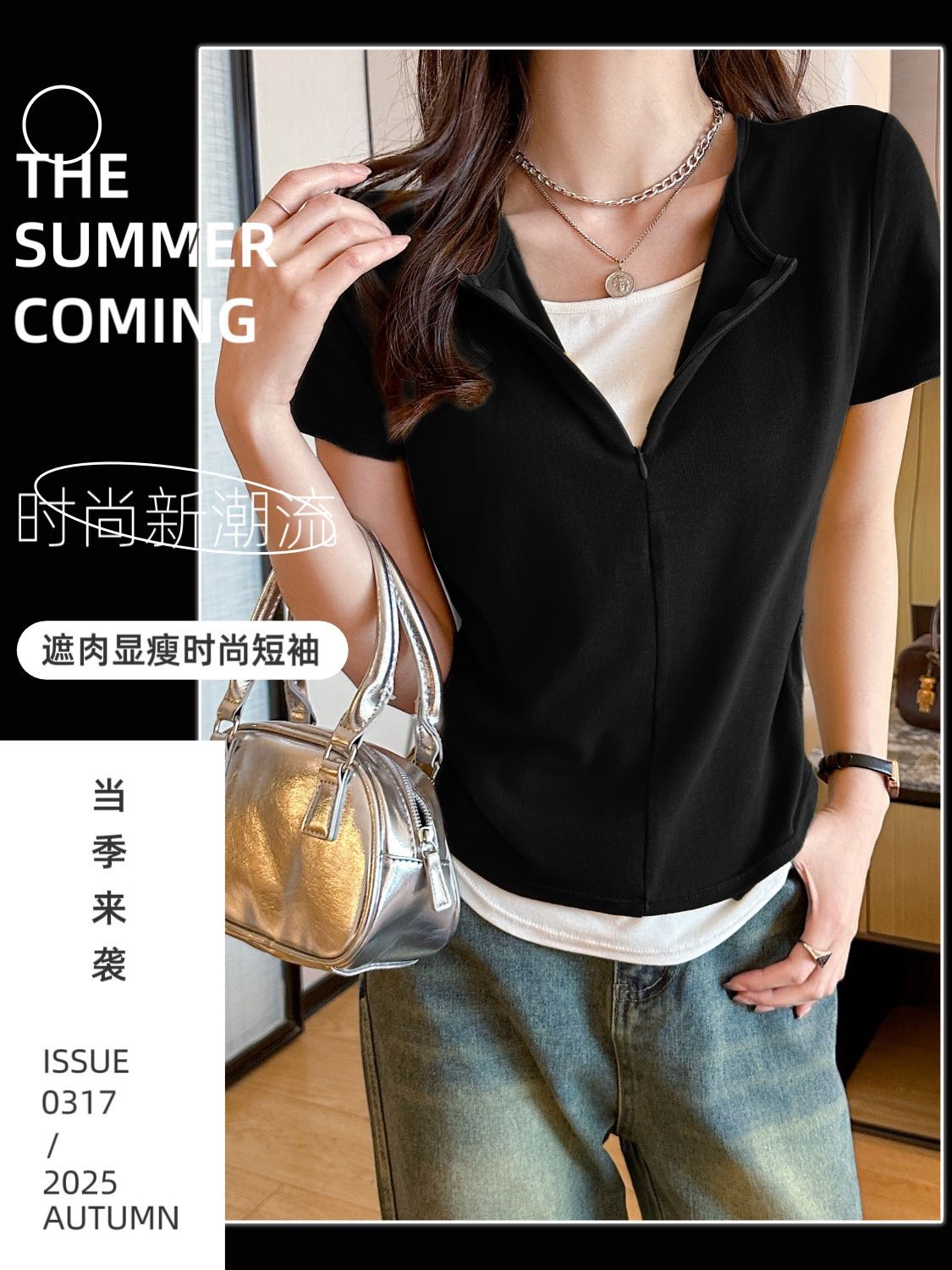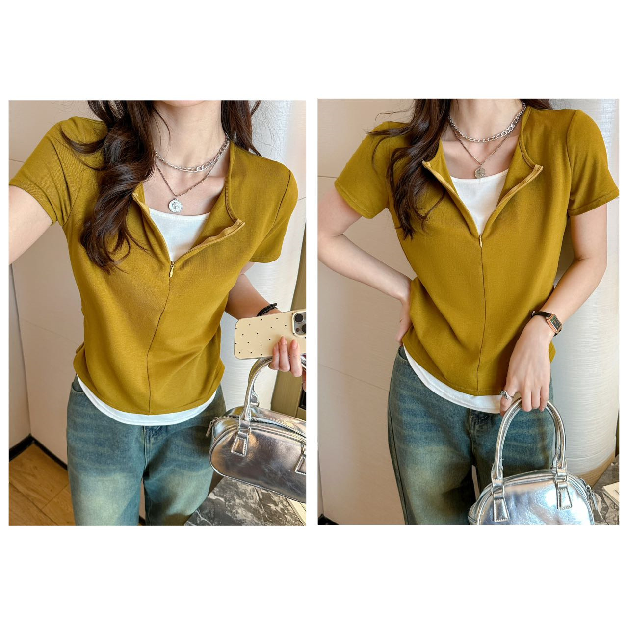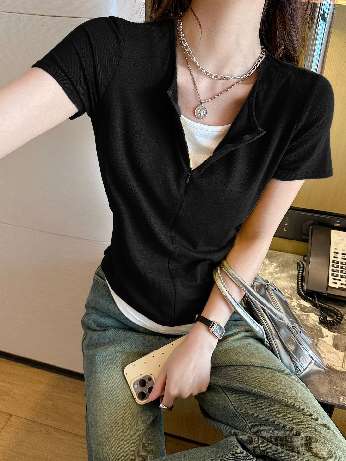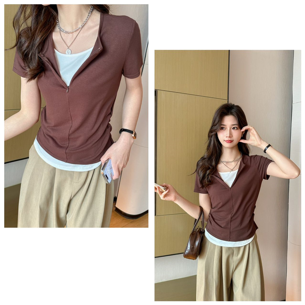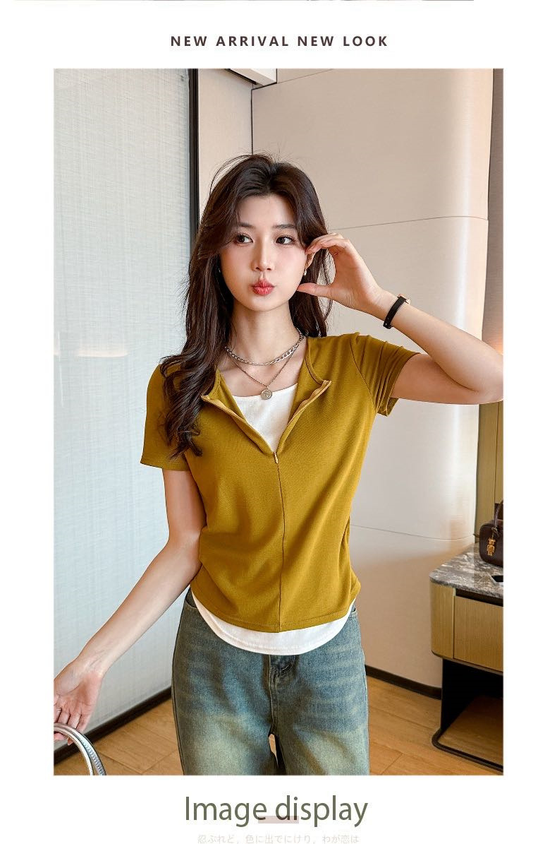 헝빈 타이 페이크 투피스 콘트라스트 컬러 하프 지퍼 편안한 통기성 올 매치 슬리밍 유행 디자인 센스 반팔 티셔츠스토어 가기
