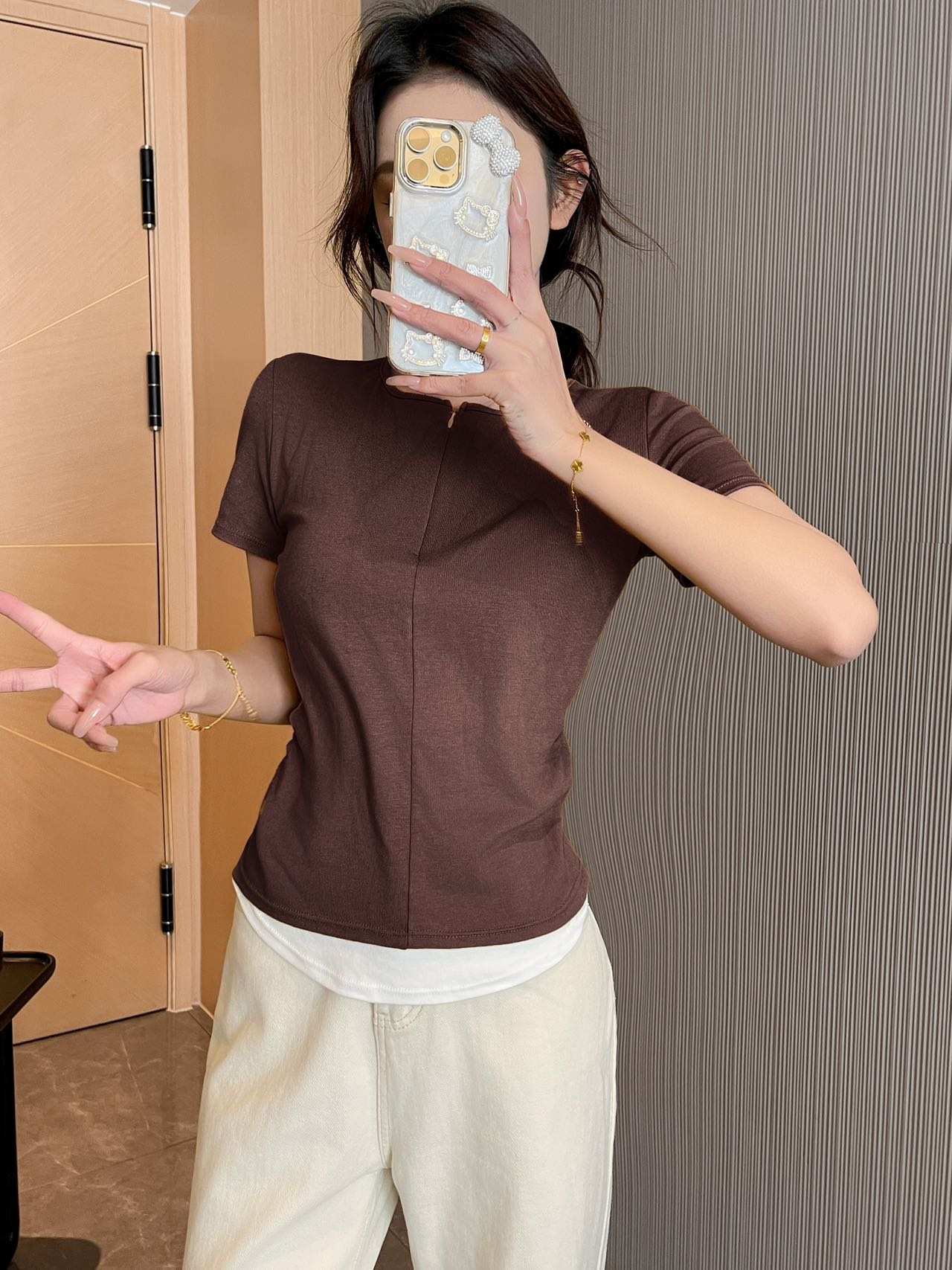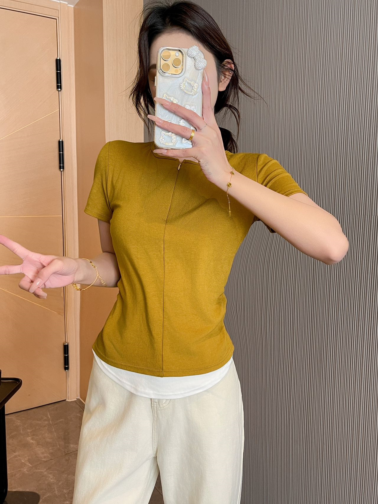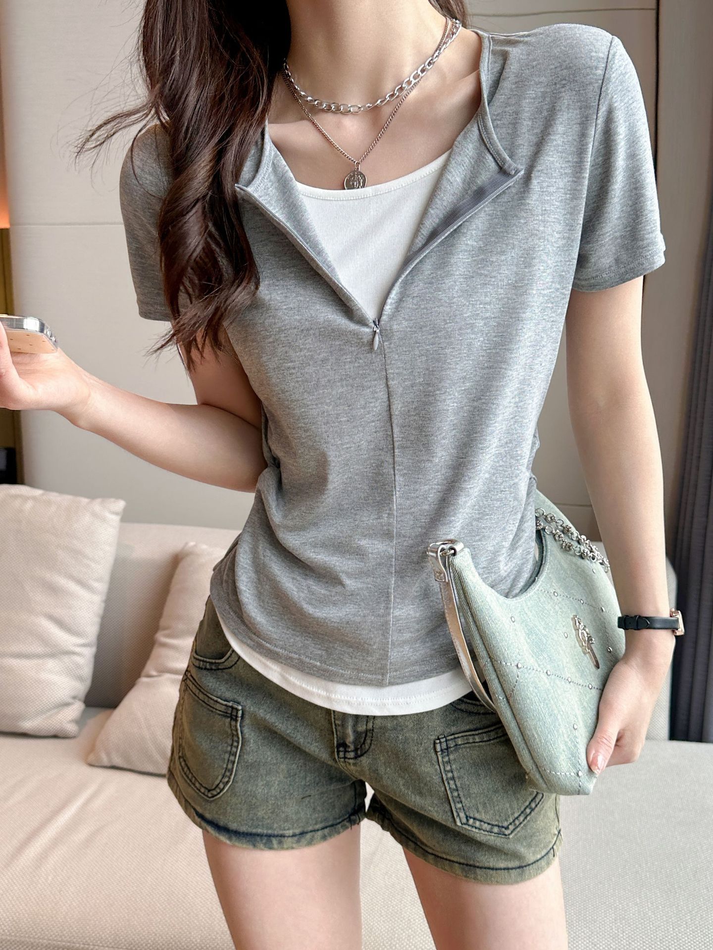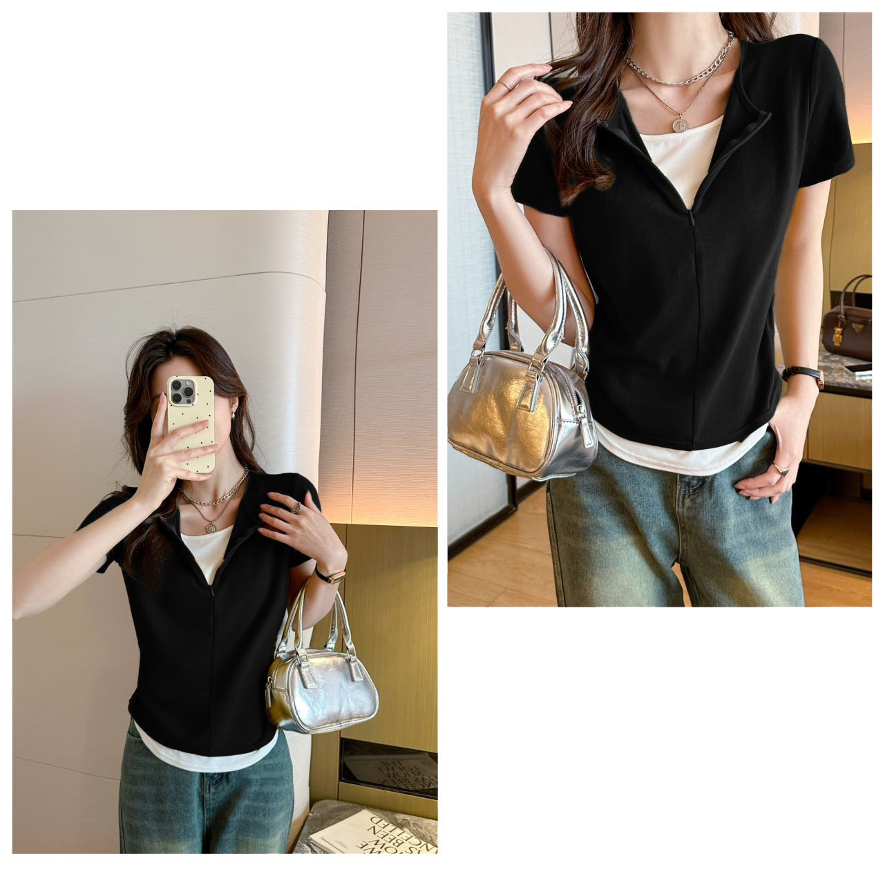 헝빈 타이 페이크 투피스 콘트라스트 컬러 하프 지퍼 편안한 통기성 올 매치 슬리밍 유행 디자인 센스 반팔 티셔츠스토어 가기