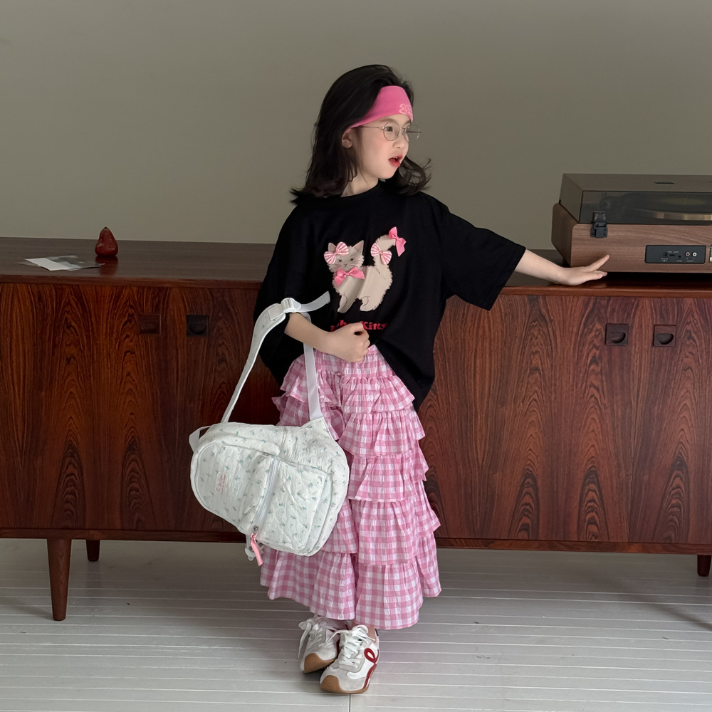 어린이 티셔츠 2025 여름 소녀 한국 고양이 프린트 짧은 소매 어린이 둥근 목 캐주얼 느슨한 활 탑