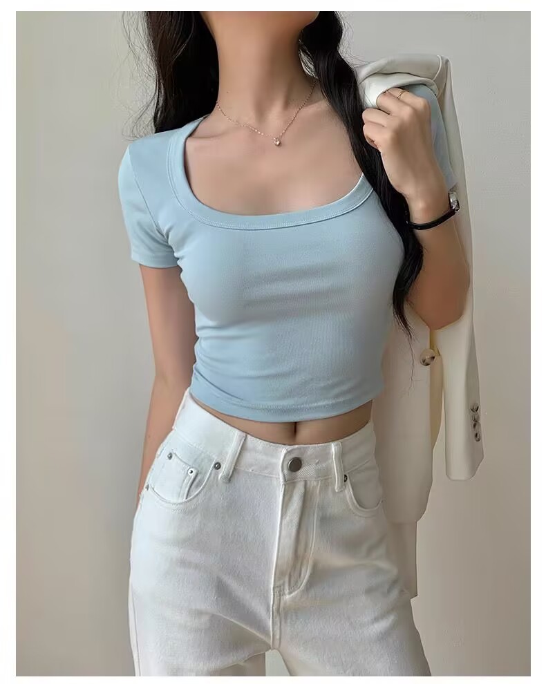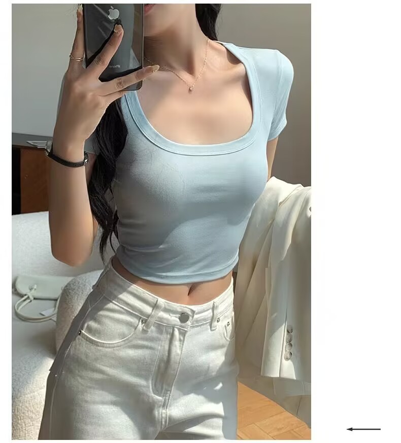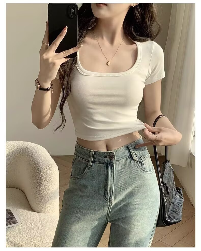 여름 달콤하고 매운 반팔 티셔츠 여성용 어깨 스퀘어 칼라 새로운 스타일 짧은 Umbilical U 칼라 화이트 유행 탑
