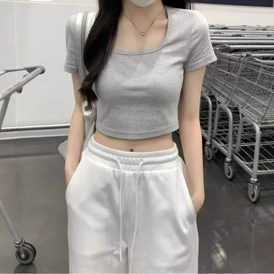 여름 달콤하고 매운 반팔 티셔츠 여성용 어깨 스퀘어 칼라 새로운 스타일 짧은 Umbilical U 칼라 화이트 유행 탑스토어 가기