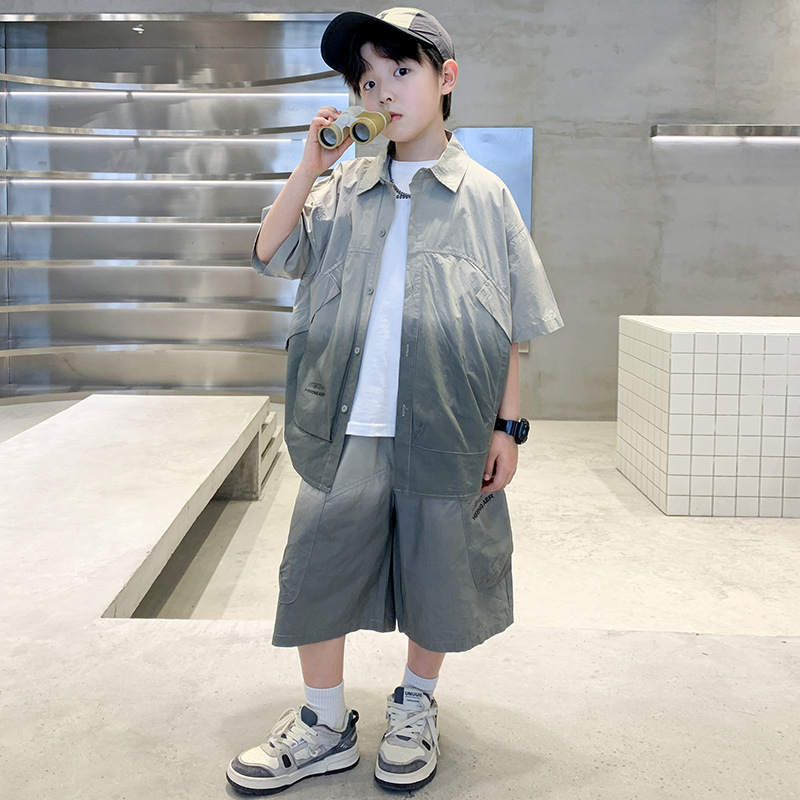 소년 여름 세트 러피 잘 생긴 여름 셔츠 짧은 소매 반바지 2025 새로운 큰 어린이 서양식 그라데이션 아동복
