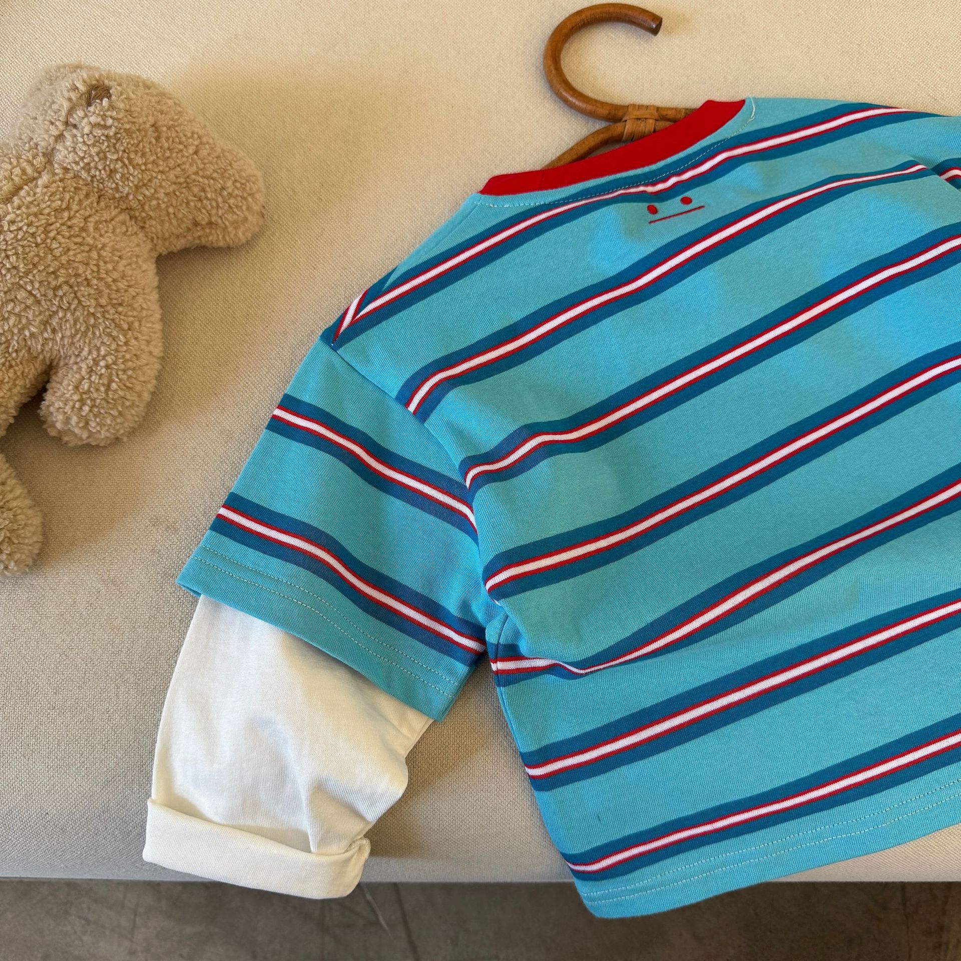 아동용 티셔츠 2025 가을 신상품 스트라이프 배색 자수 패셔너블 아동 상의 스타일리시한 아기 긴팔 티셔츠