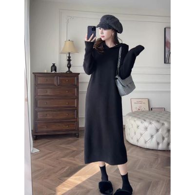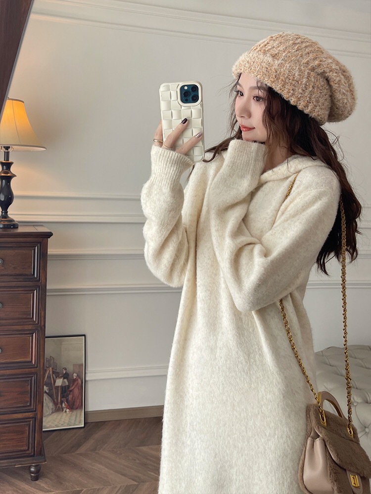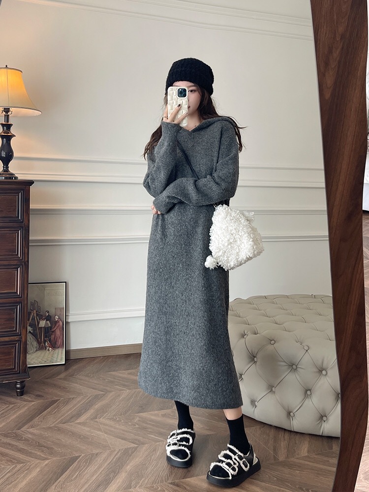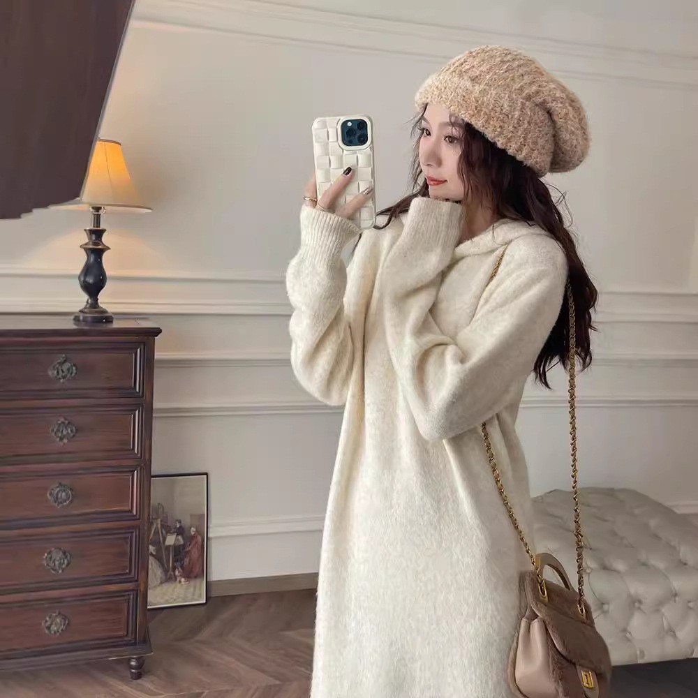 2025 새로운 가을, 겨울 새로운 한국 스타일 느슨한 슬리밍 무릎 길이 긴 바닥 후드 게으른 니트 드레스