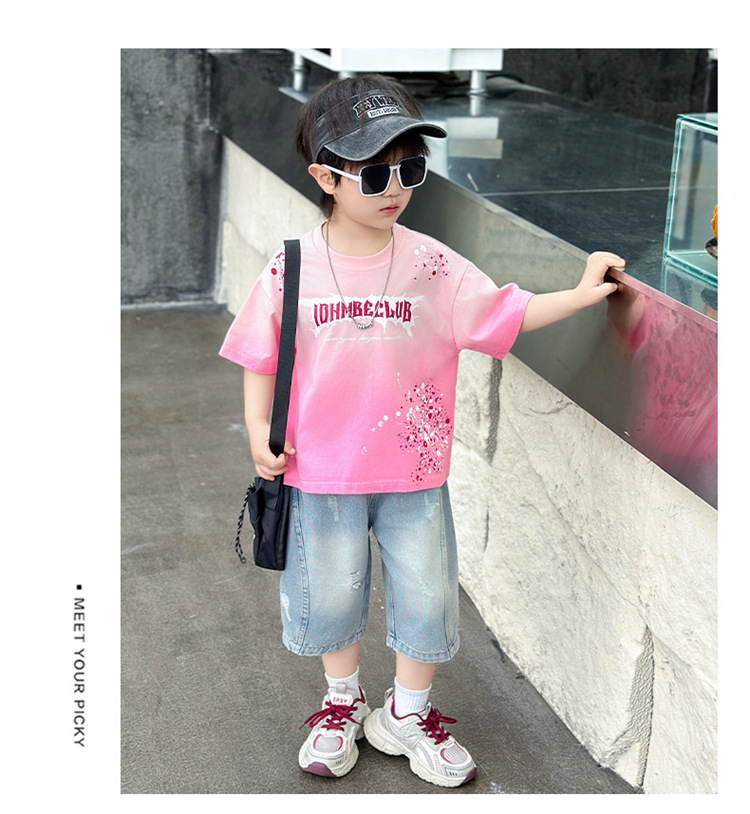 소년 여름 정장 2025 새로운 멋진 아기 어린이 반팔 타이 염색 투피스 세트 소년 여름 아동 의류 유행스토어 가기