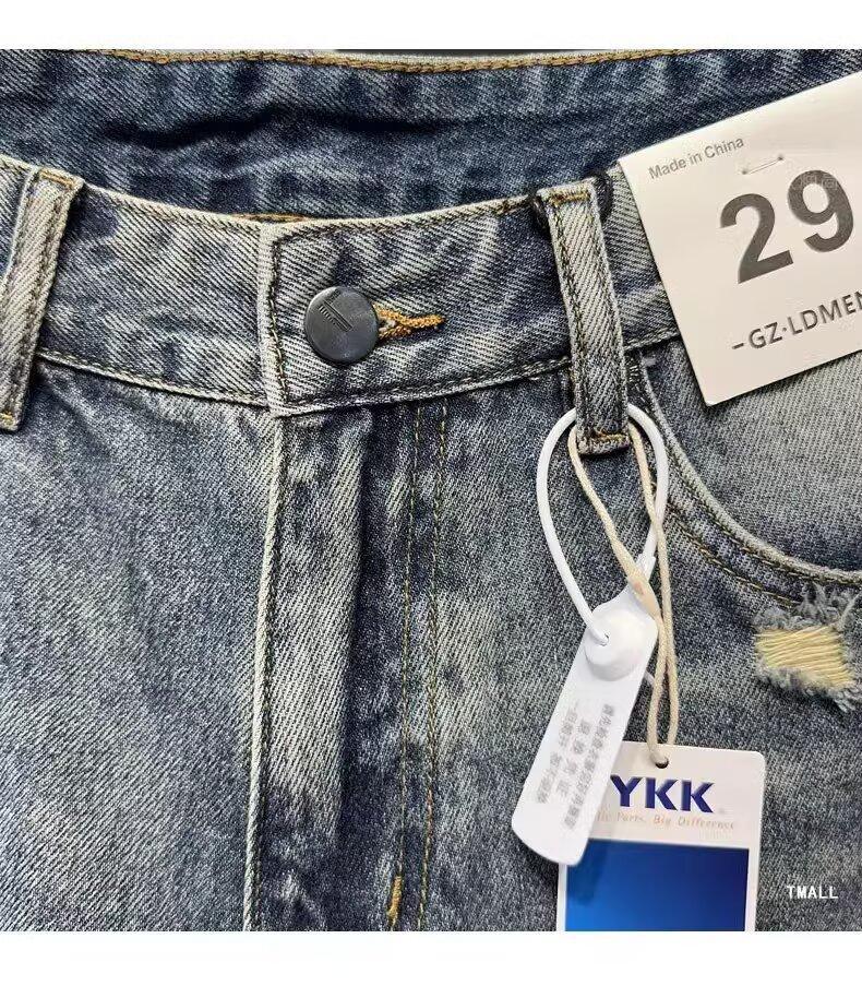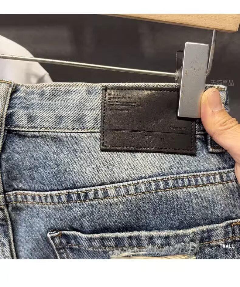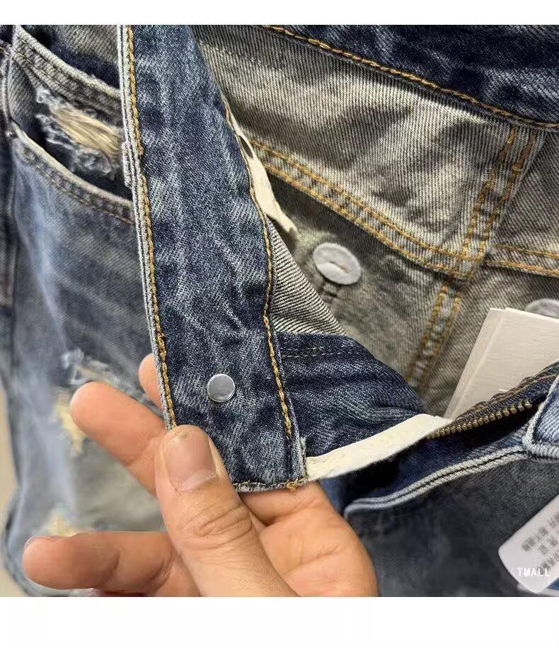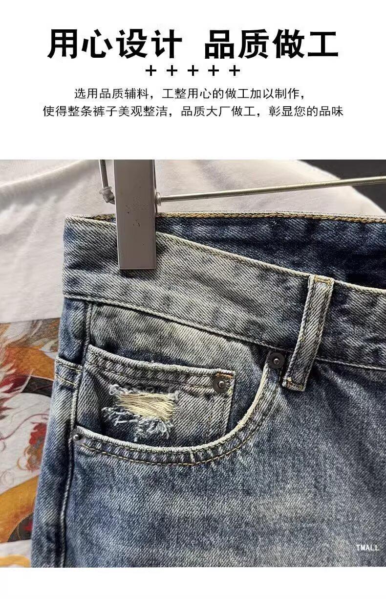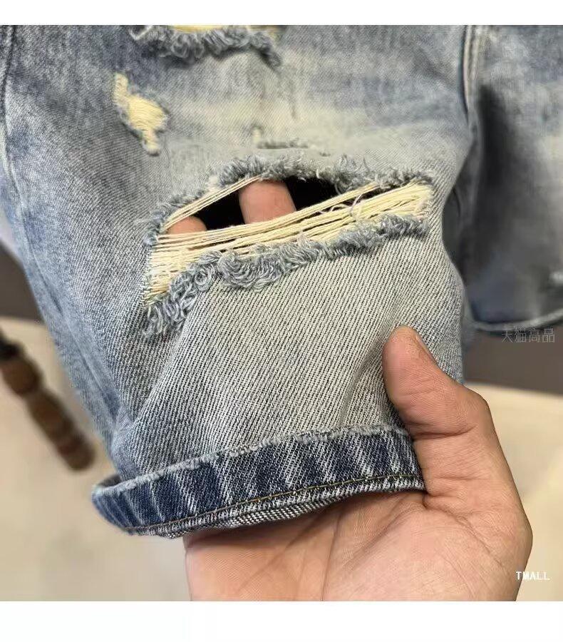 카운터 고급 면화 질감의 홍콩 버전 빈티지 세척 구멍 데님 반바지 남성 여름 얇은 스트레이트 바지스토어 가기