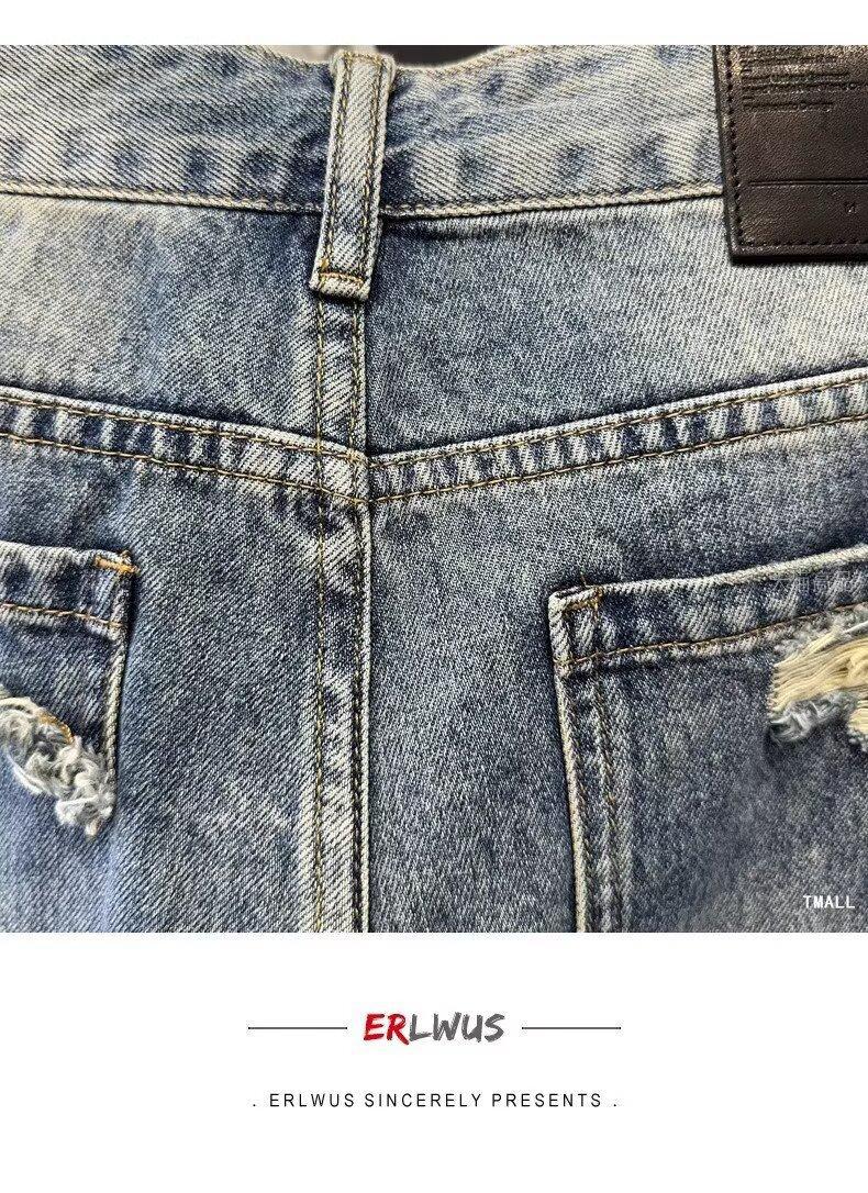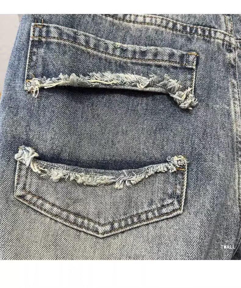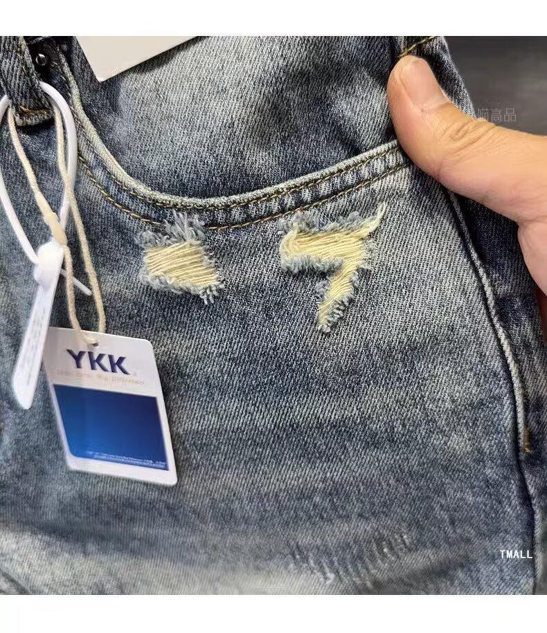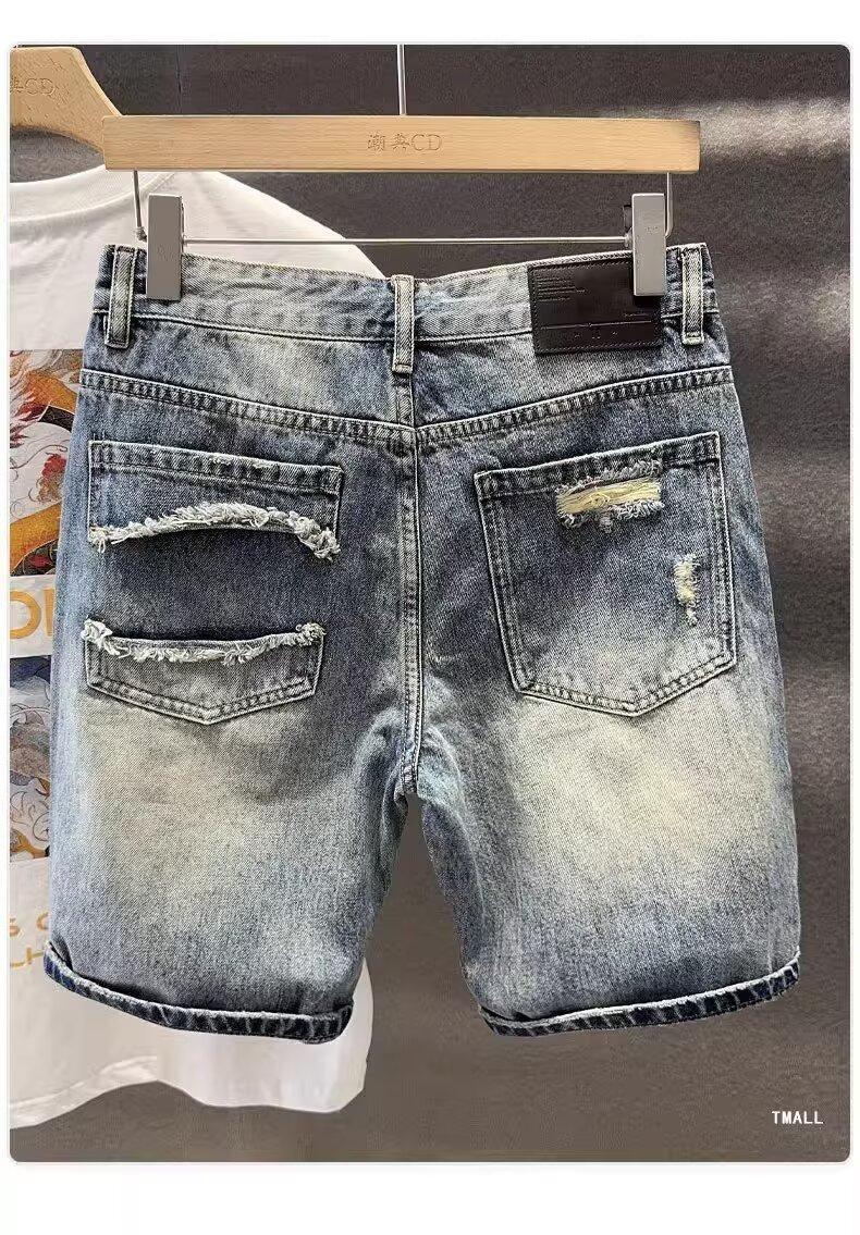 카운터 고급 면화 질감의 홍콩 버전 빈티지 세척 구멍 데님 반바지 남성 여름 얇은 스트레이트 바지스토어 가기