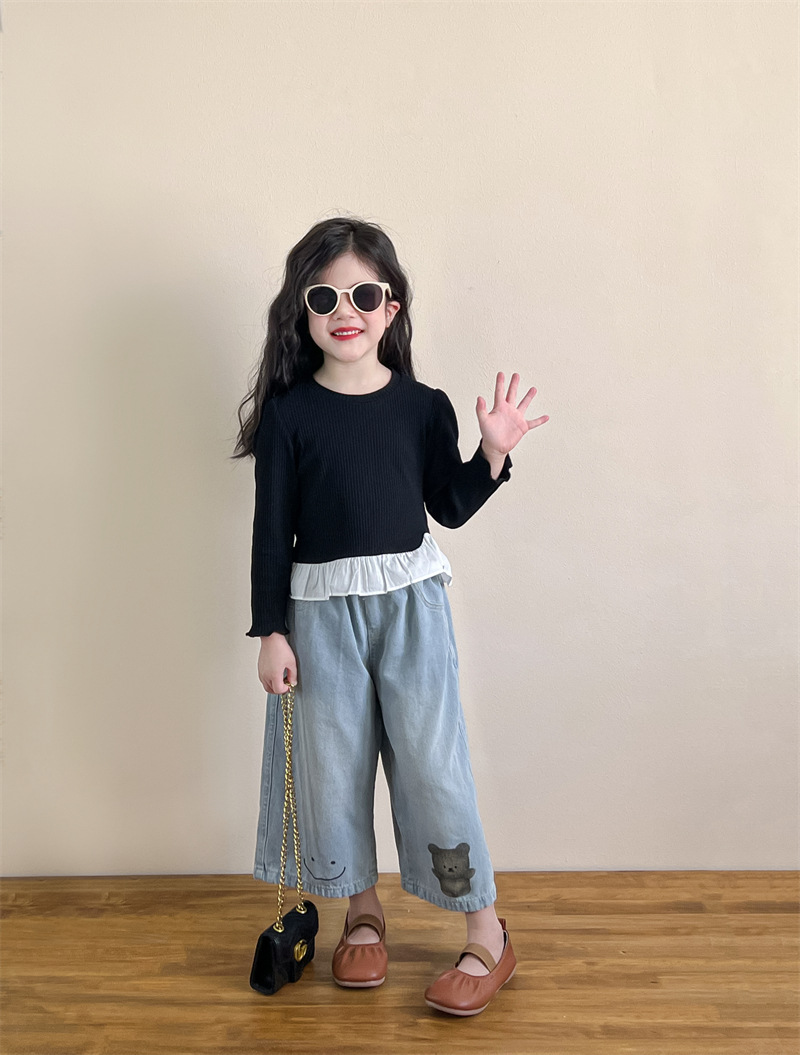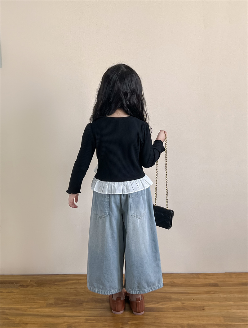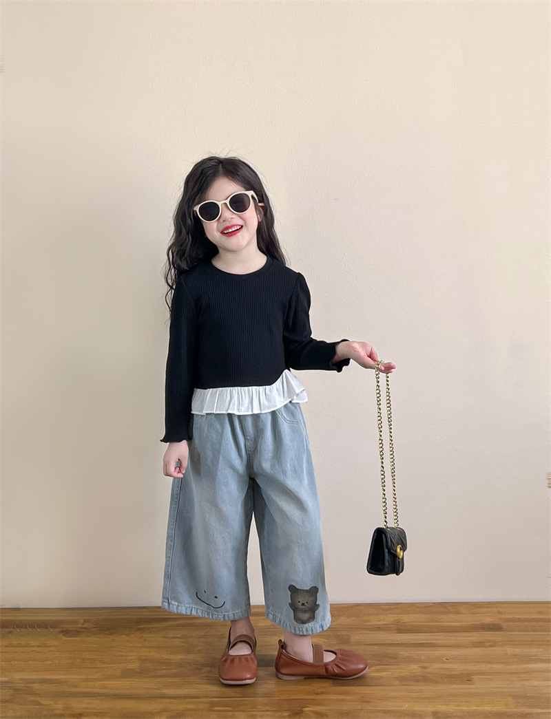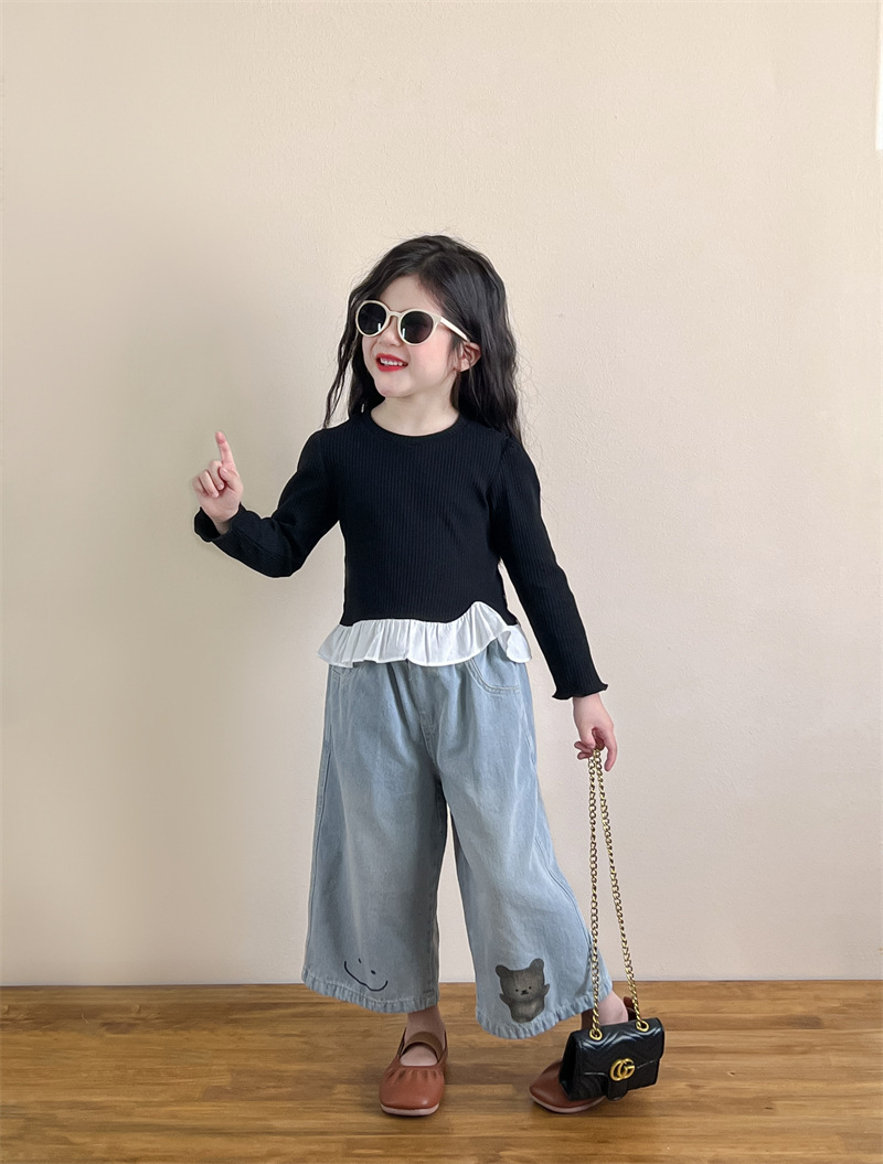 한국 스타일 소녀의 봄과 가을 성격 디자인 검은 연꽃 잎 스윙 긴 소매 바느질 티셔츠 바지 싱글 비트스토어 가기