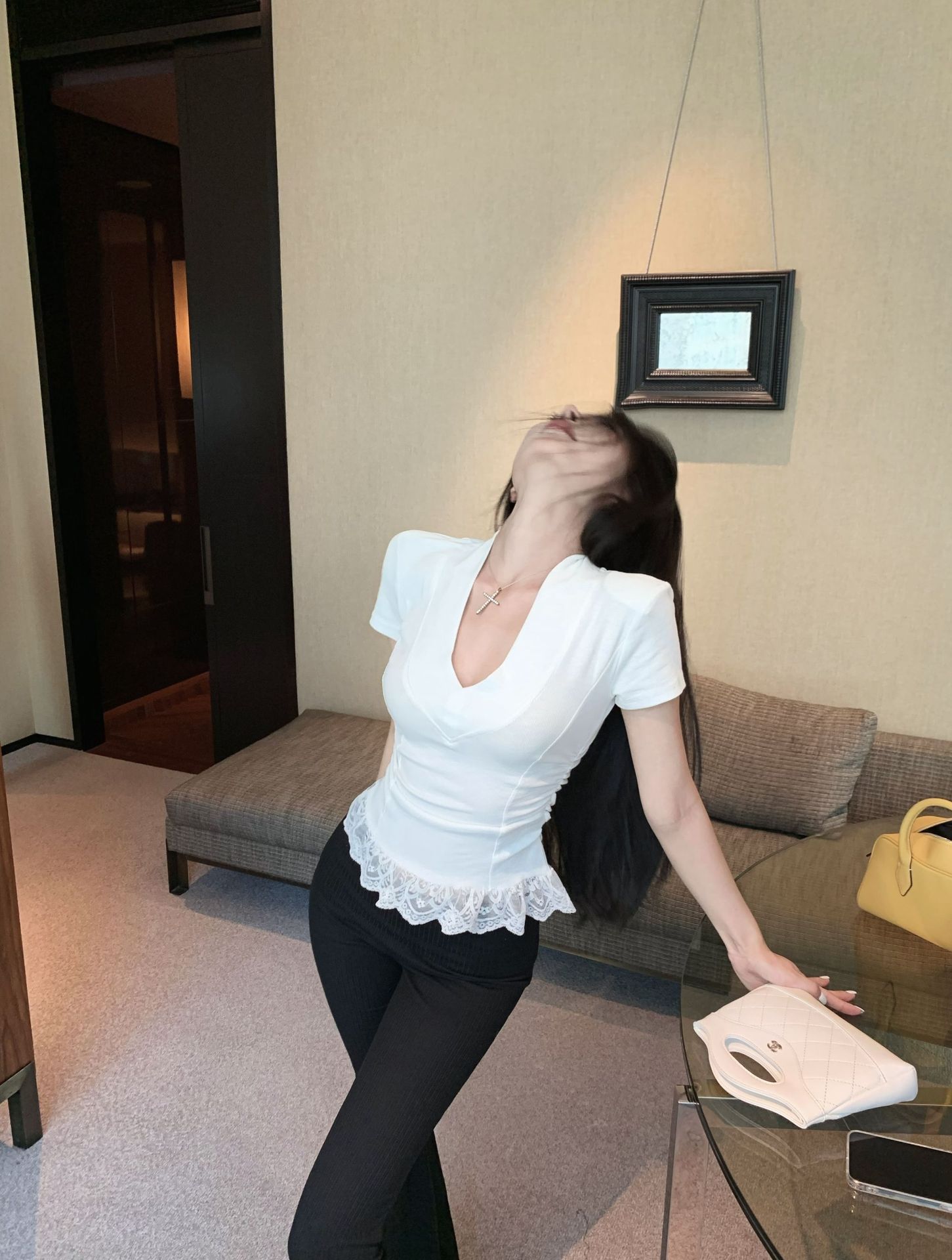 레이스 바느질 V-Neck 반팔 티셔츠 여성의 여름 플리츠 슬림 핏 내베이스 스파이스 소녀 그레이 타이트 숄더 탑