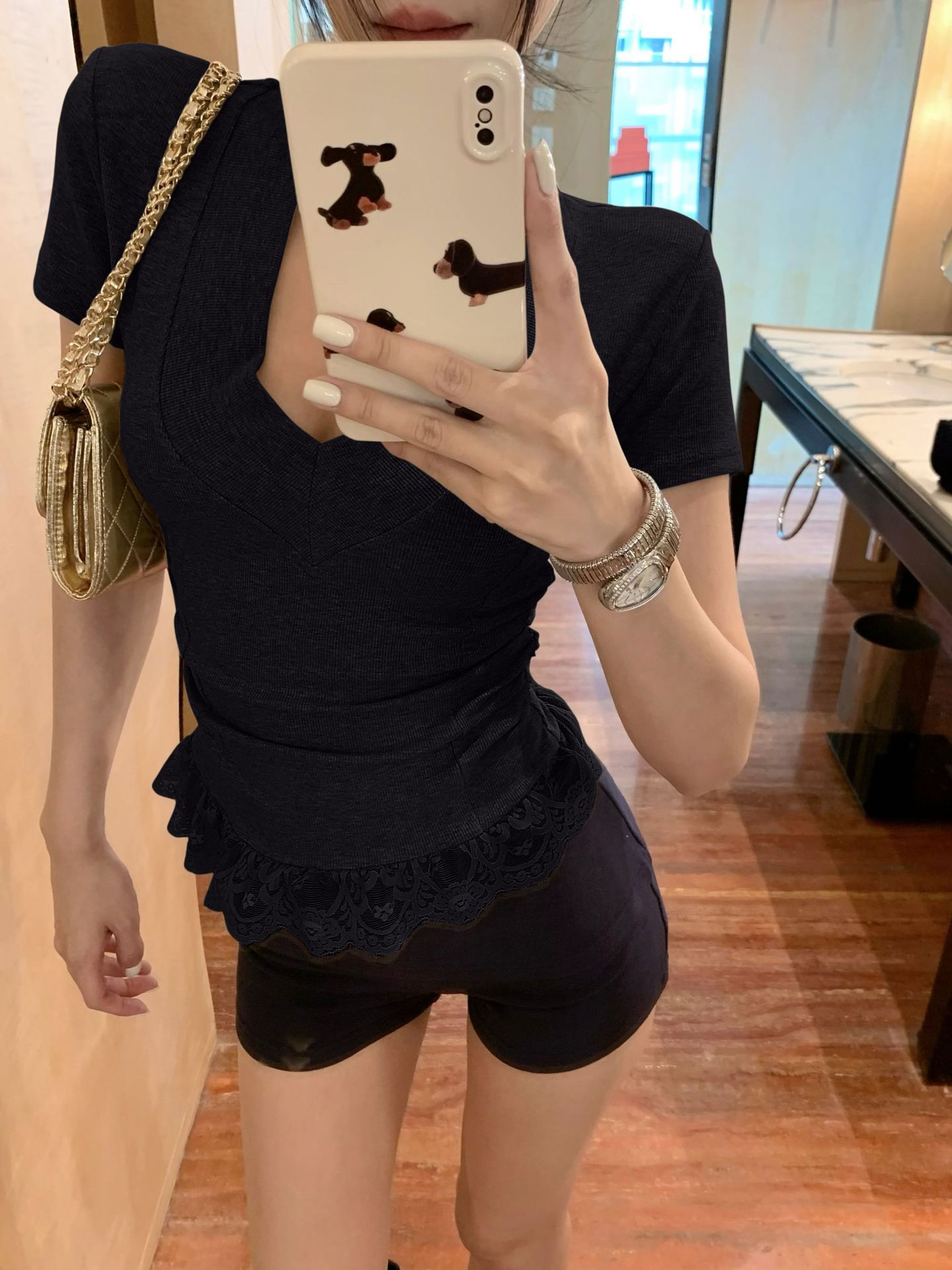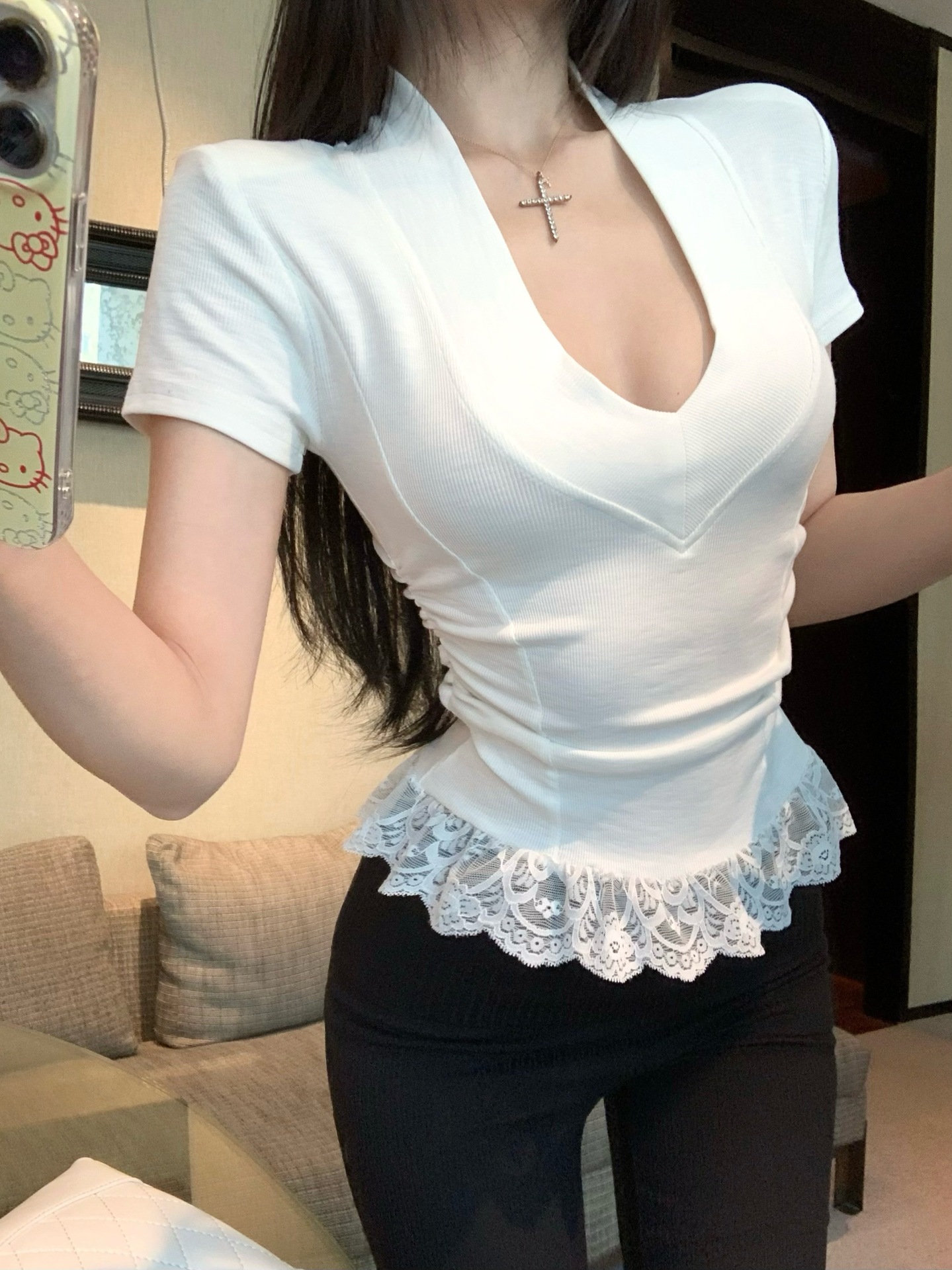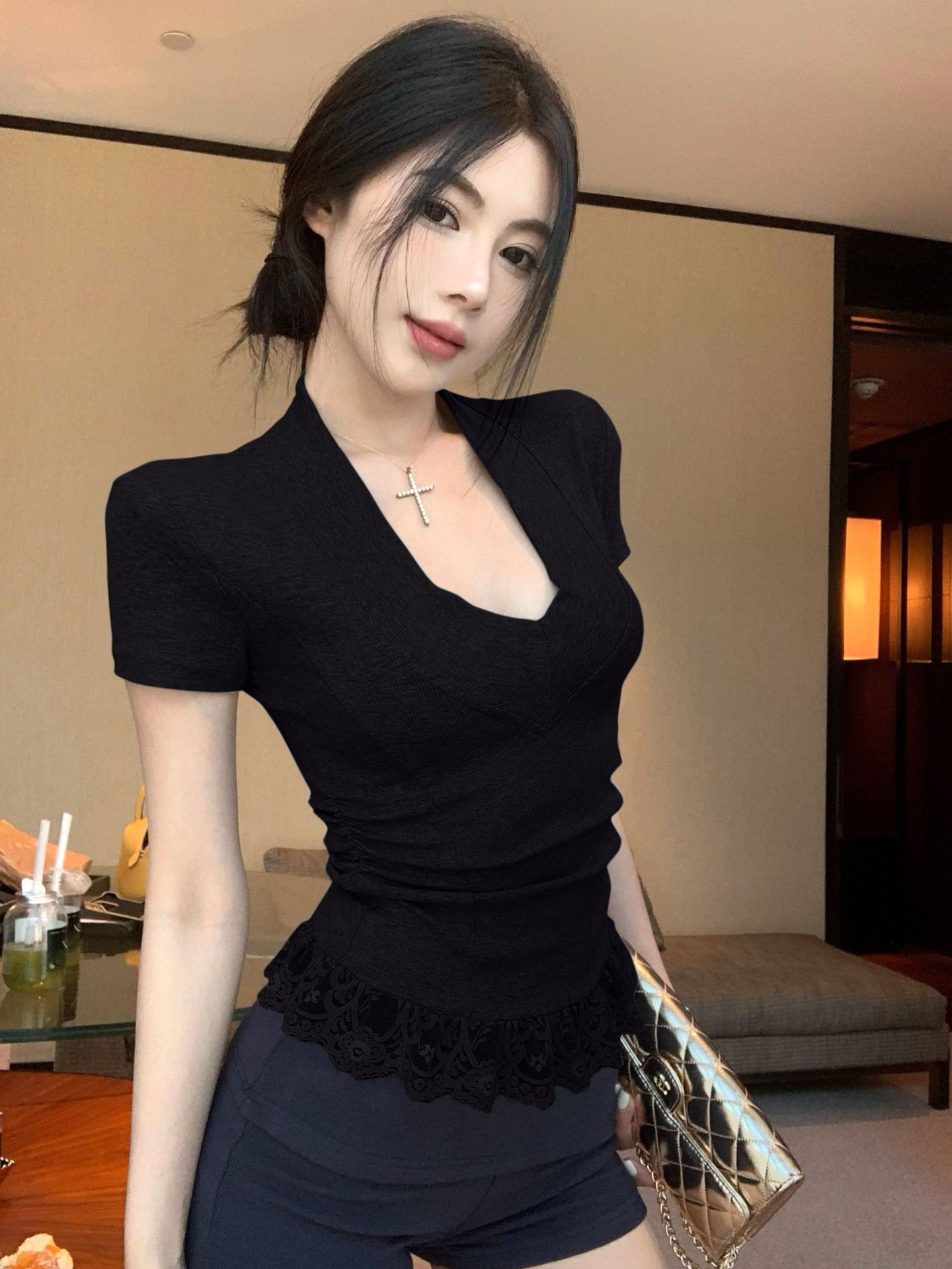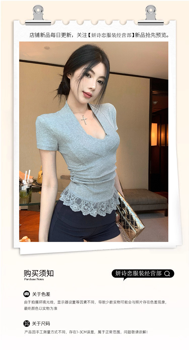 레이스 바느질 V-Neck 반팔 티셔츠 여성의 여름 플리츠 슬림 핏 내베이스 스파이스 소녀 그레이 타이트 숄더 탑스토어 가기