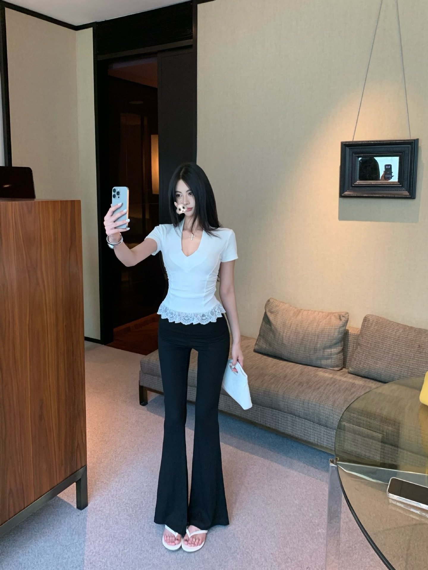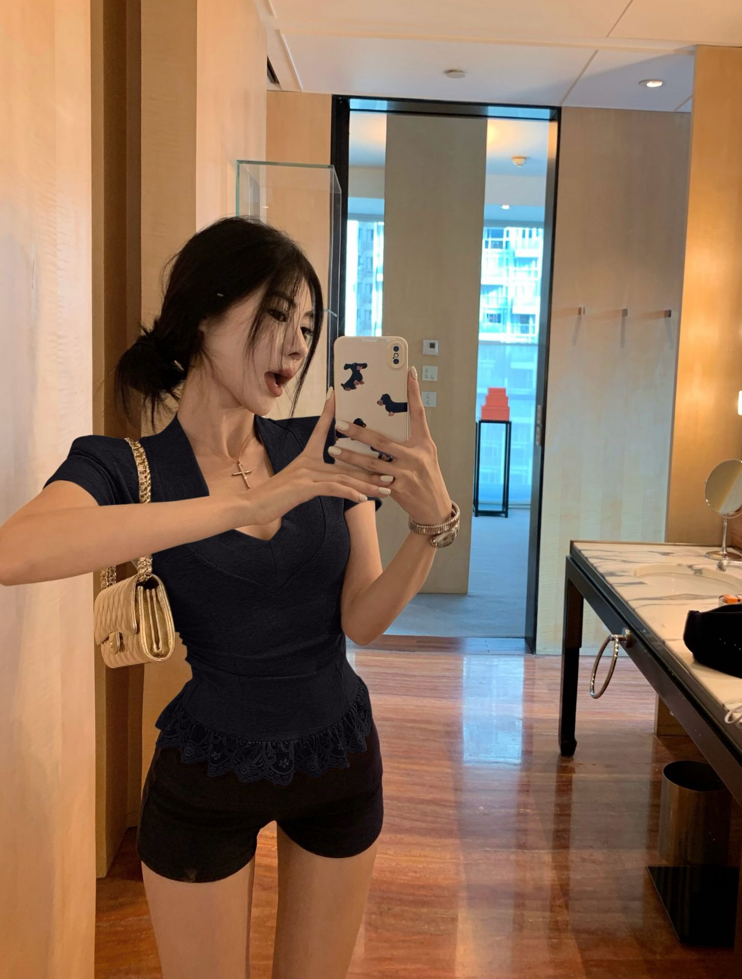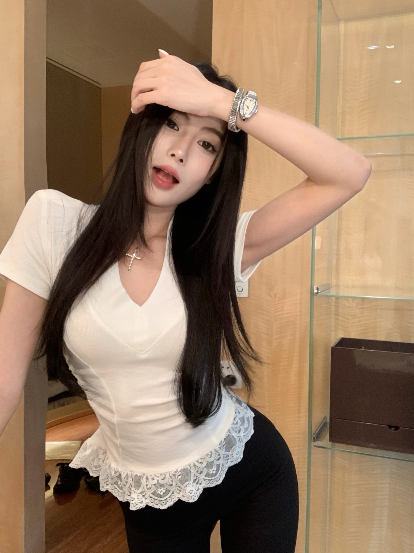 레이스 바느질 V-Neck 반팔 티셔츠 여성의 여름 플리츠 슬림 핏 내베이스 스파이스 소녀 그레이 타이트 숄더 탑스토어 가기