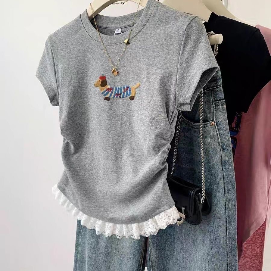 그레이 레이스 강아지 반팔 티셔츠 여성 여름 2025 여름 짧은 어깨 꽉 허리 탑