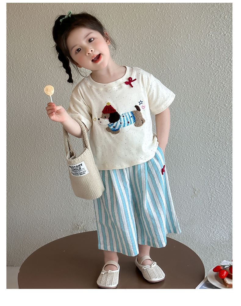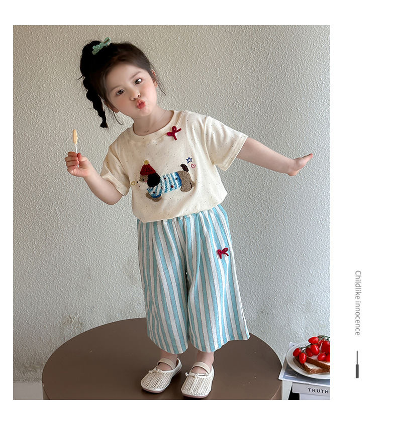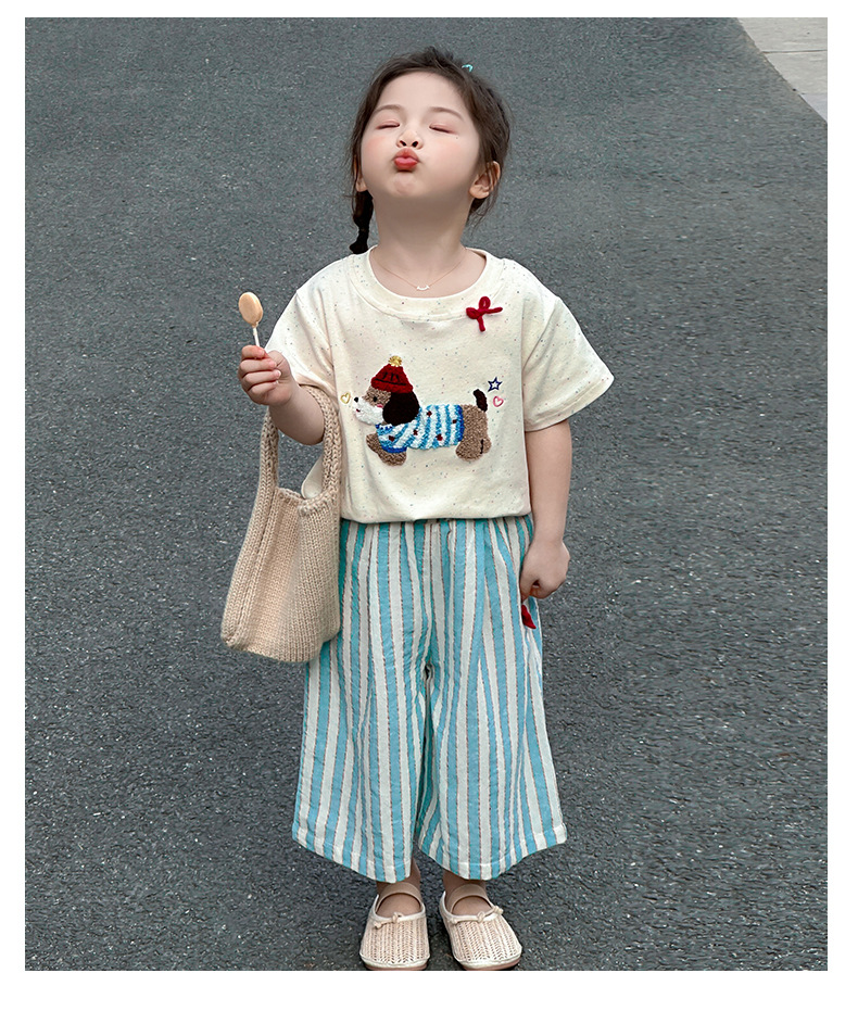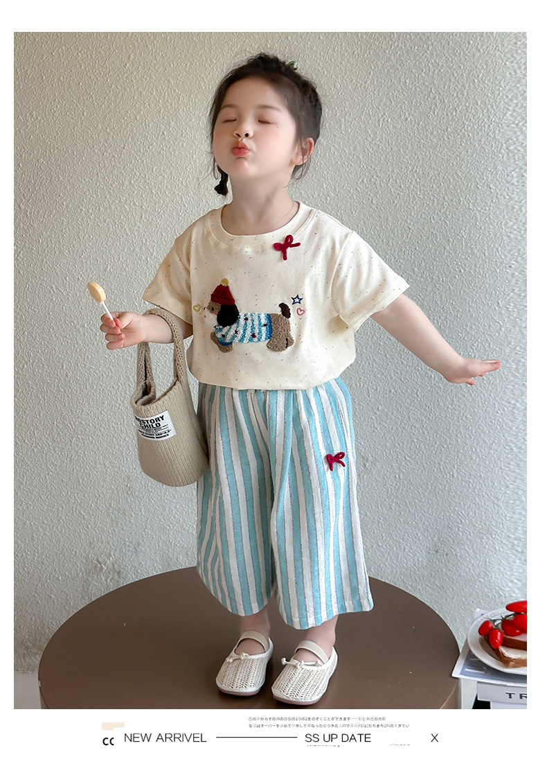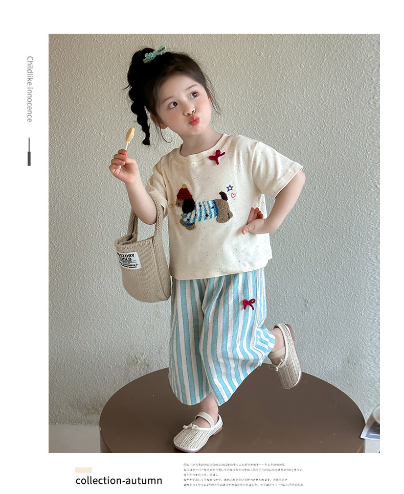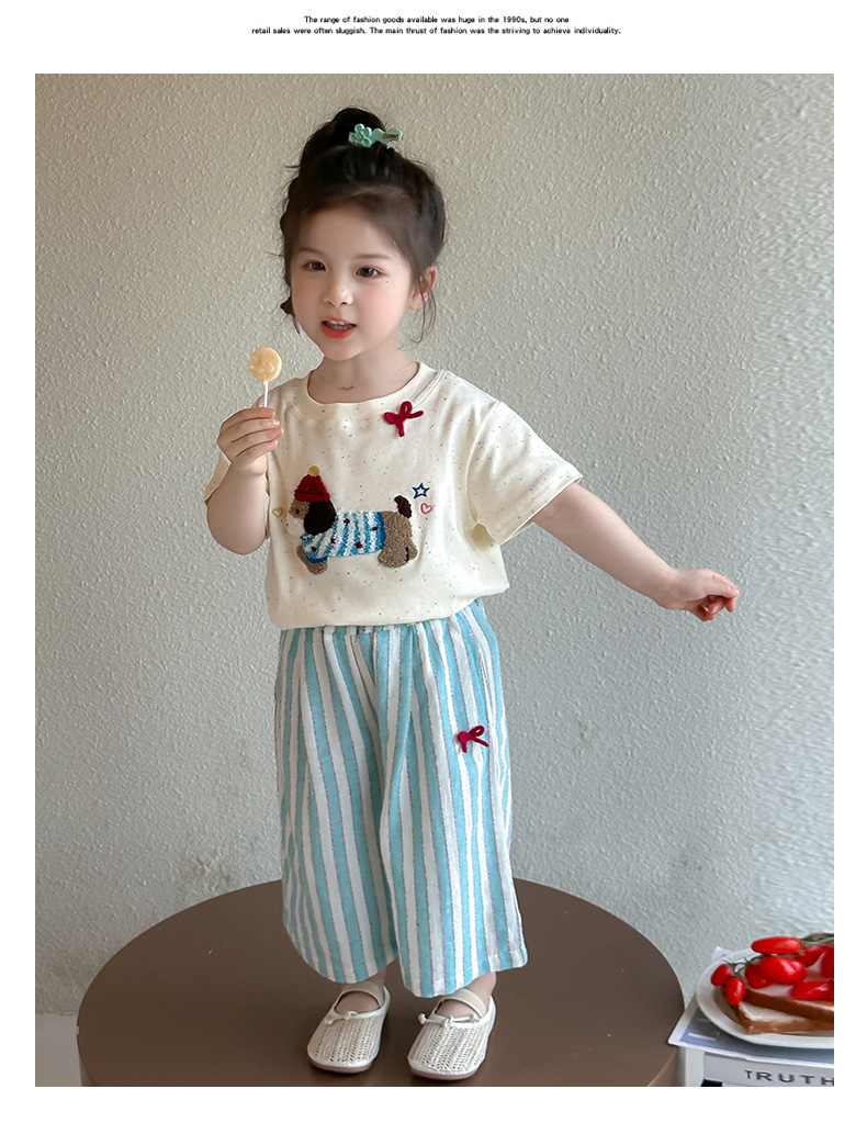 【48시간 배송】신상품 수건 자수 강아지 와이드 팬츠 세트, 유아 및 어린이용 인기 있는 세련된 여아 투피스 세트스토어 가기