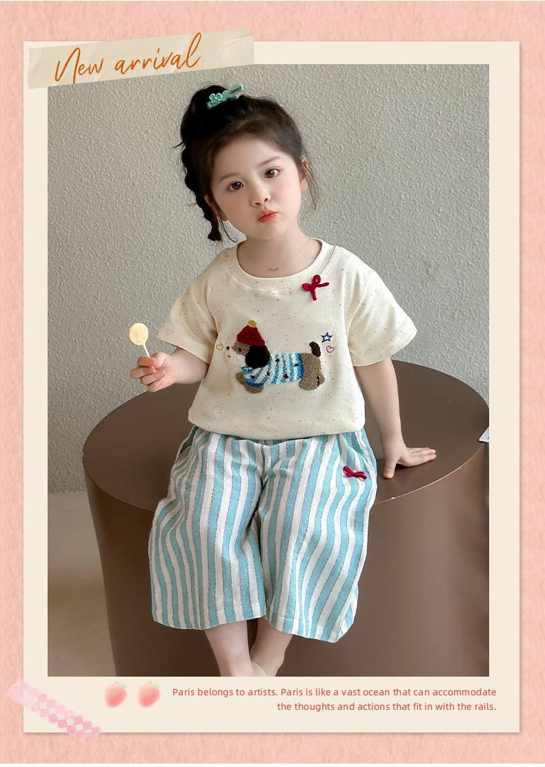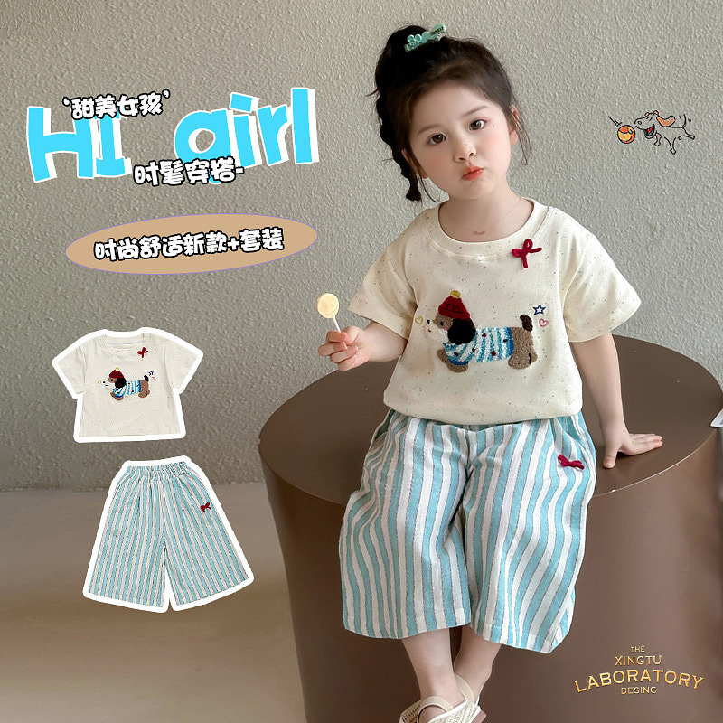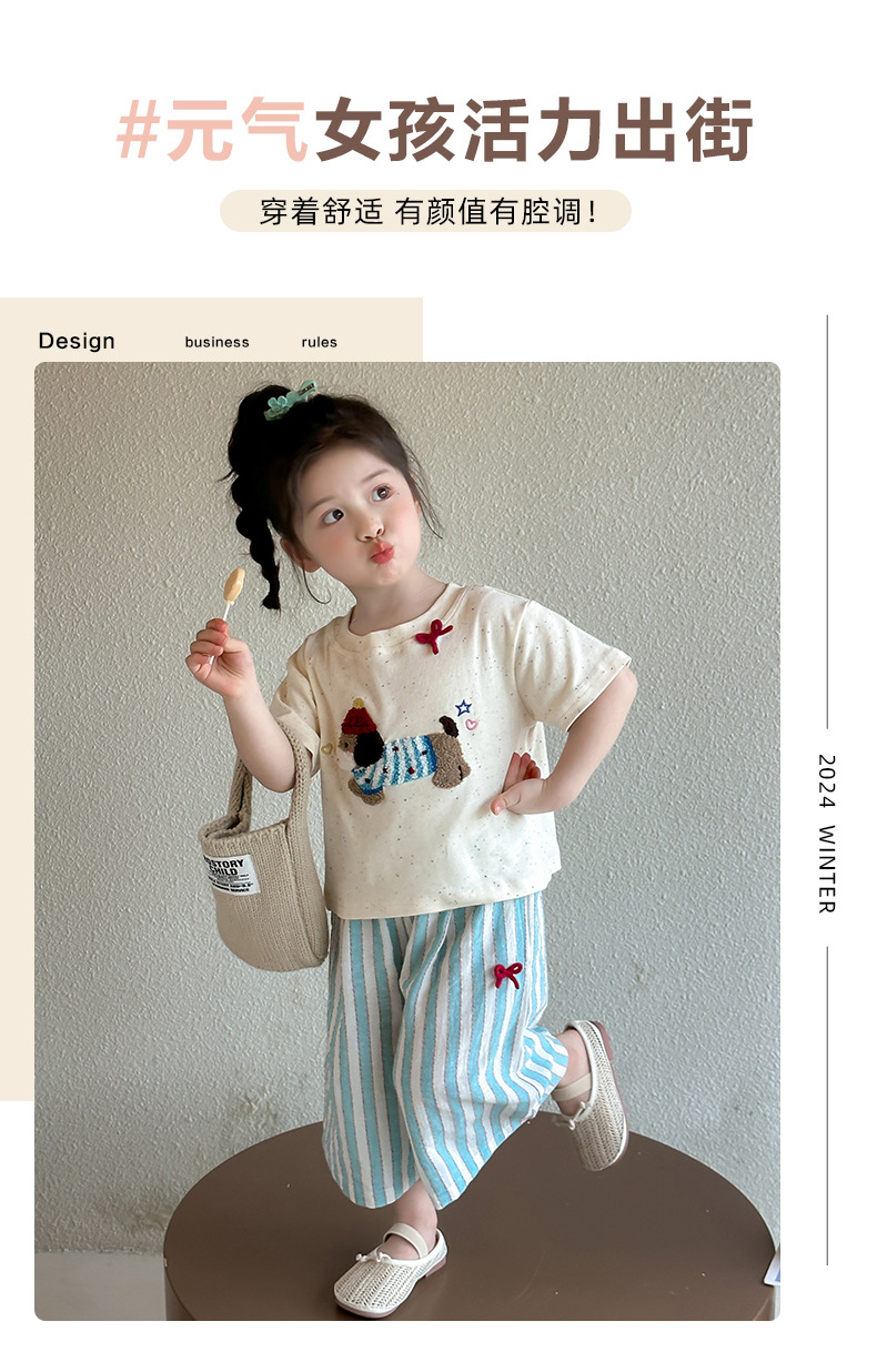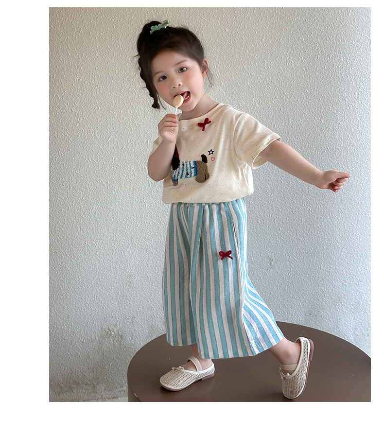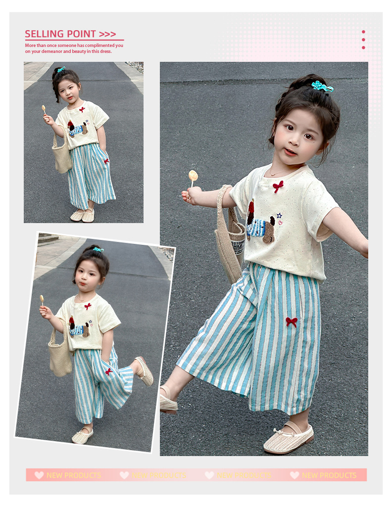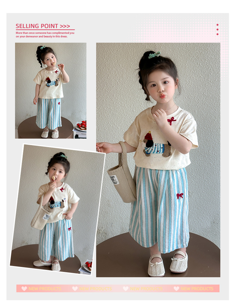 【48시간 배송】신상품 수건 자수 강아지 와이드 팬츠 세트, 유아 및 어린이용 인기 있는 세련된 여아 투피스 세트스토어 가기