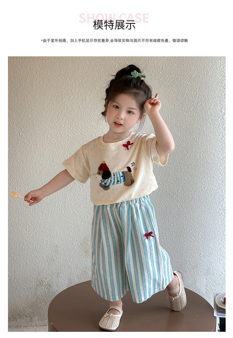【48시간 배송】신상품 수건 자수 강아지 와이드 팬츠 세트, 유아 및 어린이용 인기 있는 세련된 여아 투피스 세트