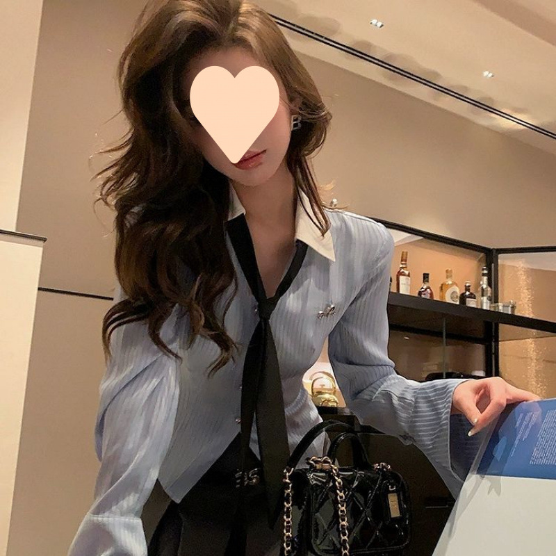 소외된 슬림핏 긴팔 줄무늬 셔츠 여성의 봄 새로운 한국식 분위기 블루 디자인 센스 칼라 탑스토어 가기