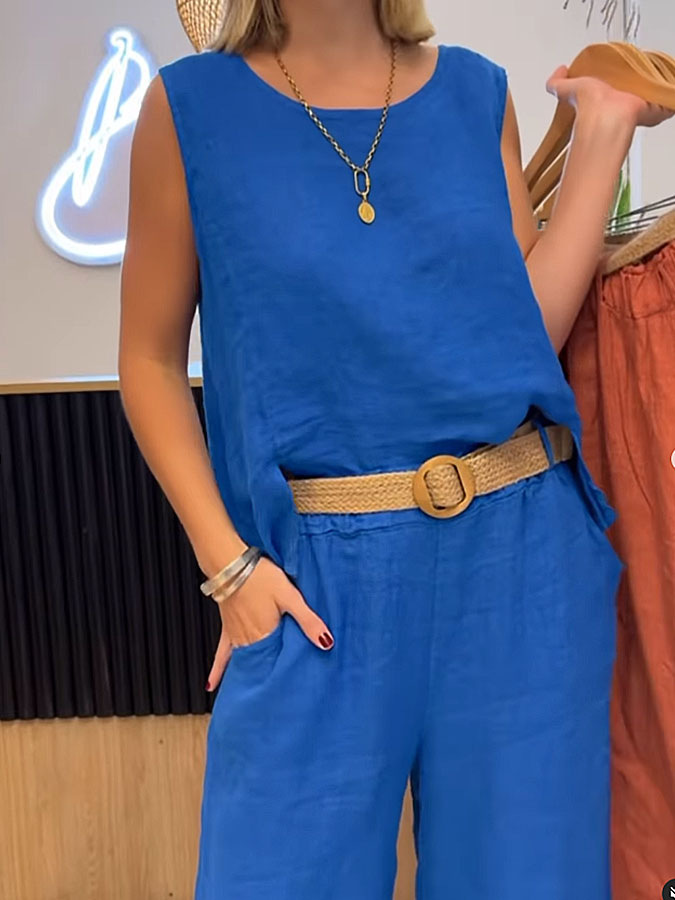 유럽과 미국의 국경 간 독립 역 폭발 여성 캐주얼 크루 넥 조끼 면화와 리넨 민소매 바지 투피스 세트스토어 가기