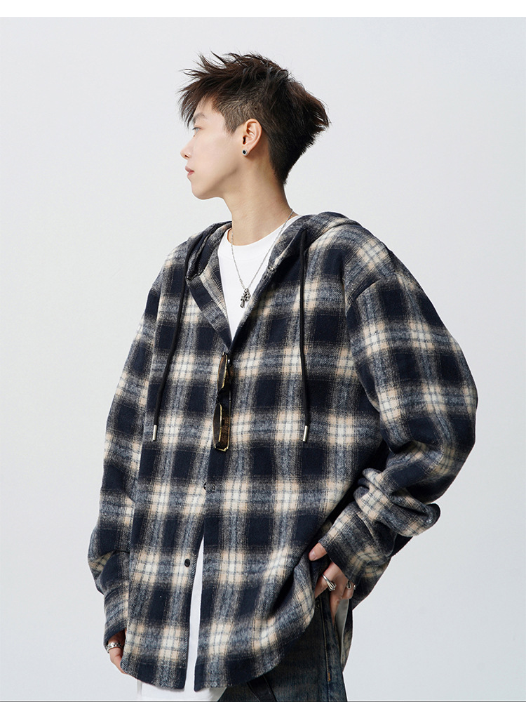 미국 트렌디 브랜드 후드 체크 무늬 셔츠 남성 봄 복고풍 대비 컬러 커플 긴팔 셔츠 루즈 대형 카디건 재킷