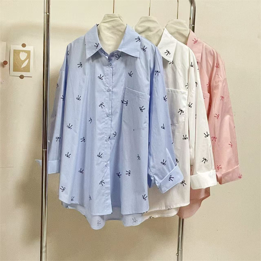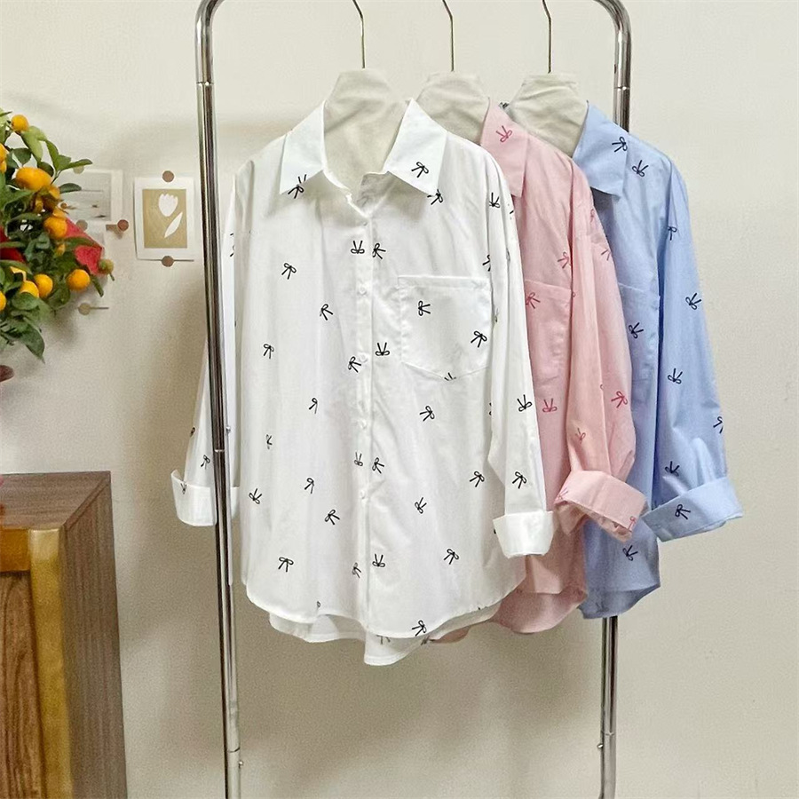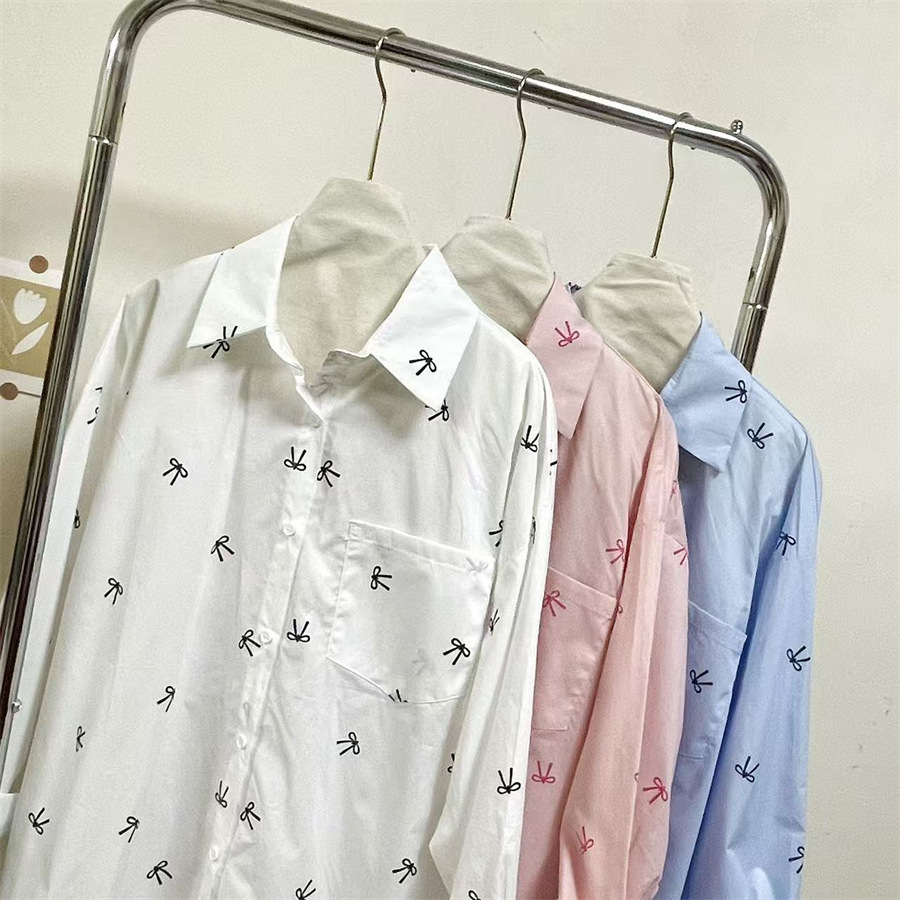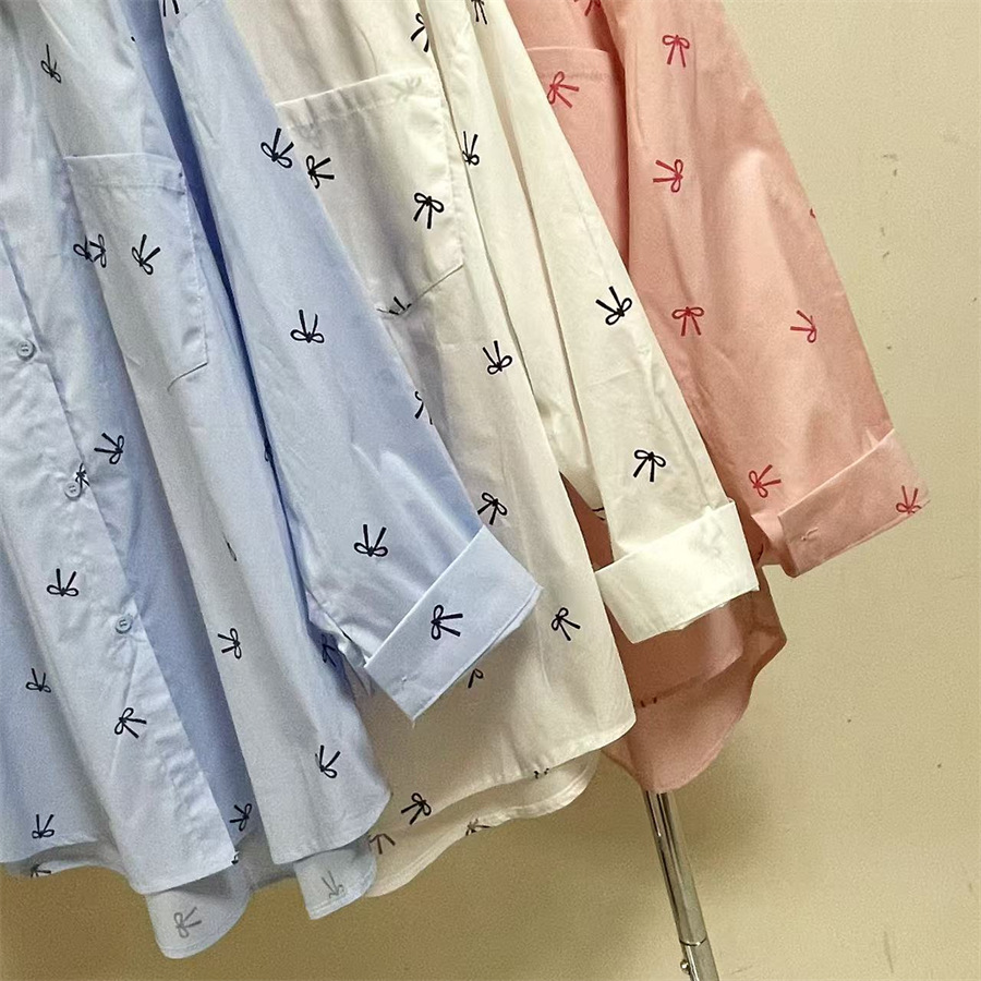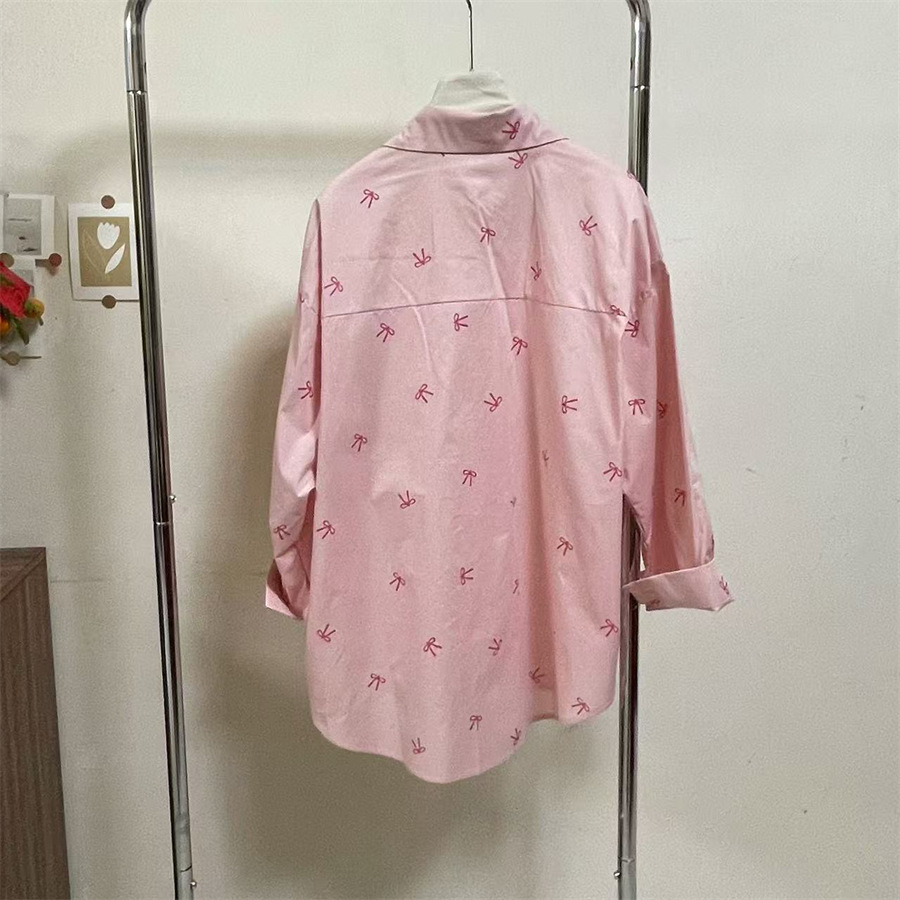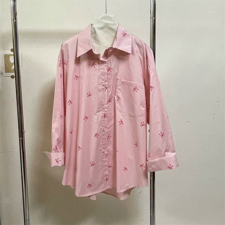 핑크 달콤한 활 인쇄 긴 소매 셔츠 여성의 2025 봄 새로운 느슨한 게으른 태양 보호 카디건 탑스토어 가기