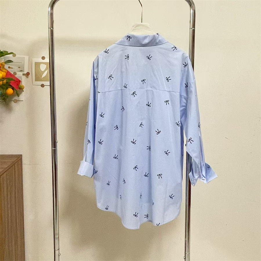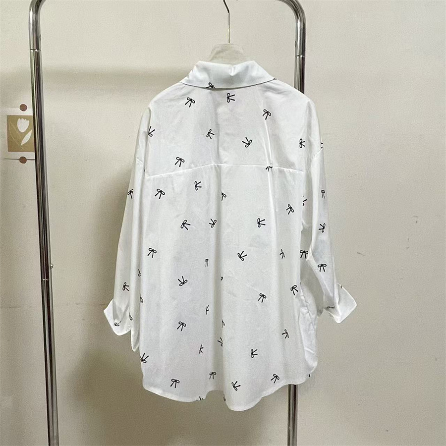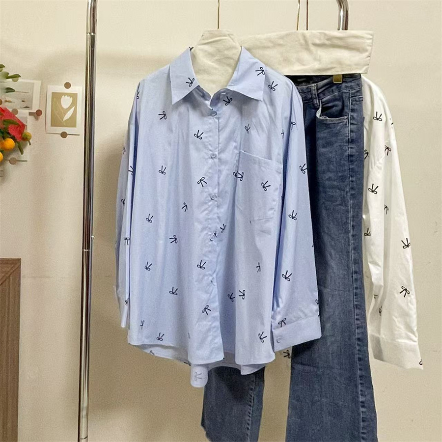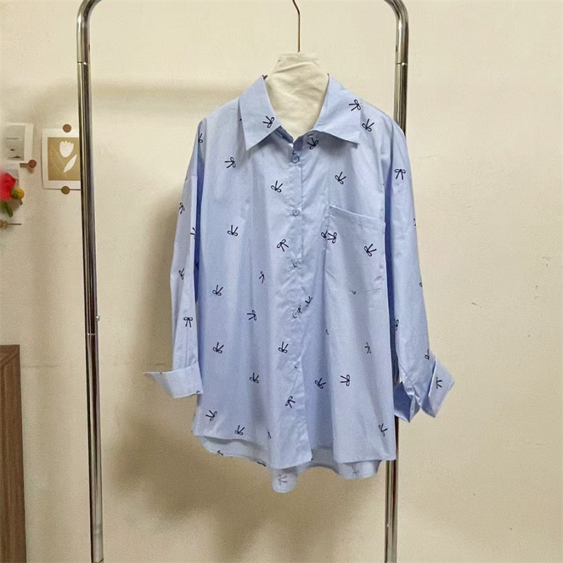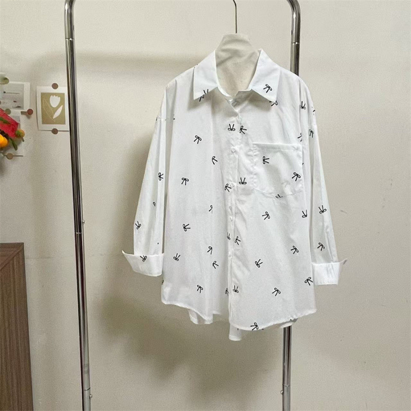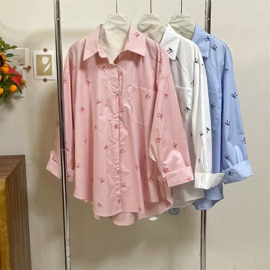 핑크 달콤한 활 인쇄 긴 소매 셔츠 여성의 2025 봄 새로운 느슨한 게으른 태양 보호 카디건 탑스토어 가기