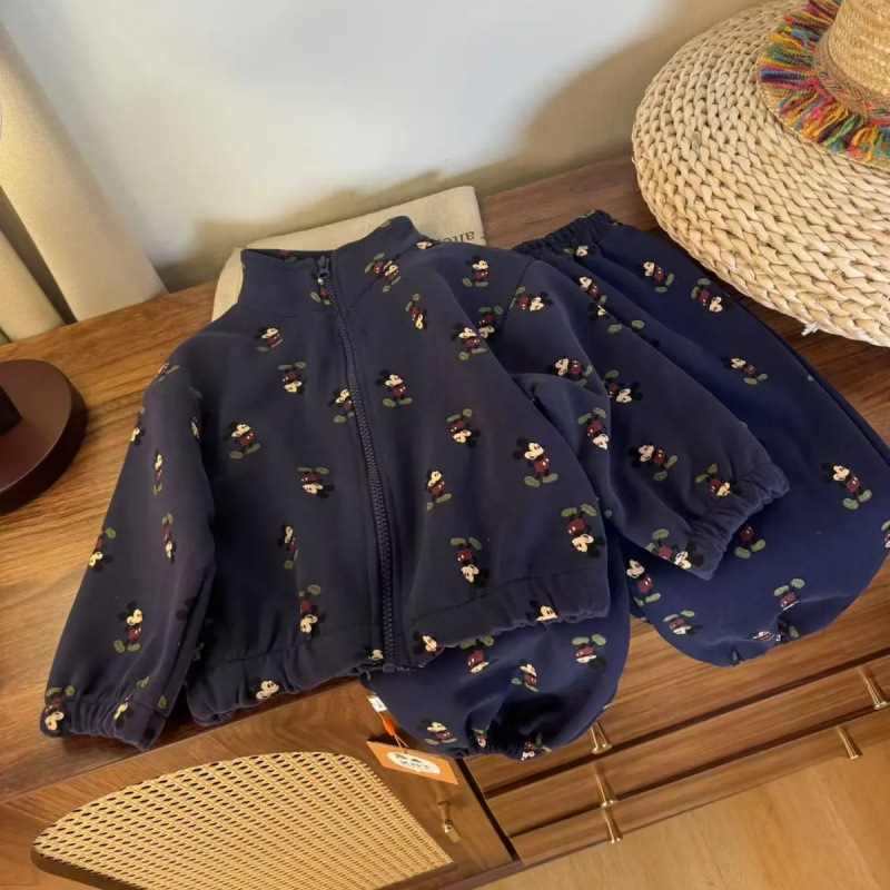 소년과 소녀 지퍼 스웨트 셔츠 바지 정장 2025 봄 새로운 미키 전체 인쇄 패션 스포츠 코트 투피스 세트