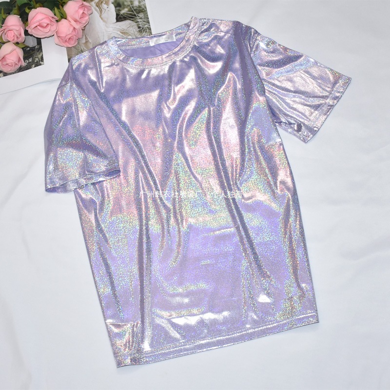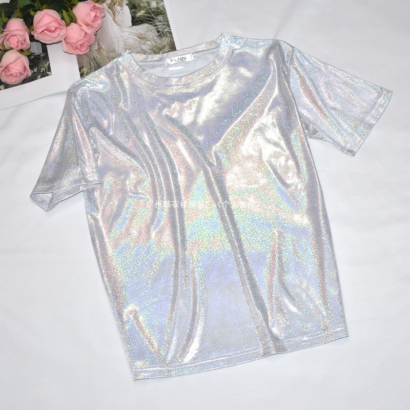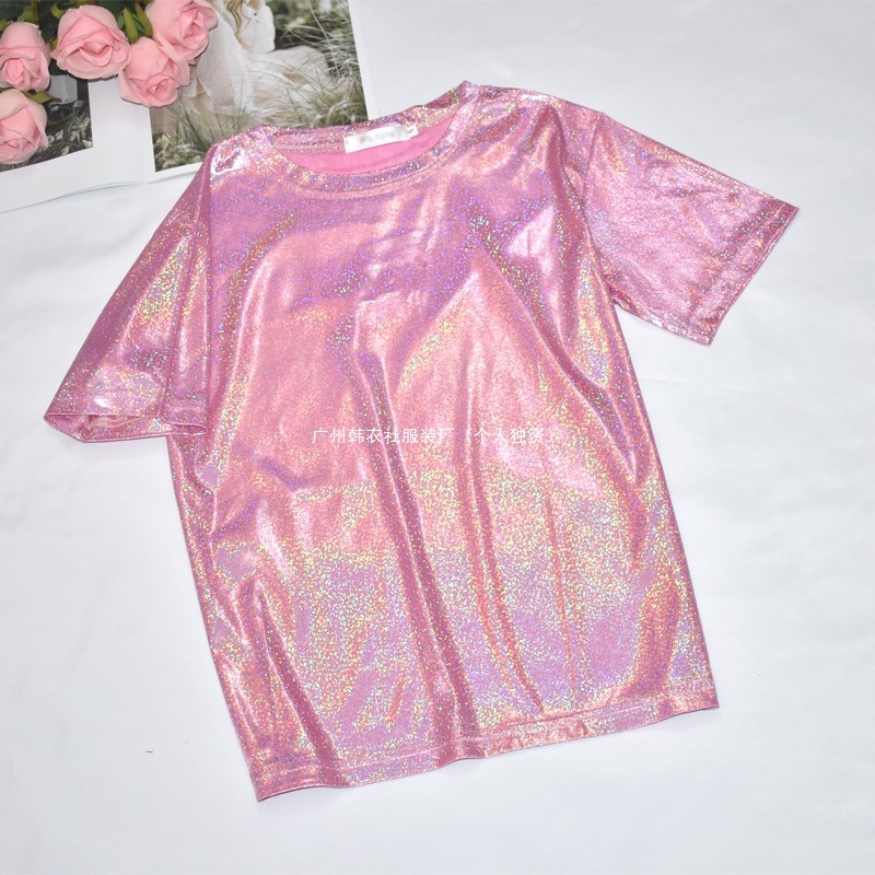 한국 스타일 슈퍼 핫 얇은베이스 셔츠 밝은 실크 반짝이 탑 반짝이 느슨한 반팔 티셔츠 여성용 트렌디 한 플러스 사이즈 티셔츠스토어 가기
