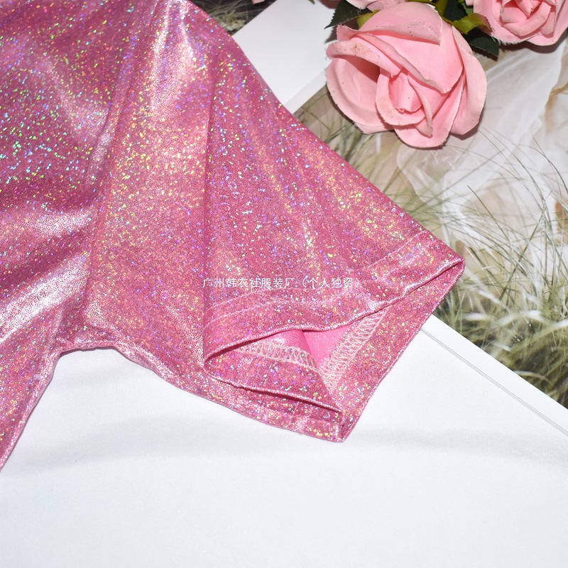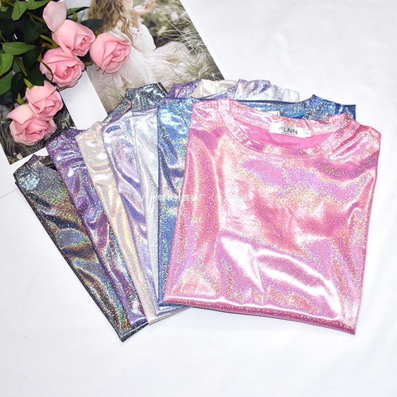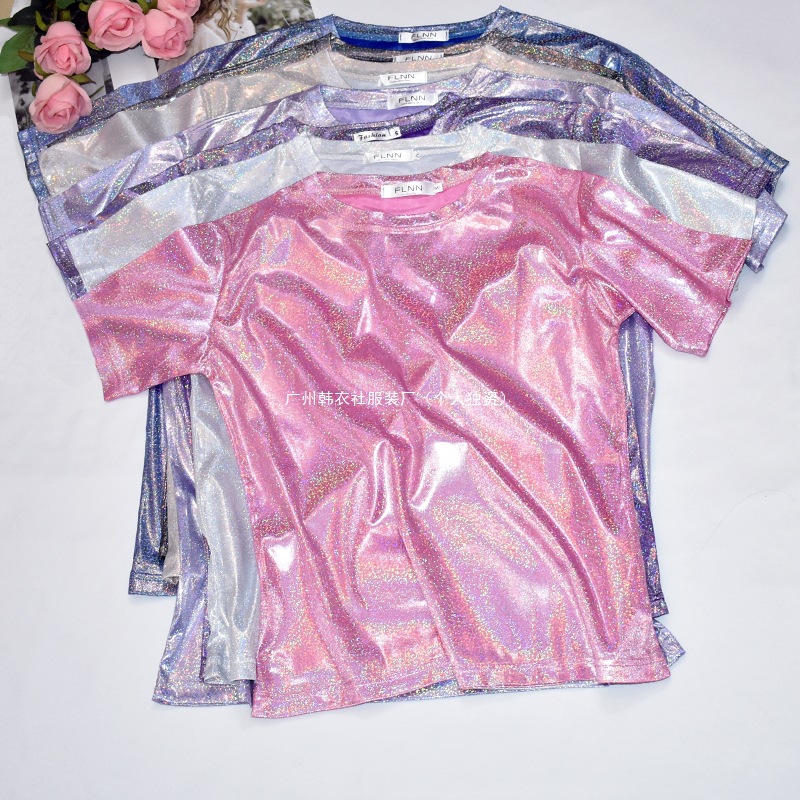 한국 스타일 슈퍼 핫 얇은베이스 셔츠 밝은 실크 반짝이 탑 반짝이 느슨한 반팔 티셔츠 여성용 트렌디 한 플러스 사이즈 티셔츠