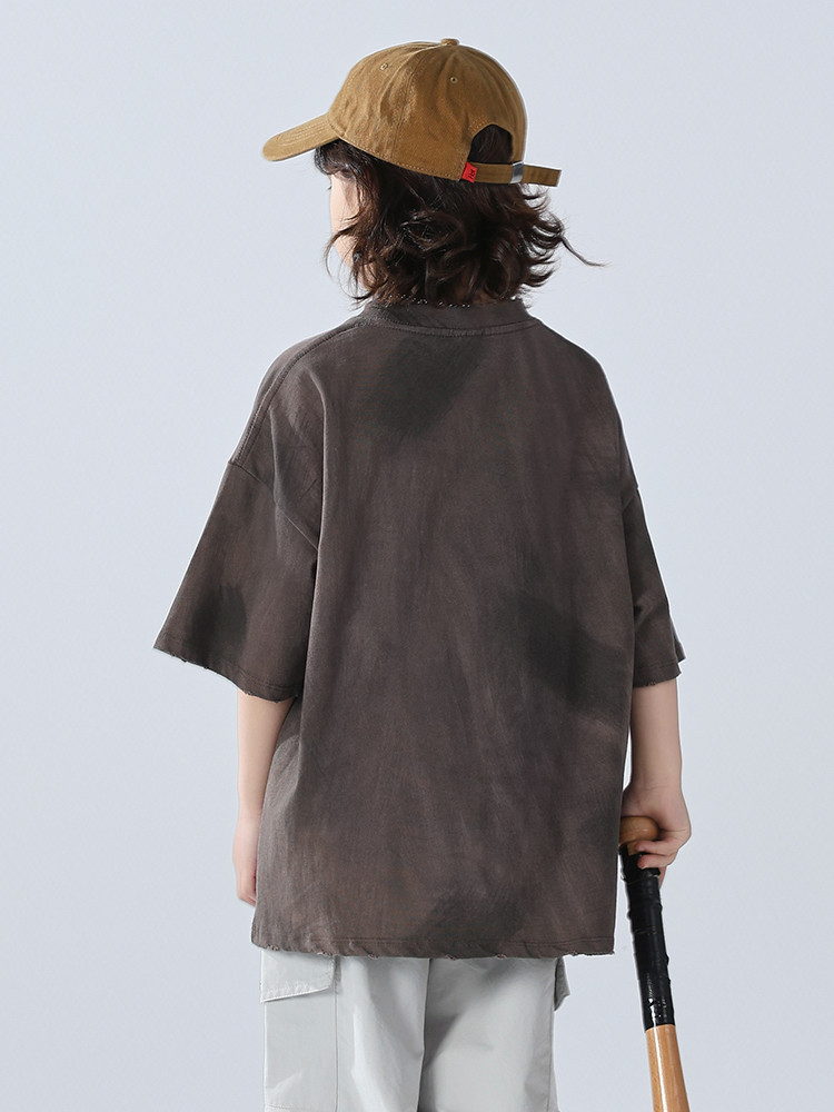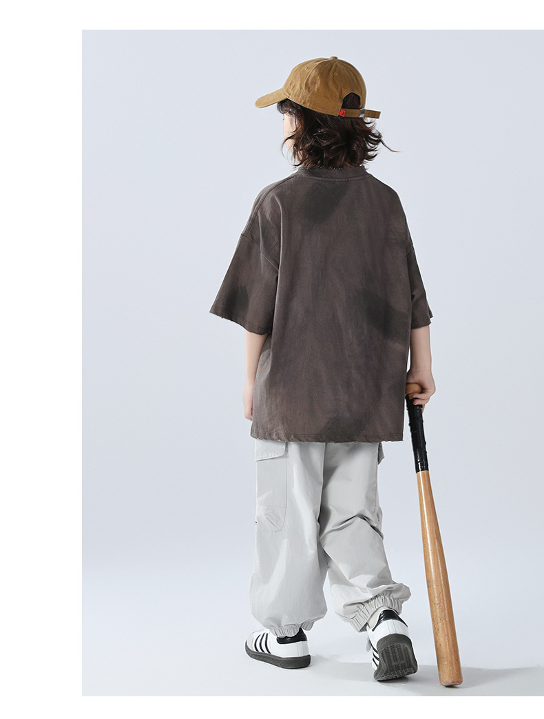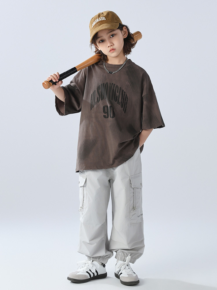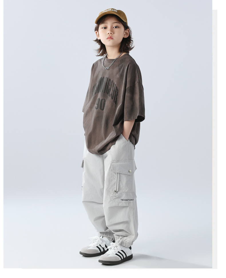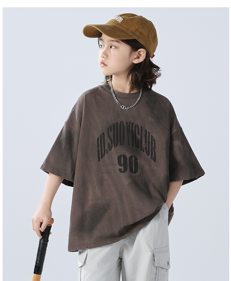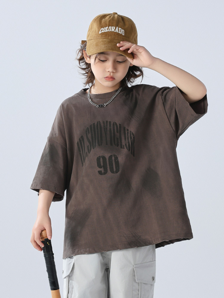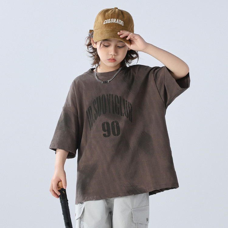여름 소년 90자 브러시 스타일 티셔츠 2025 새로운 한국어 버전 중대형 아동 패션 반팔