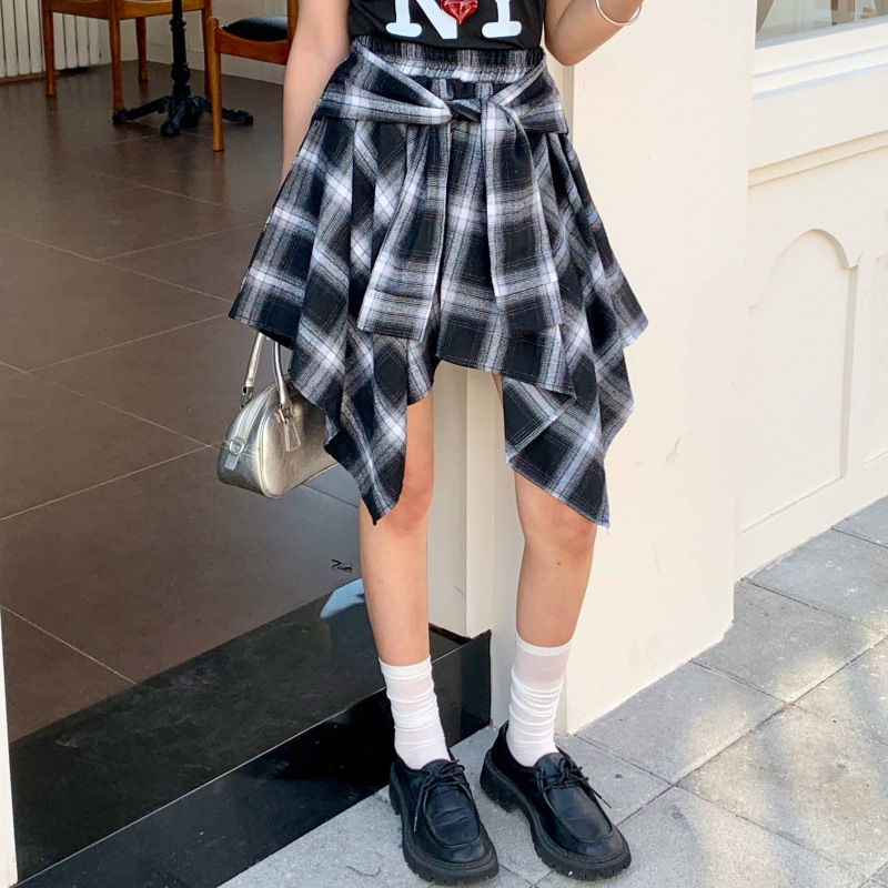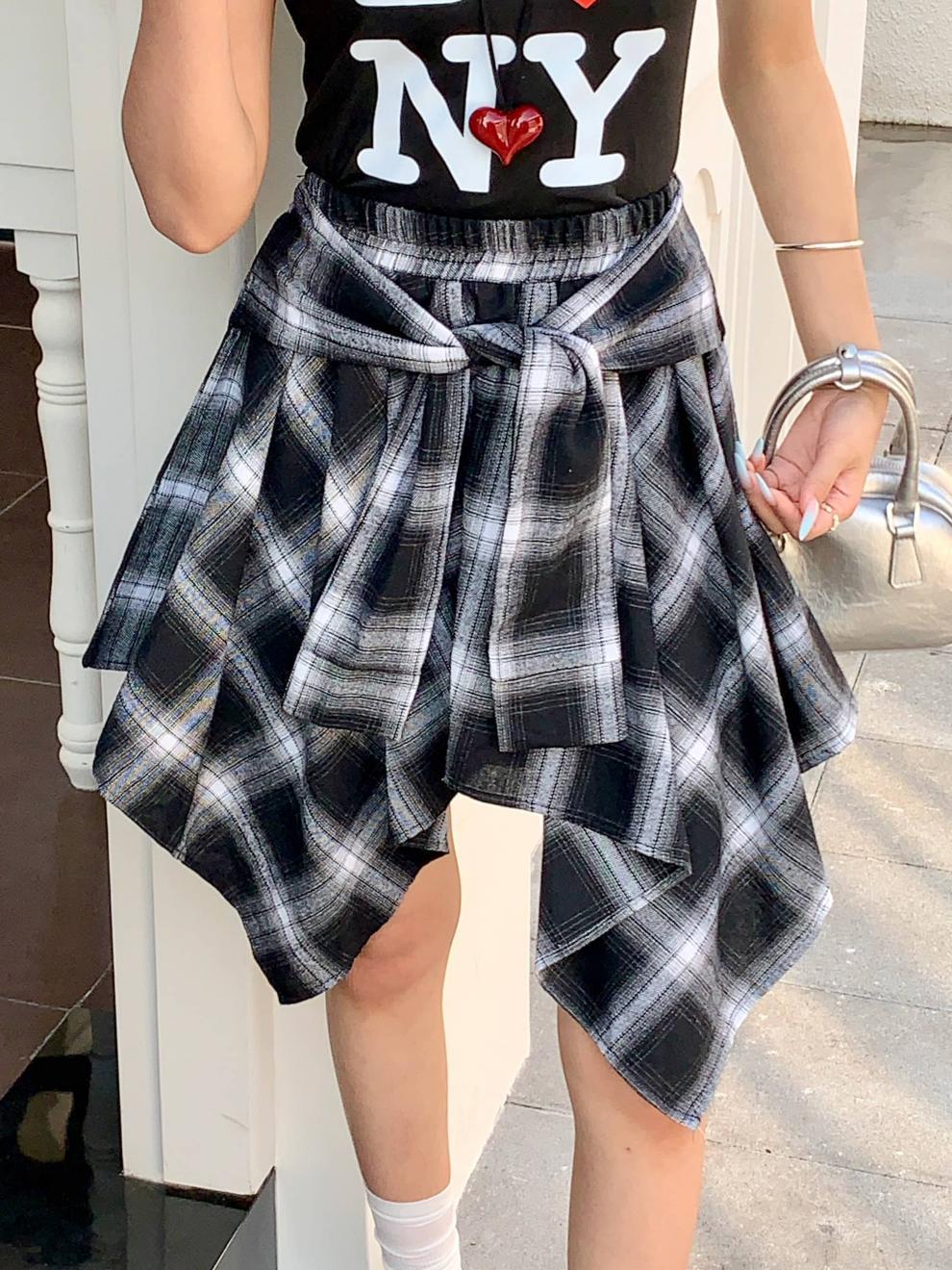2024 년 가을 새로운 도착 불규칙한 격자 무늬 스커트 A 라인 느슨한 허리 격자 무늬 레이스 업 보우 슬리밍 올매치