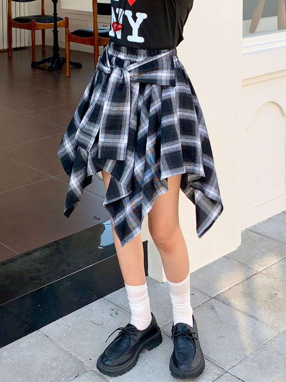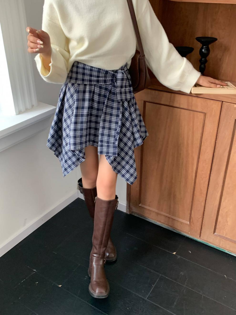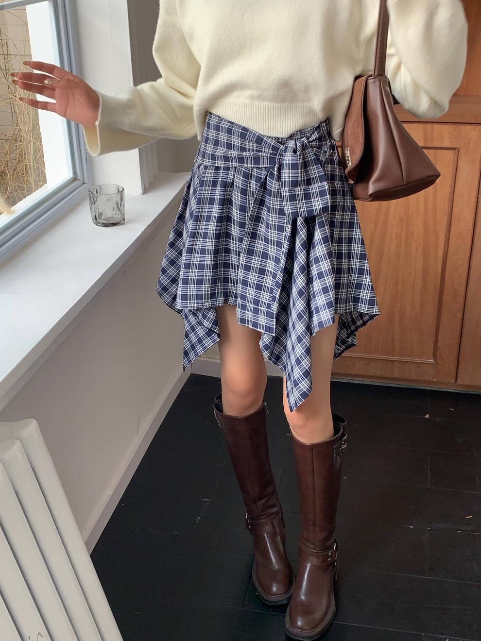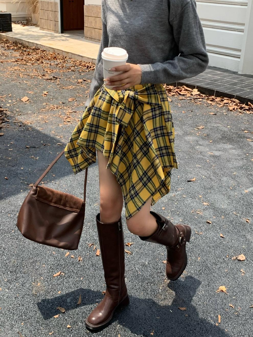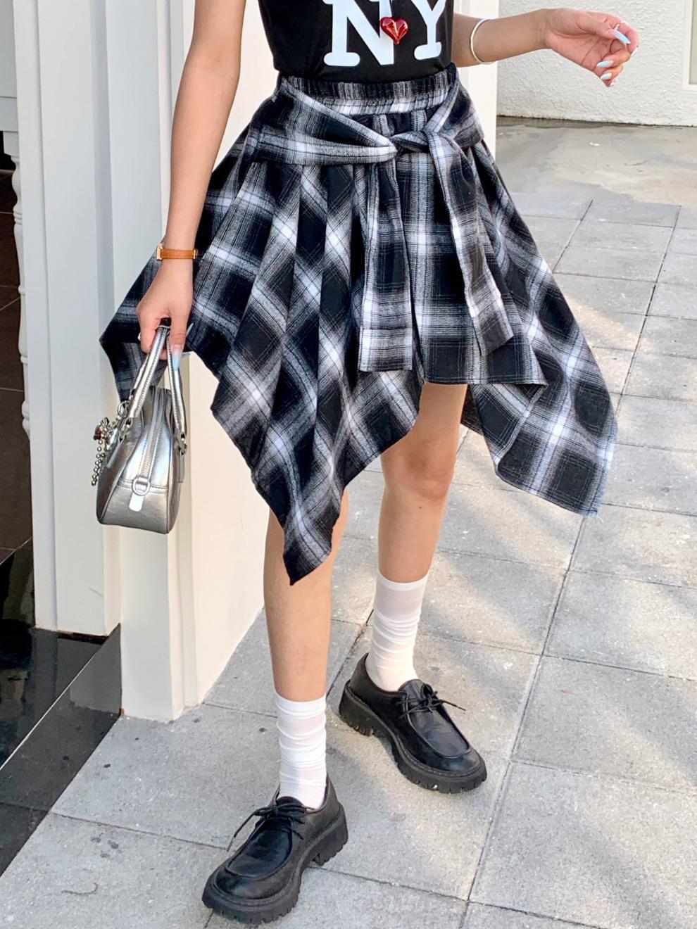 2024 년 가을 새로운 도착 불규칙한 격자 무늬 스커트 A 라인 느슨한 허리 격자 무늬 레이스 업 보우 슬리밍 올매치스토어 가기