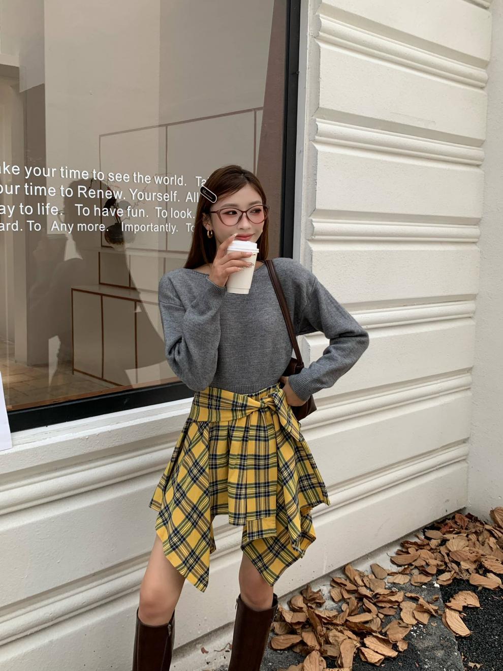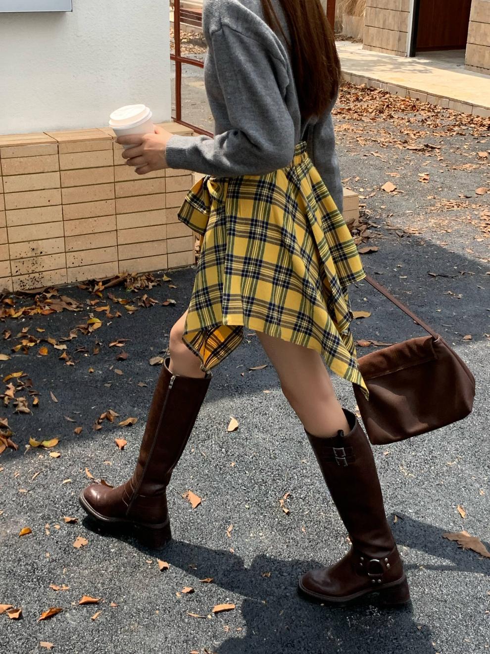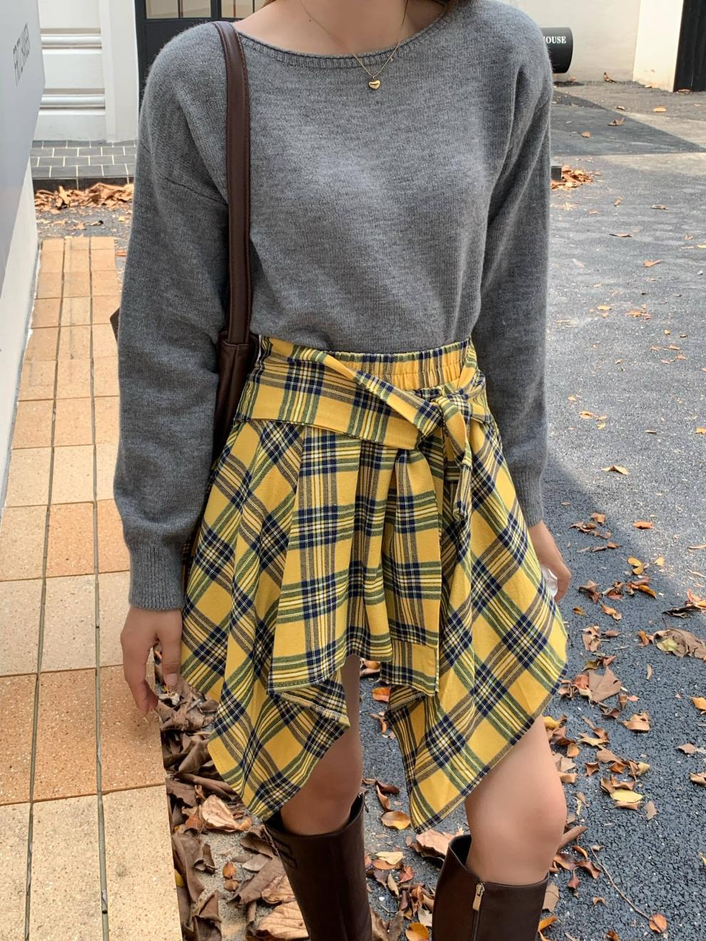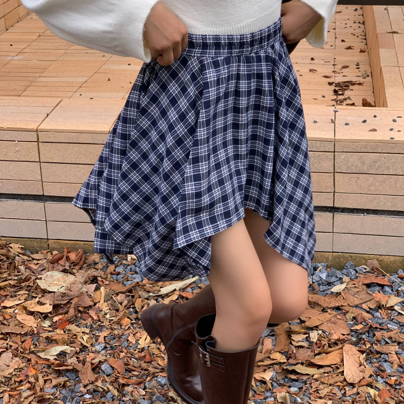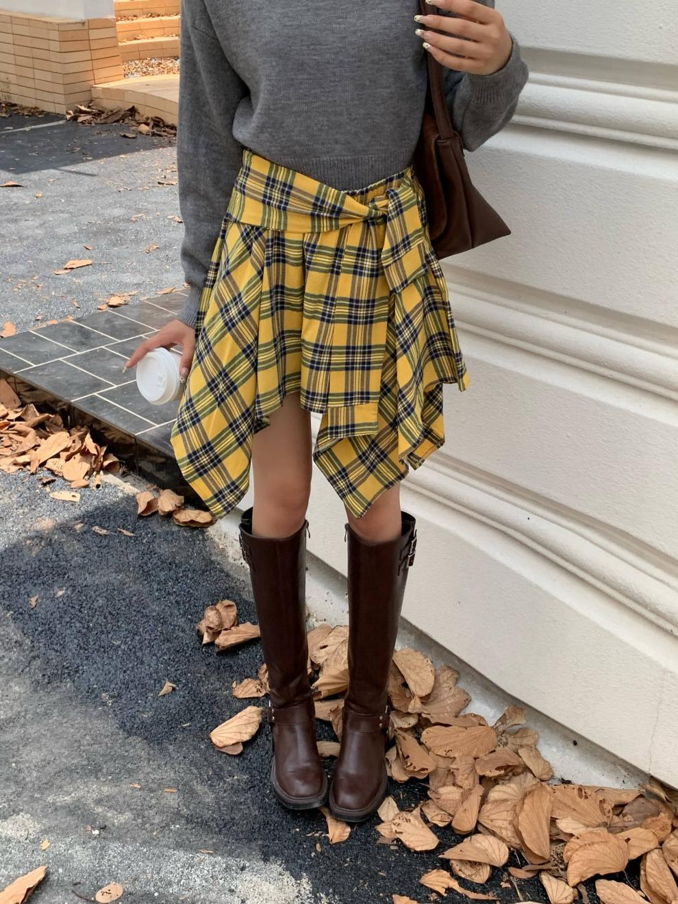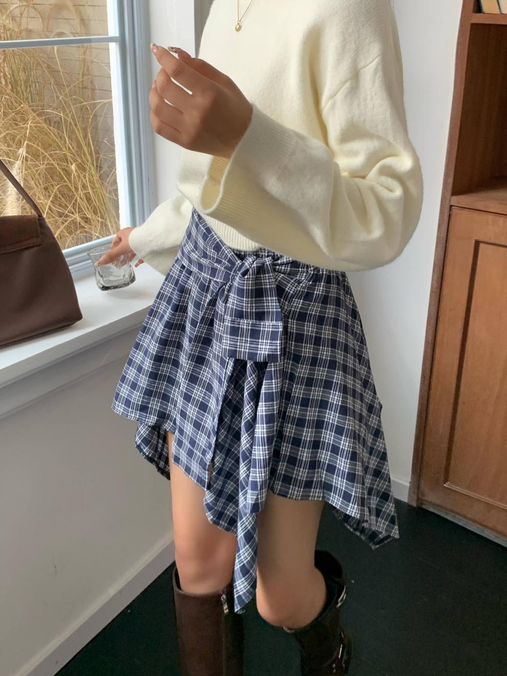 2024 년 가을 새로운 도착 불규칙한 격자 무늬 스커트 A 라인 느슨한 허리 격자 무늬 레이스 업 보우 슬리밍 올매치스토어 가기