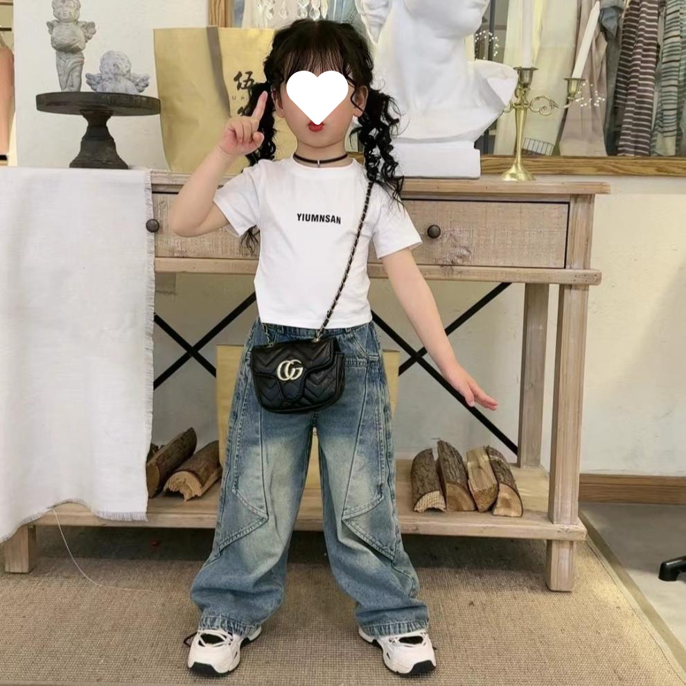어린이 여름 정장 2024 새로운 인터넷 연예인 소녀 반팔 유행 청바지 투피스 세트 소녀 여름 유행