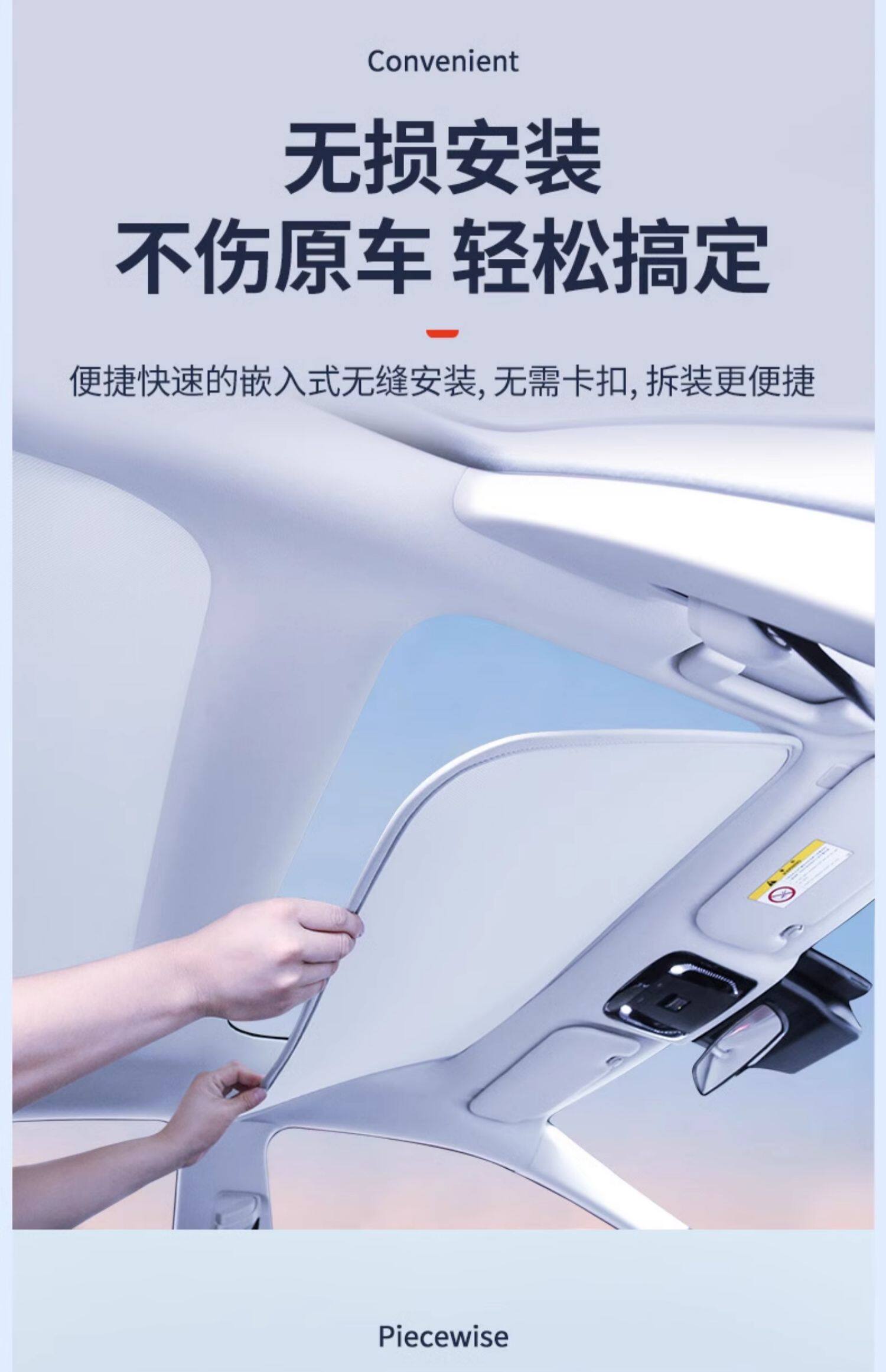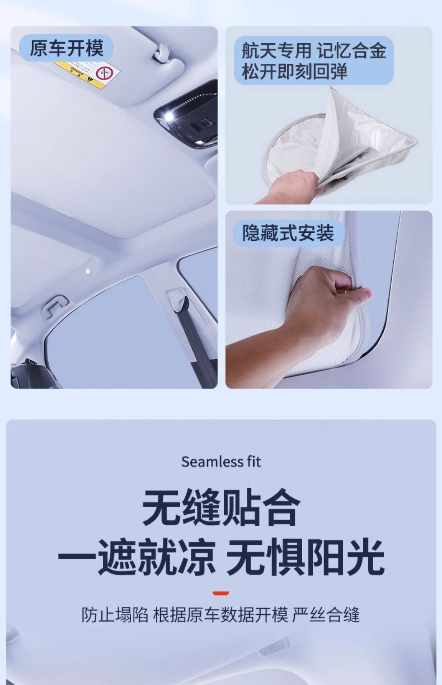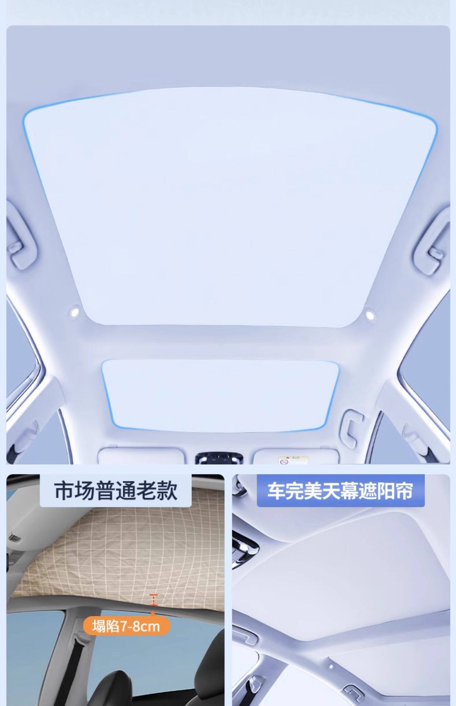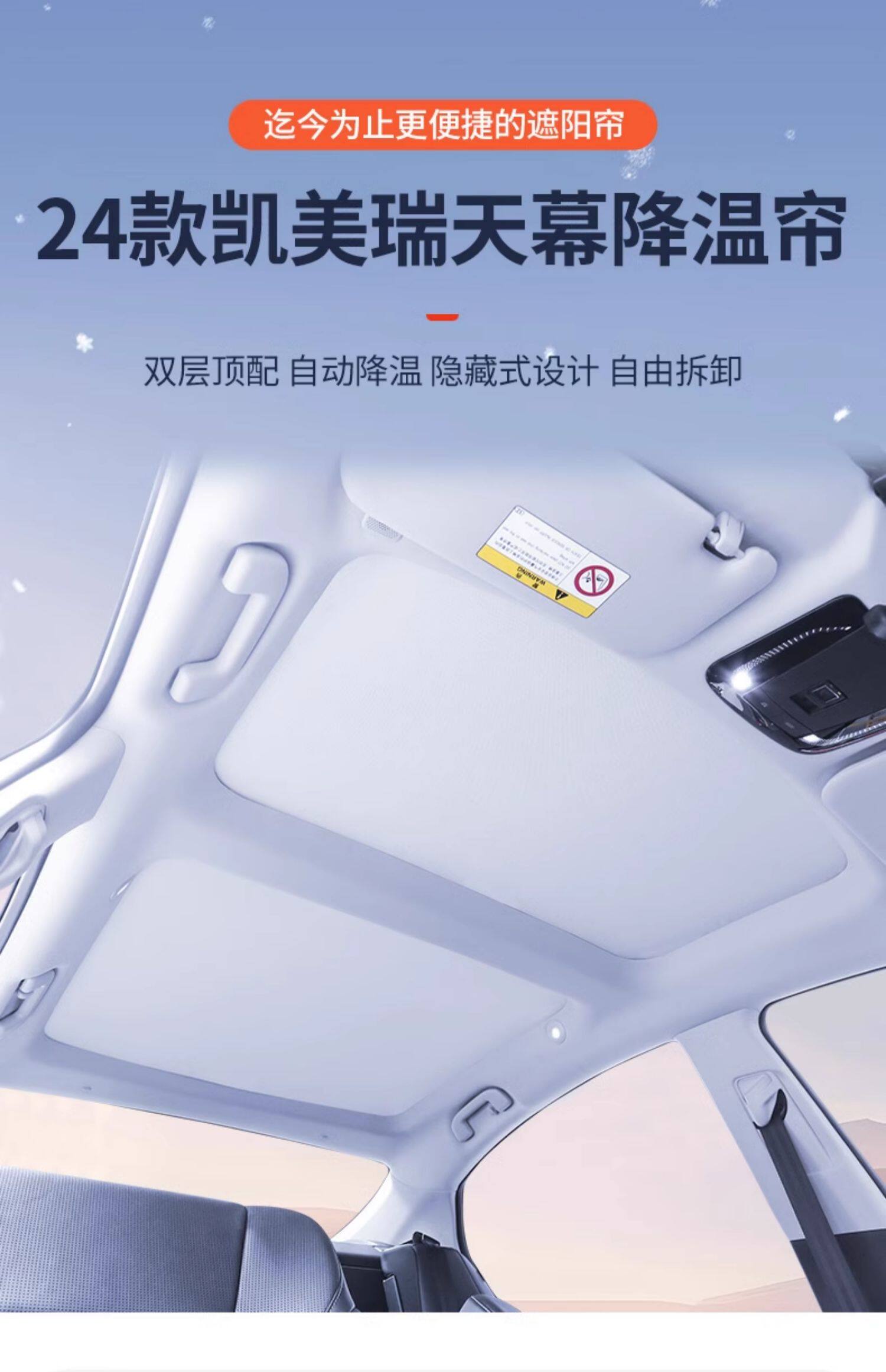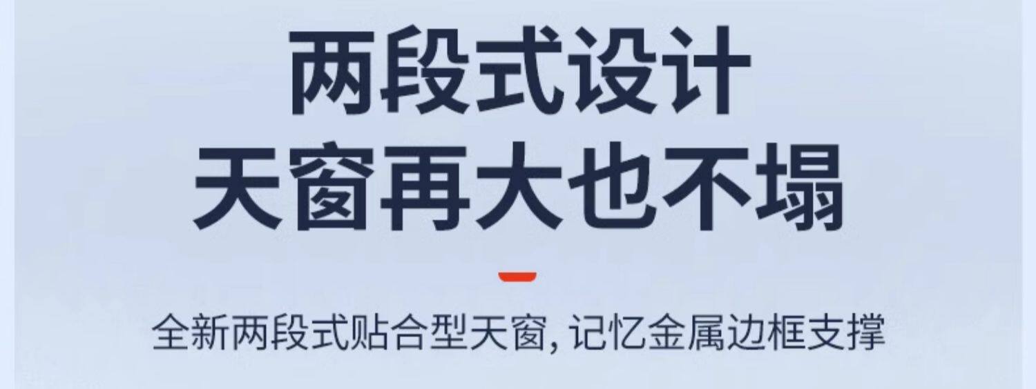 • 9세대 캠리 선쉐이드 프론트 루프는 6겹의 두꺼운 티타늄 실버 단열재를 사용하고 우산봉이 없어 대형 화면을 손상시키지 않으며 이음새가 없고 빛샘 현상이 없습니다.