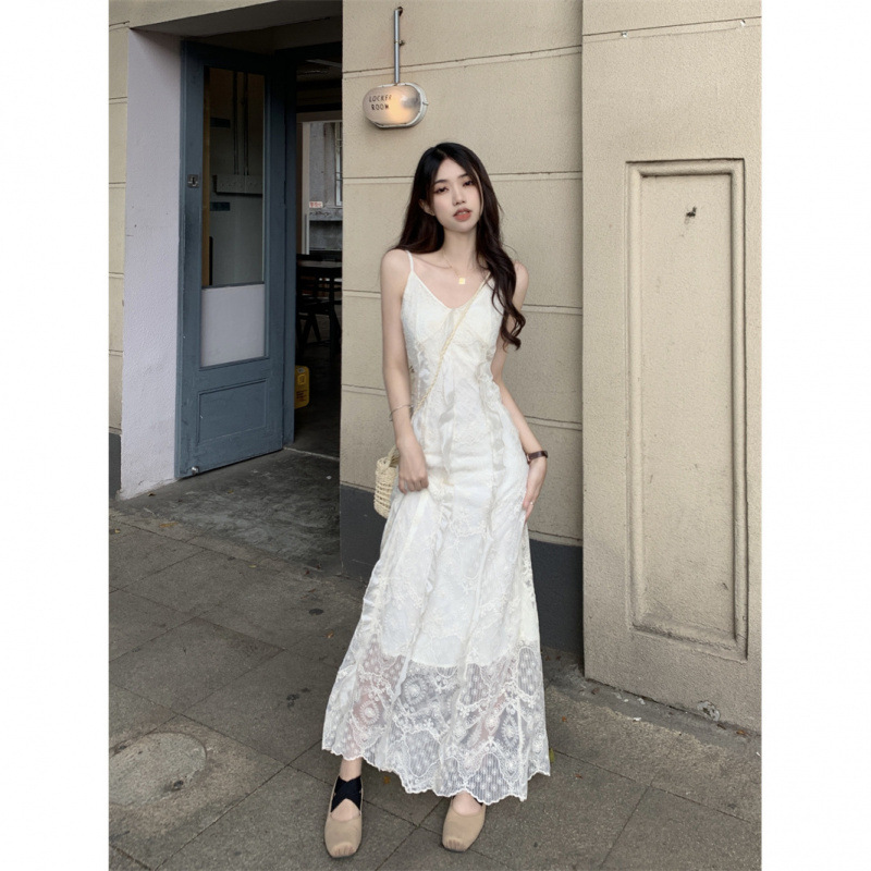젠틀 스타일 할로우 아웃 크로 셰 슬링 원피스 여성 여름 2025 새로운 중간 길이 웨이스트 슬리밍 우아한 스커트