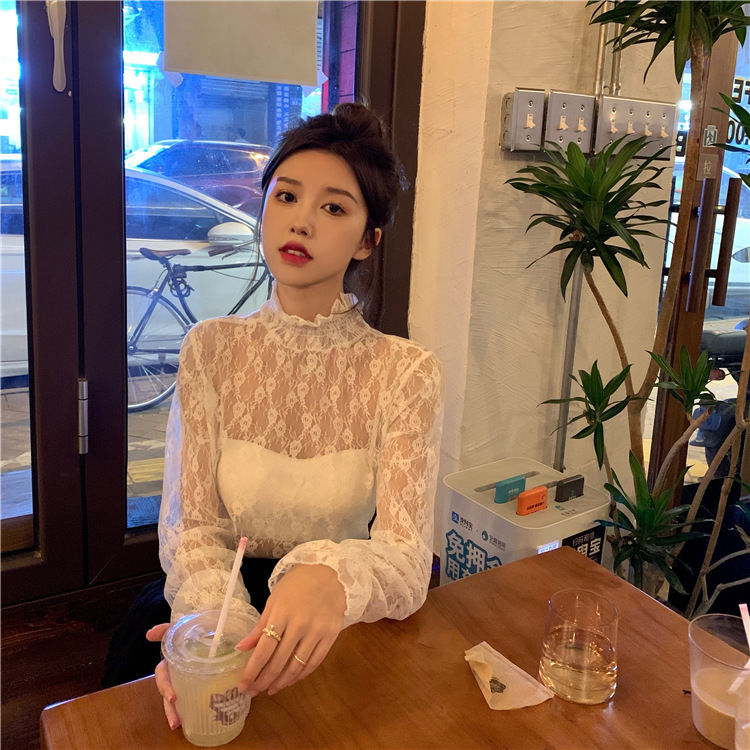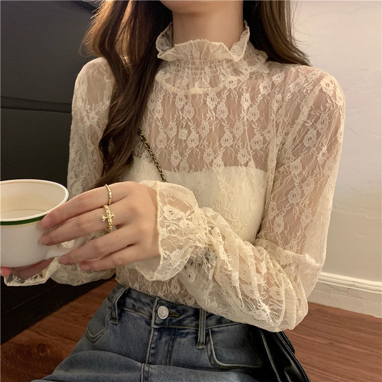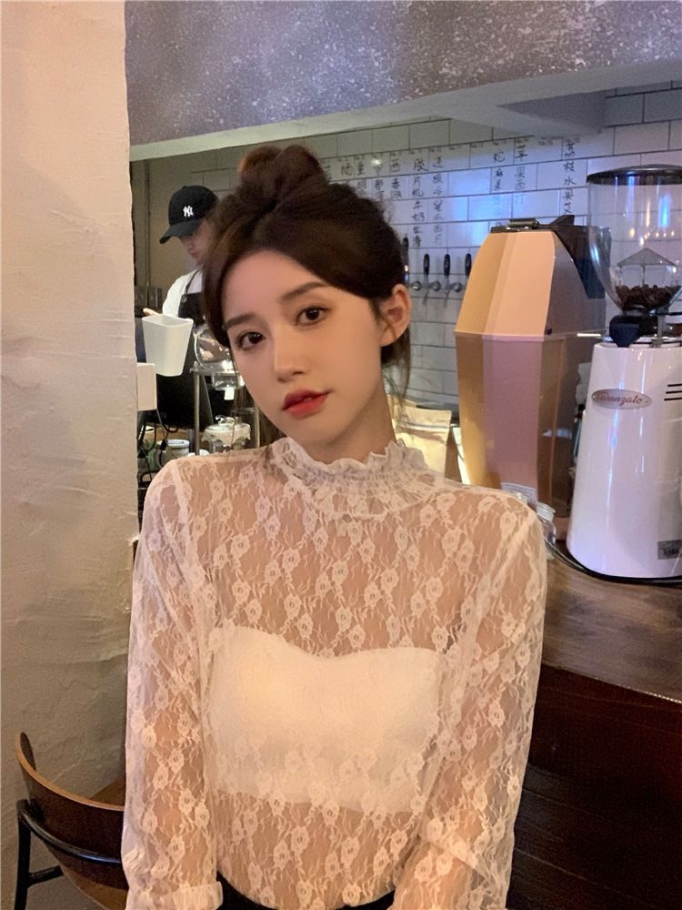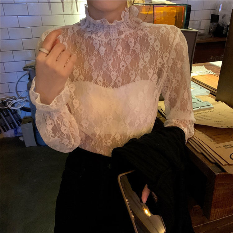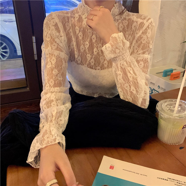 여름 섹시 아우터 슬리밍 긴팔 탑 여성용 분위기 순수한 욕망 스타일 약간 반투명한 매력 요정 쉬폰 레이스 셔츠스토어 가기