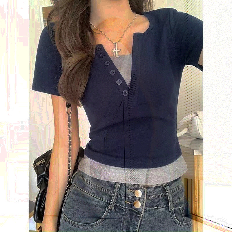 한국 스타일 가짜 투피스 버튼 반팔 셔츠 여성 여름 디자인 센스 핫 걸스 세련된 슬림 핏 슬리밍 쇼트 탑 트렌디