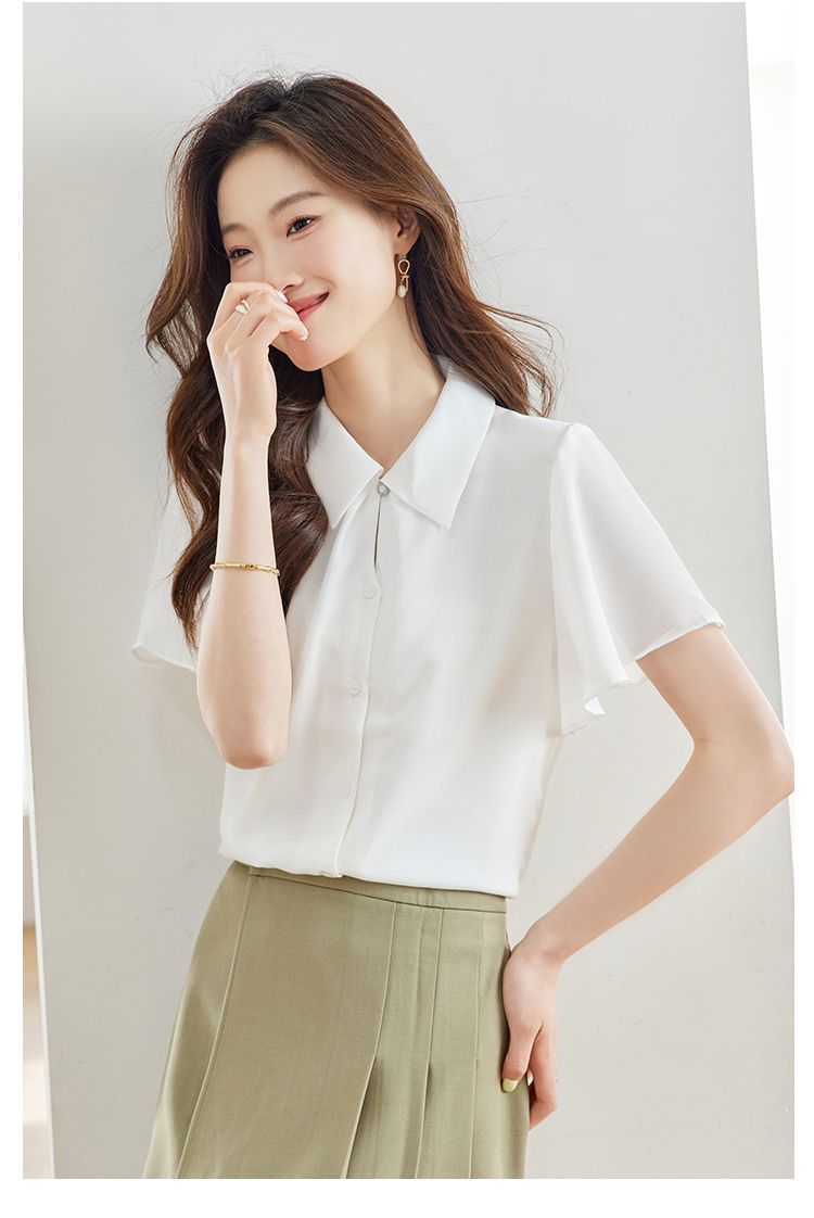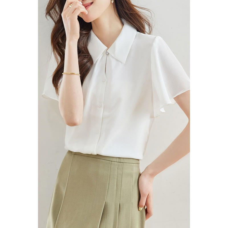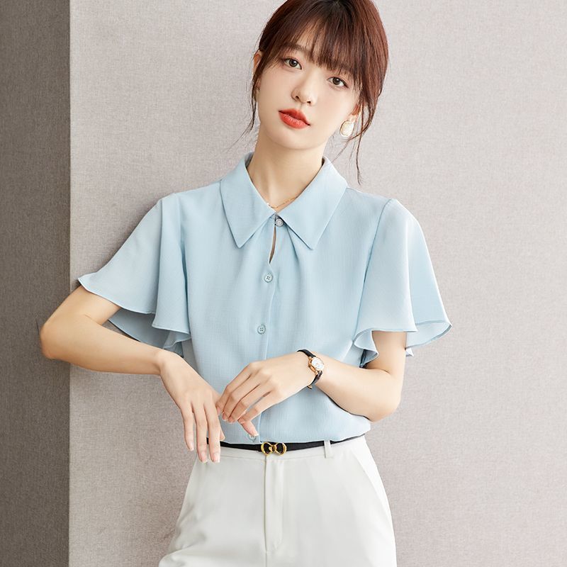 프랑스 연꽃 소매 블루 쉬폰 반팔 셔츠 여자 2024 년 여름 새로운 루즈 셔츠 고급 탑스토어 가기