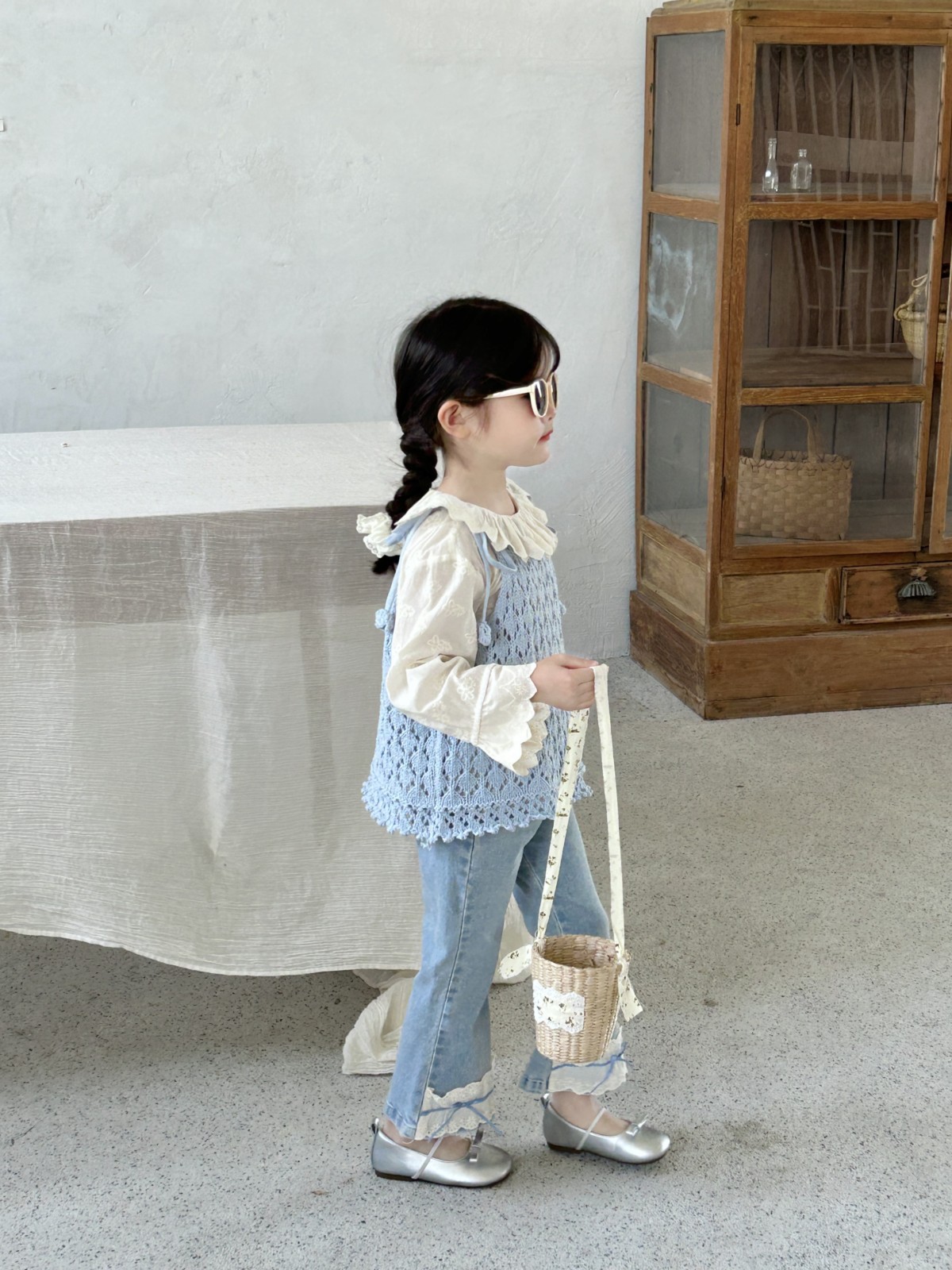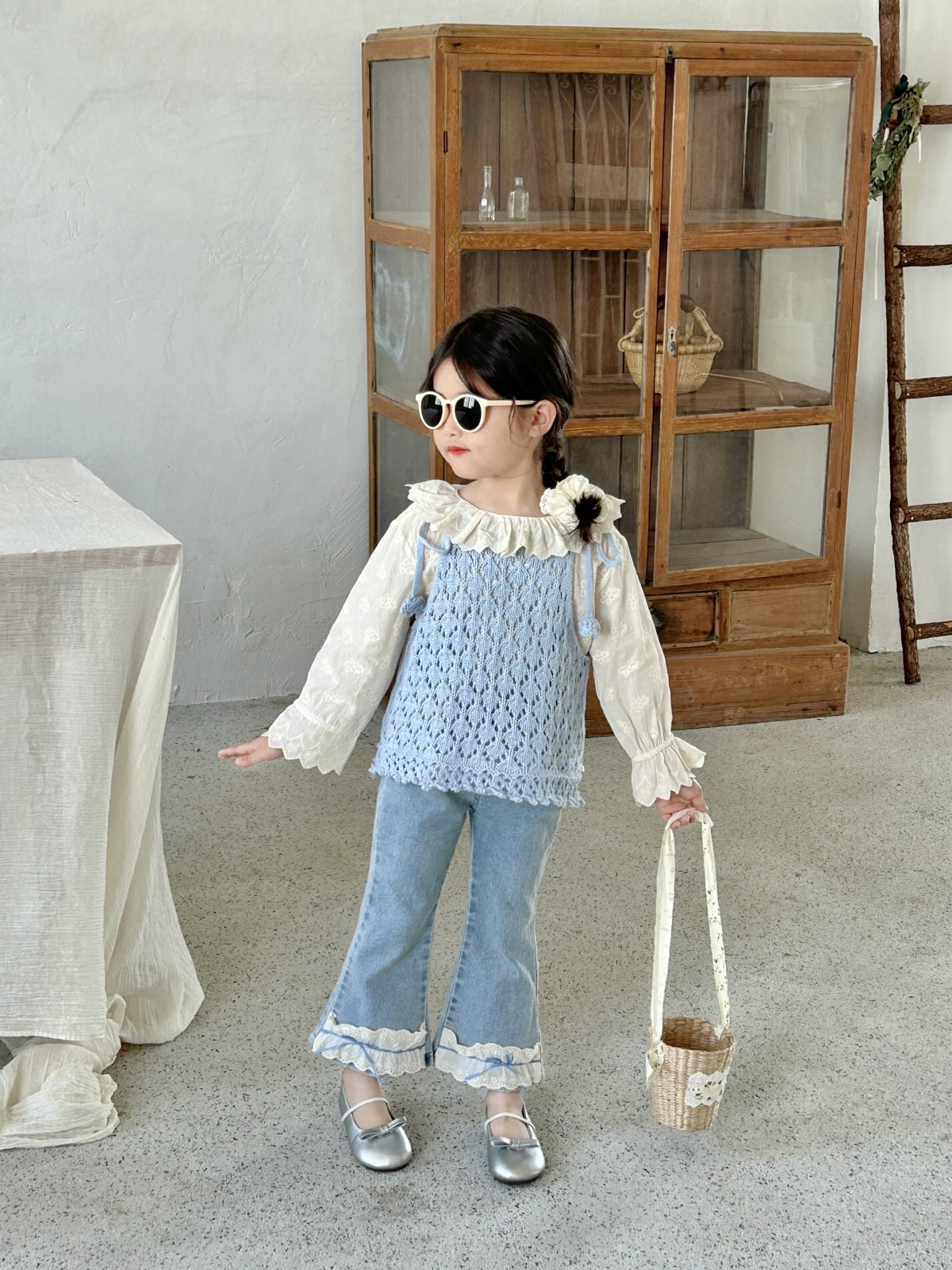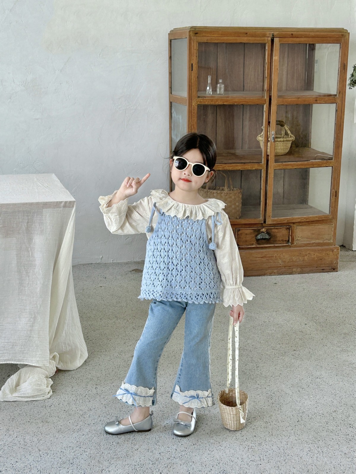 여자 세트 2025 봄 새로운 한국 아기 크로 셰 뜨개질 빈 조끼 청바지 셔츠 세트