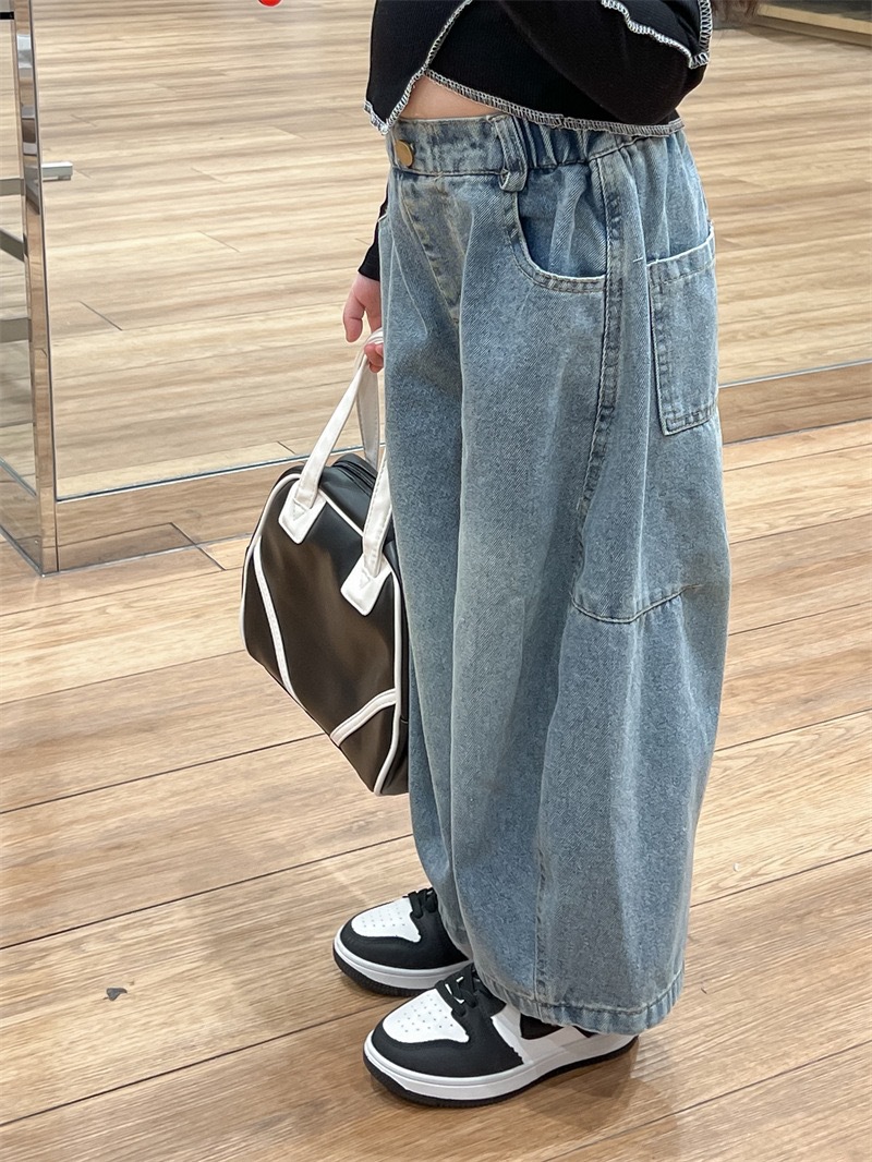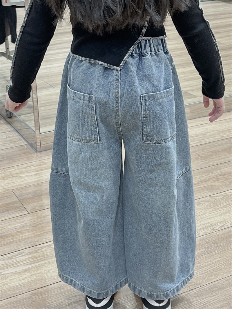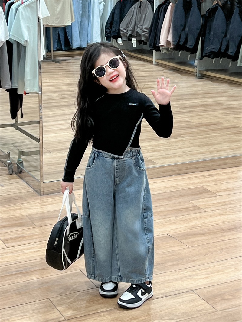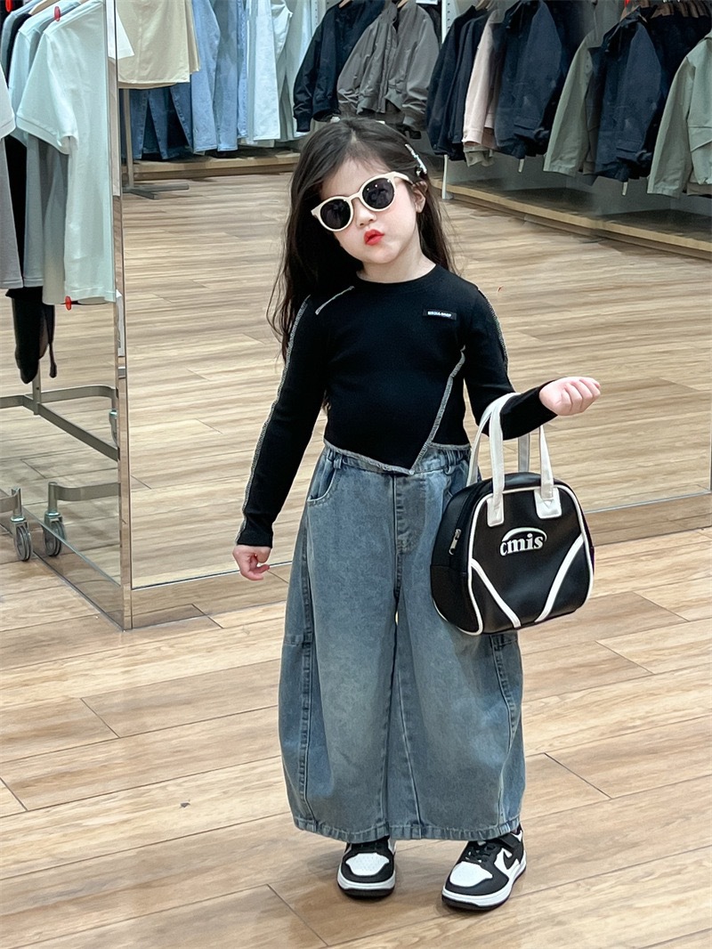 2025 소녀의 봄 원피스 슬림 핏 패셔너블 블랙 슬랜트 컷 불규칙한 짧은 티셔츠 대형 와이드 다리 청바지 분할스토어 가기