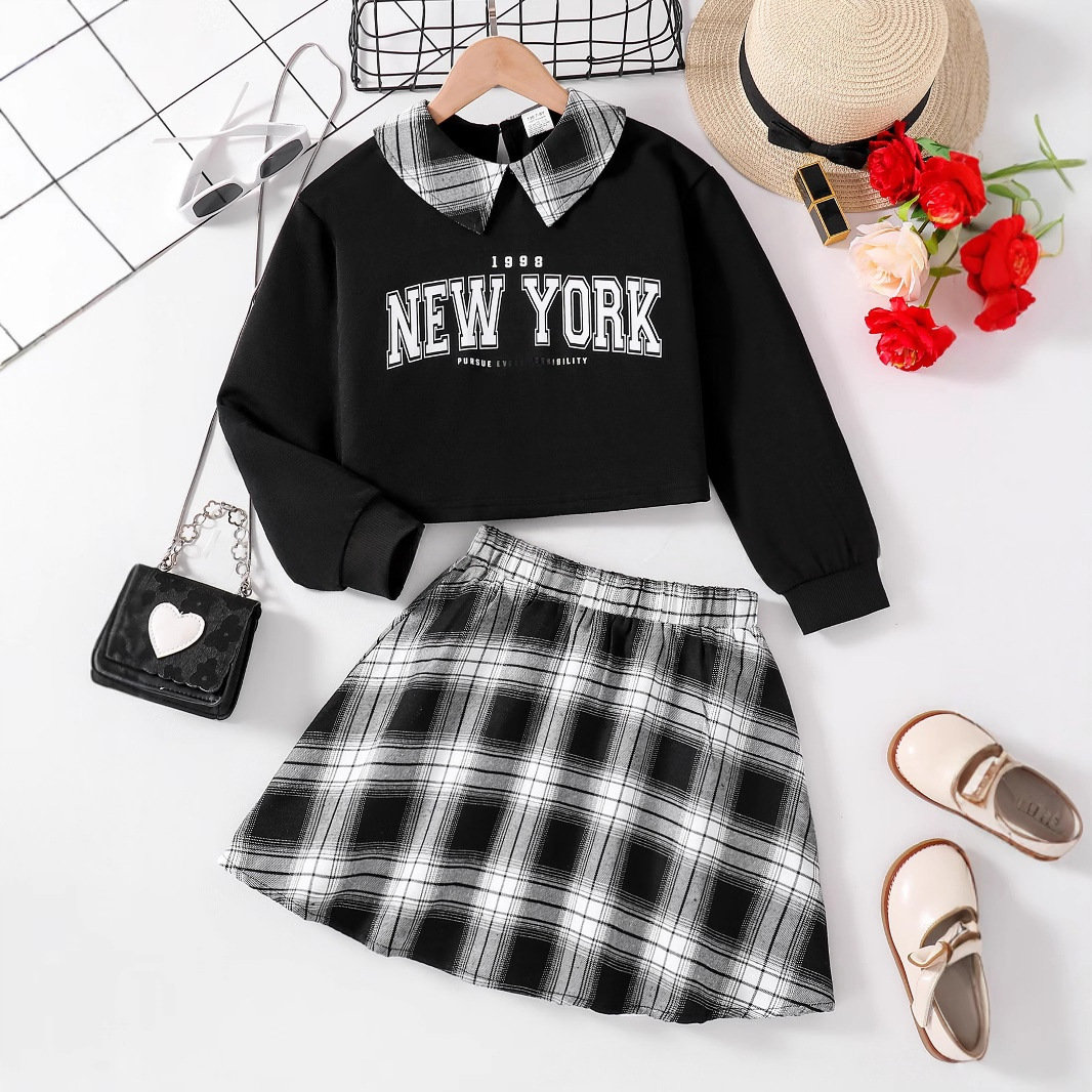 쇼피 중대형 아동 여아용 레터링 긴팔 스웨트셔츠 체크 플리츠 스커트 세트 아동 플리츠 스커트스토어 가기