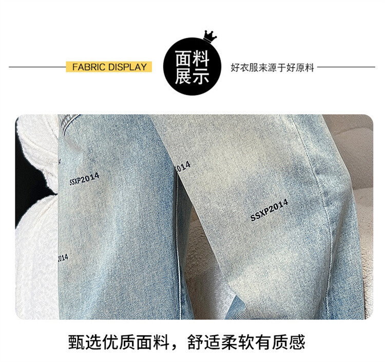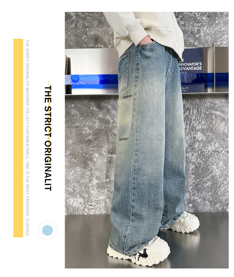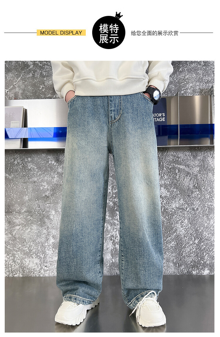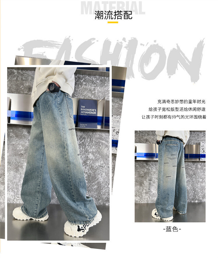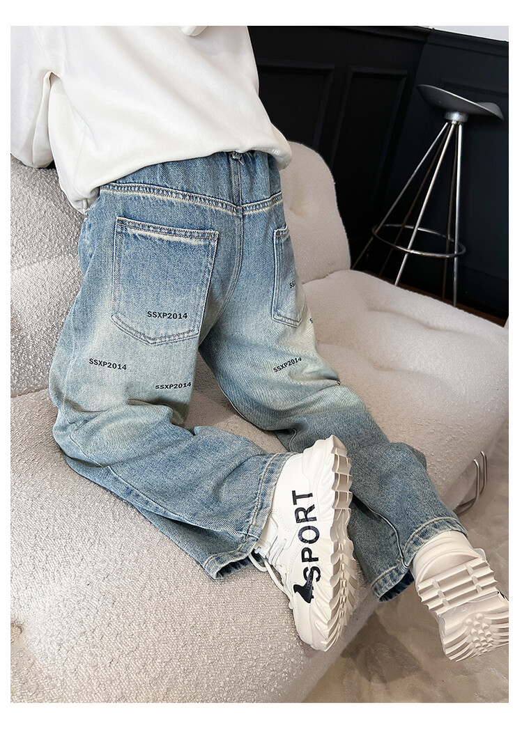 중대형 아동 및 학생 버전을 위한 크로스보더 도매 소년의 세련되고 다재다능한 프린트 데님 스트레이트 팬츠 캐주얼 아우터웨어 와이드 팬츠스토어 가기