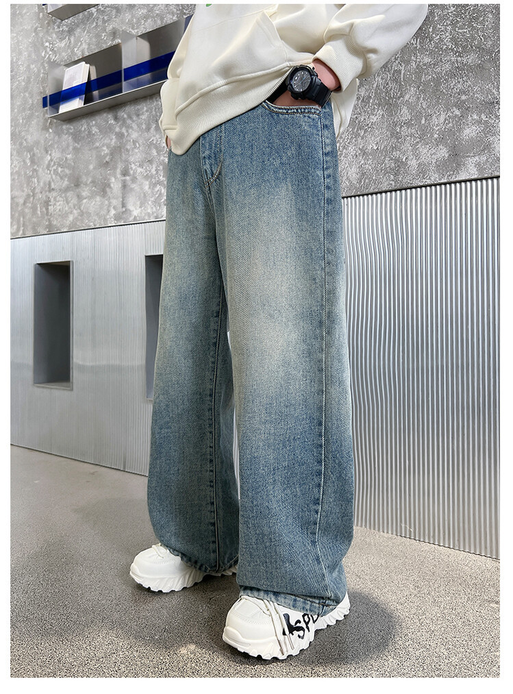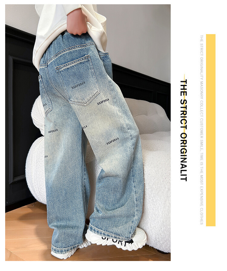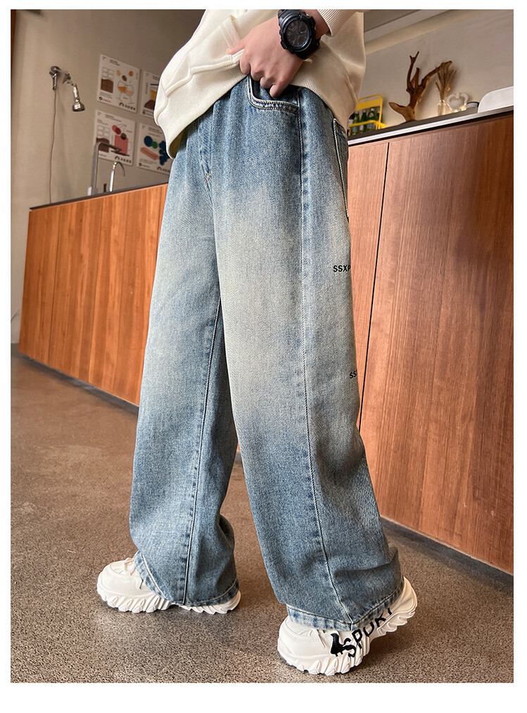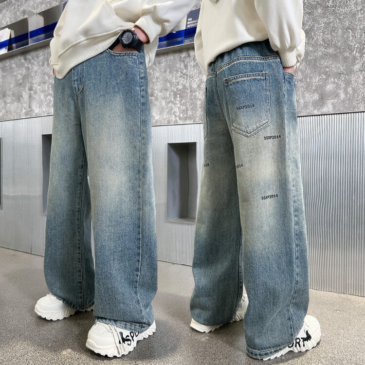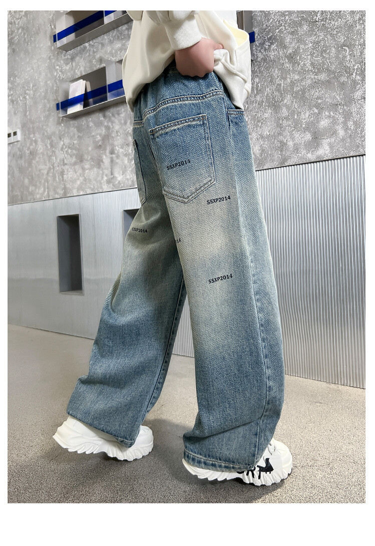 중대형 아동 및 학생 버전을 위한 크로스보더 도매 소년의 세련되고 다재다능한 프린트 데님 스트레이트 팬츠 캐주얼 아우터웨어 와이드 팬츠