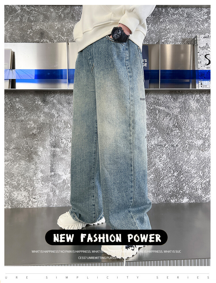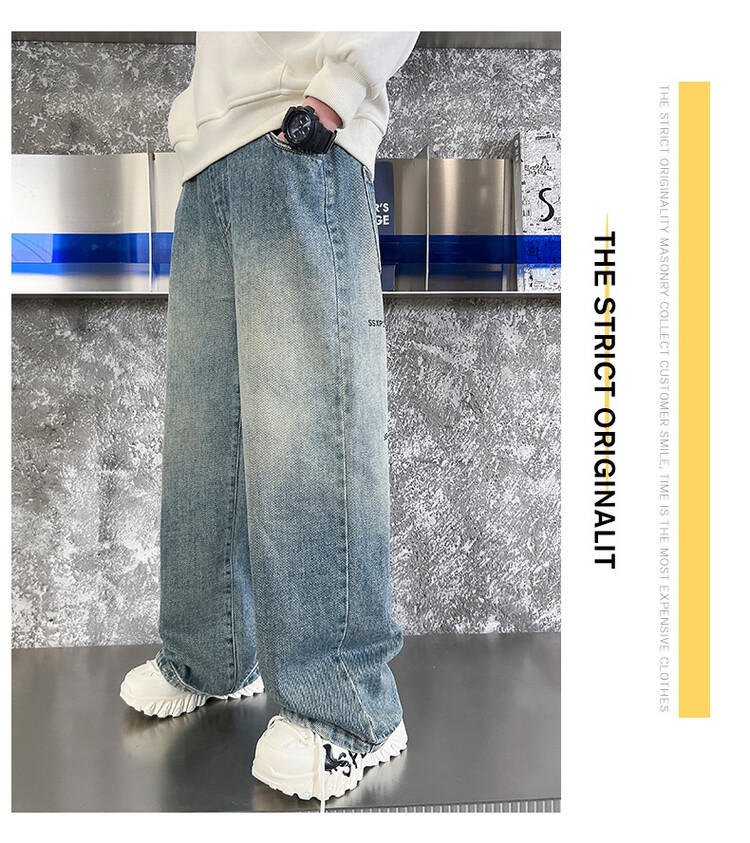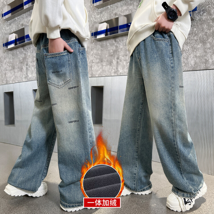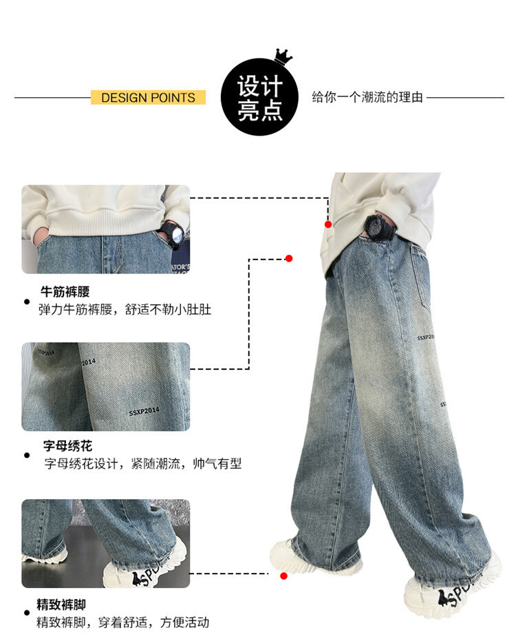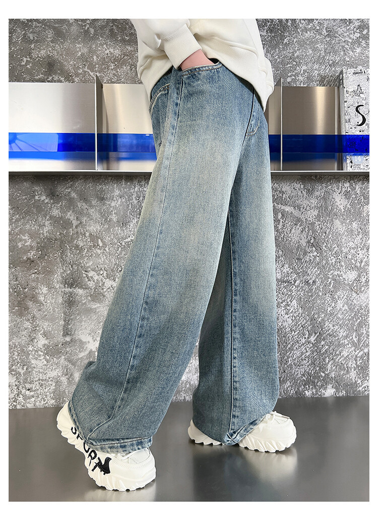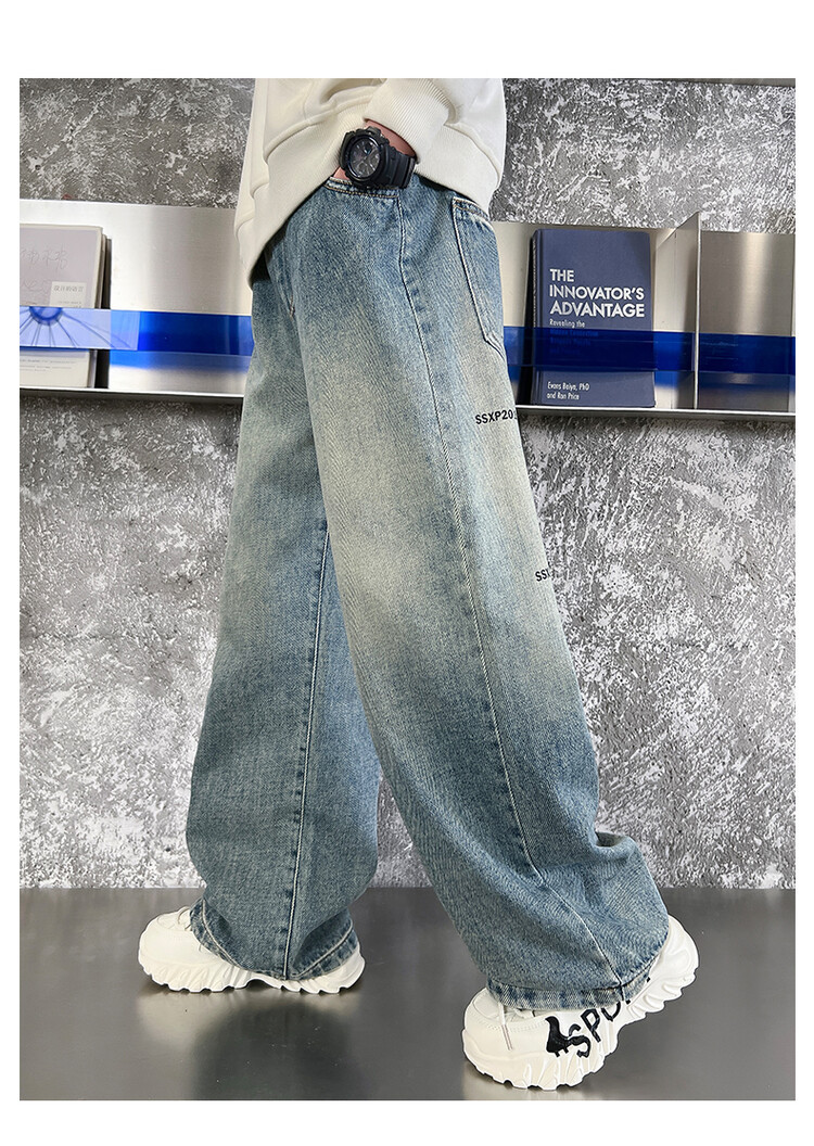 중대형 아동 및 학생 버전을 위한 크로스보더 도매 소년의 세련되고 다재다능한 프린트 데님 스트레이트 팬츠 캐주얼 아우터웨어 와이드 팬츠