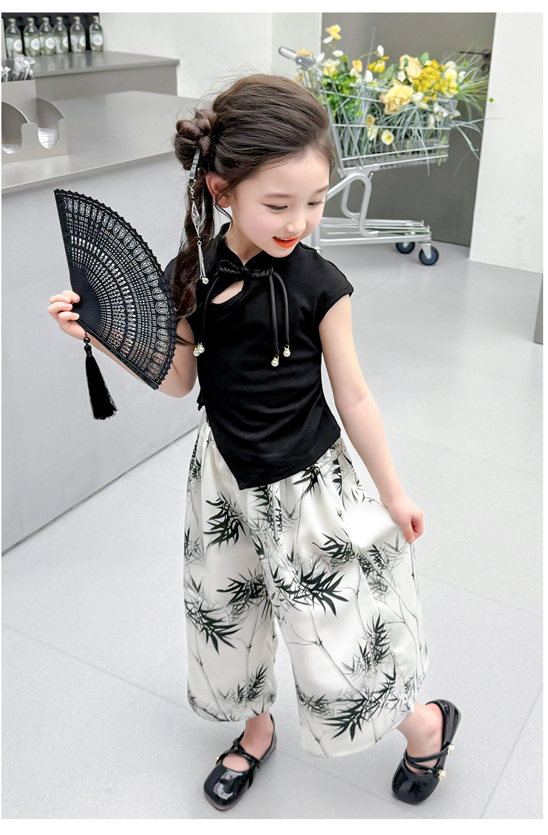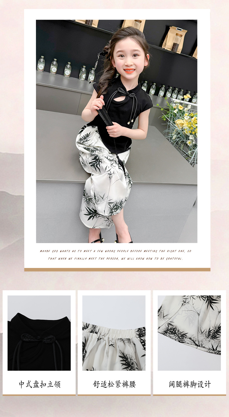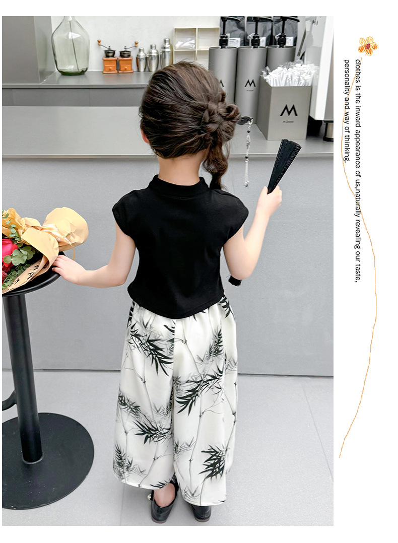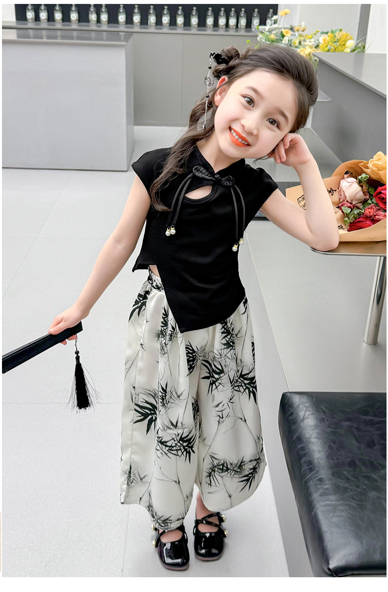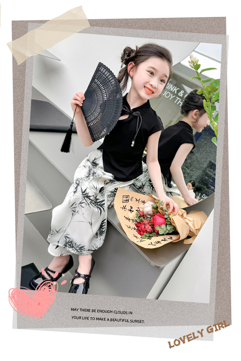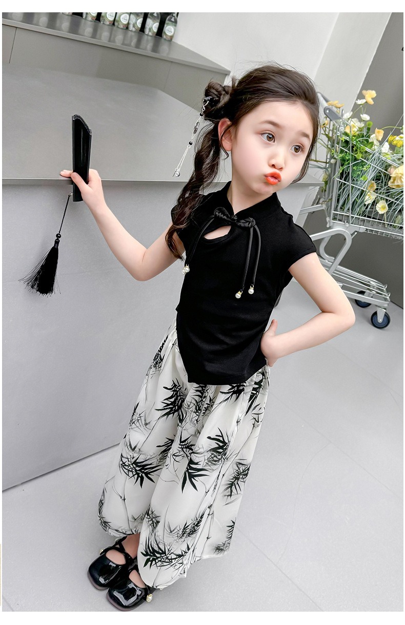 아기 소녀 여름 새로운 중국 스타일 정장 패션 서양식 중국 스타일 짧은 소매 느슨한 넓은 다리 바지 소녀스토어 가기