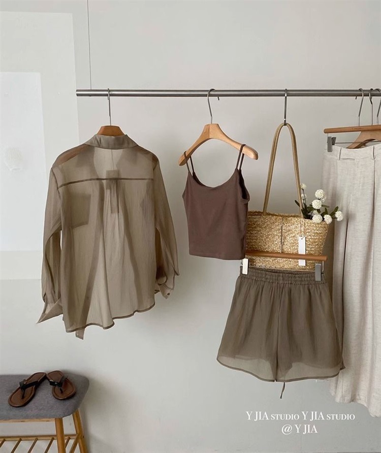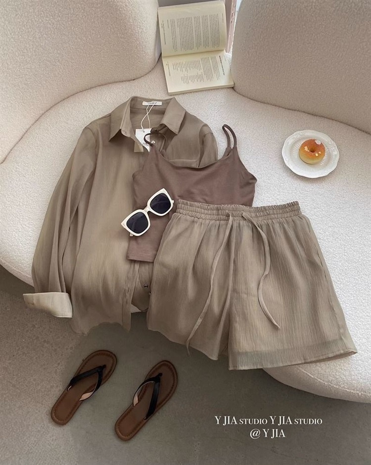 2025 여름 얇은 선 스크린 셔츠 탑 슬림 카미 솔 루즈 올 매치 반바지 여자 3 피스 세트스토어 가기