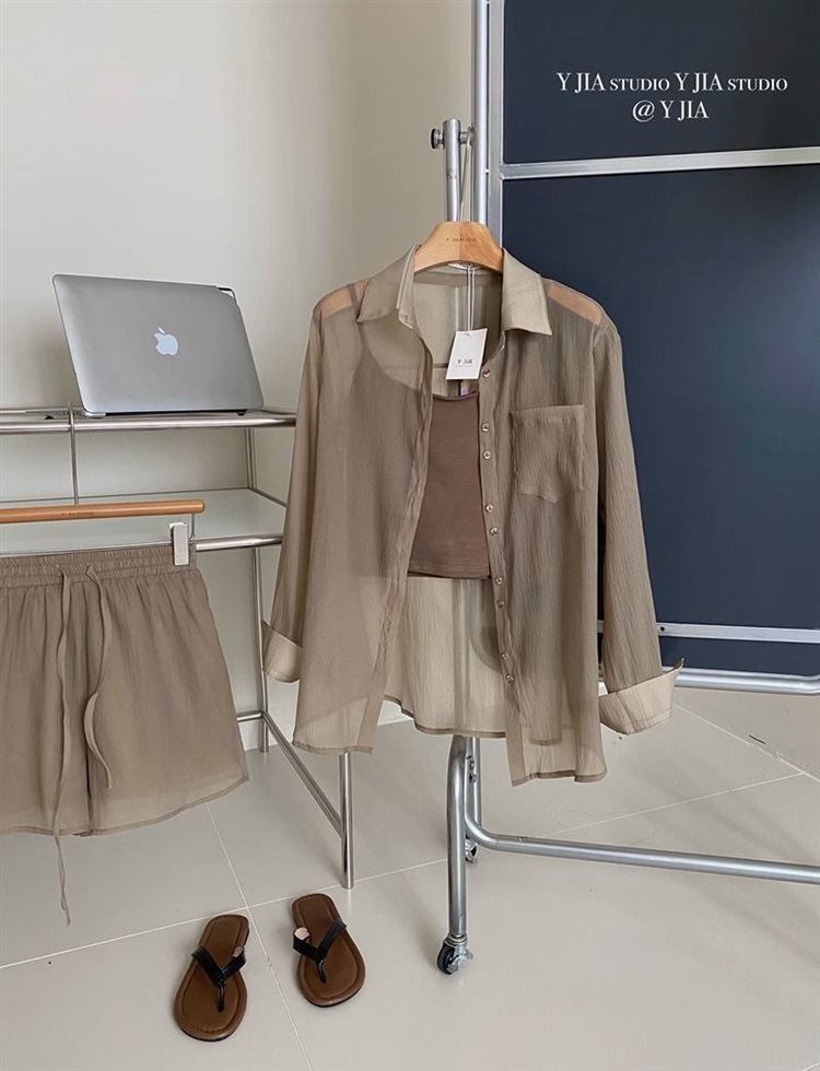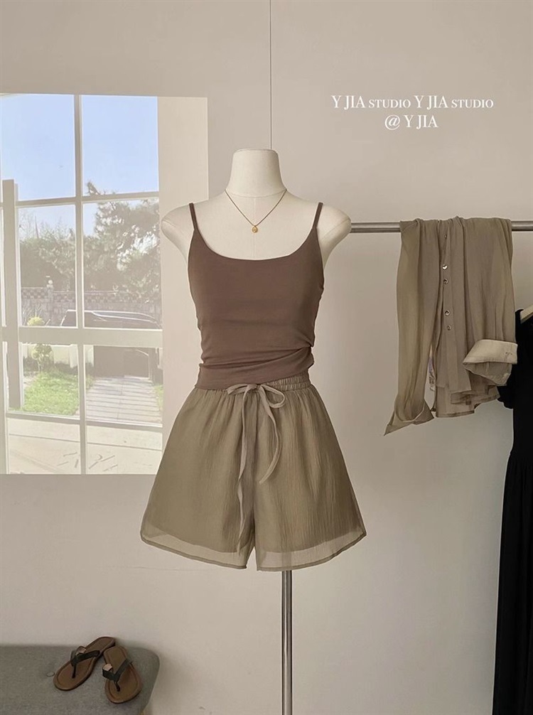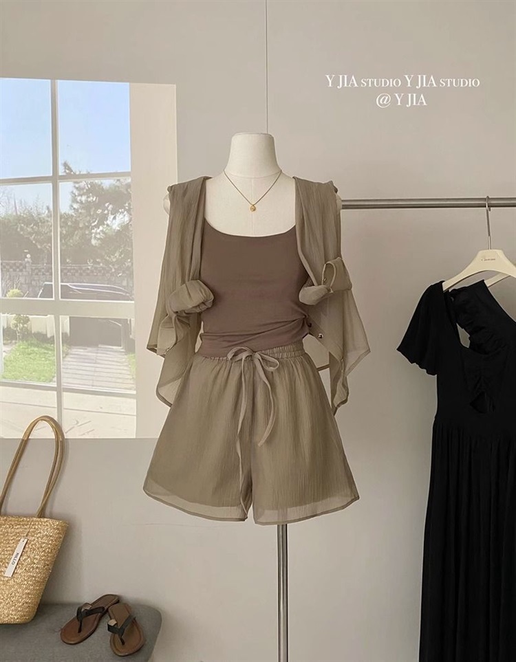2025 여름 얇은 선 스크린 셔츠 탑 슬림 카미 솔 루즈 올 매치 반바지 여자 3 피스 세트
