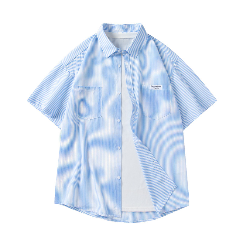 줄무늬 셔츠 반팔 남성 여름 일본 스타일 레트로 아메리칸 스타일 트렌디 라벨 느슨한 캐주얼 반팔 셔츠